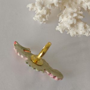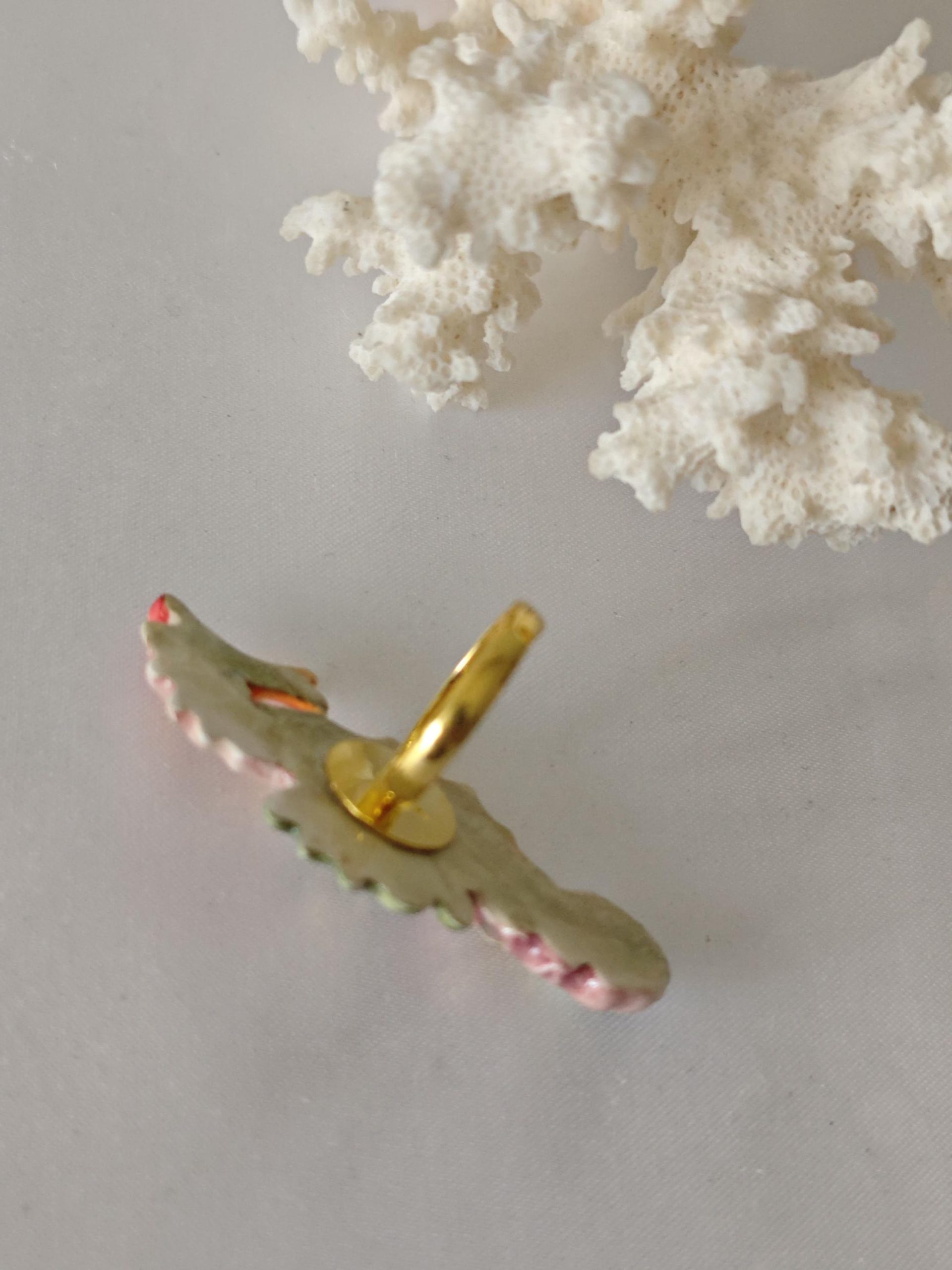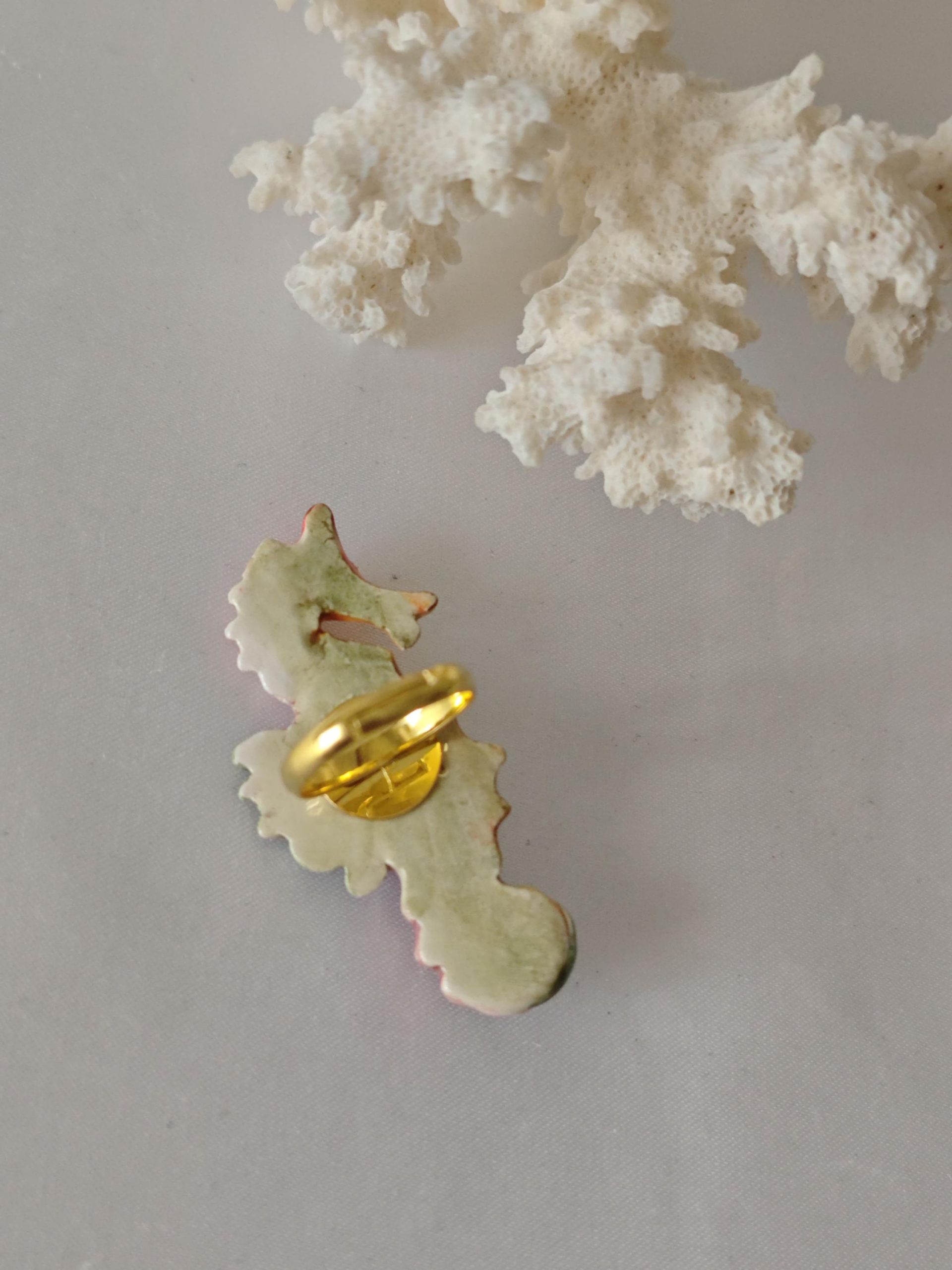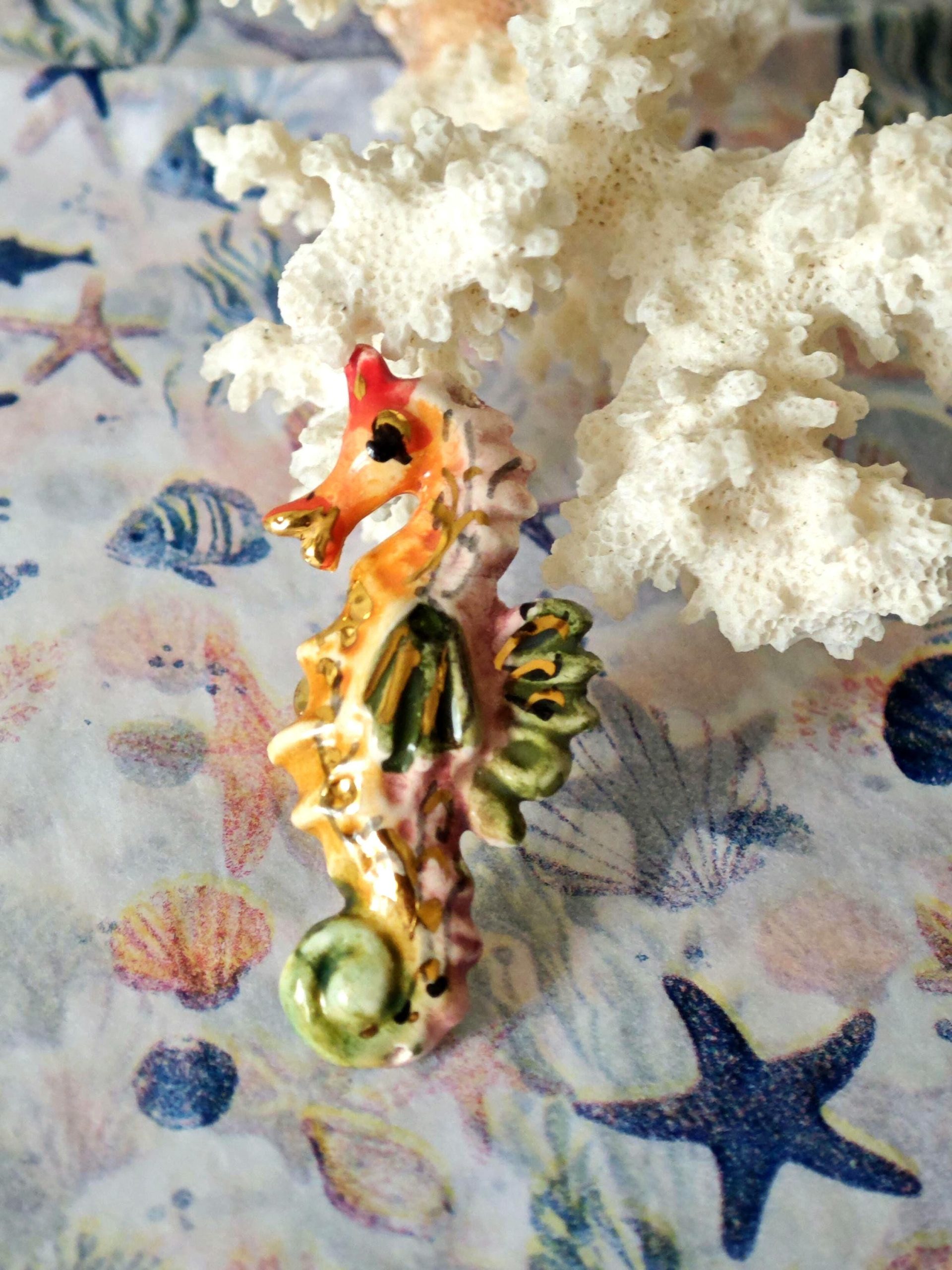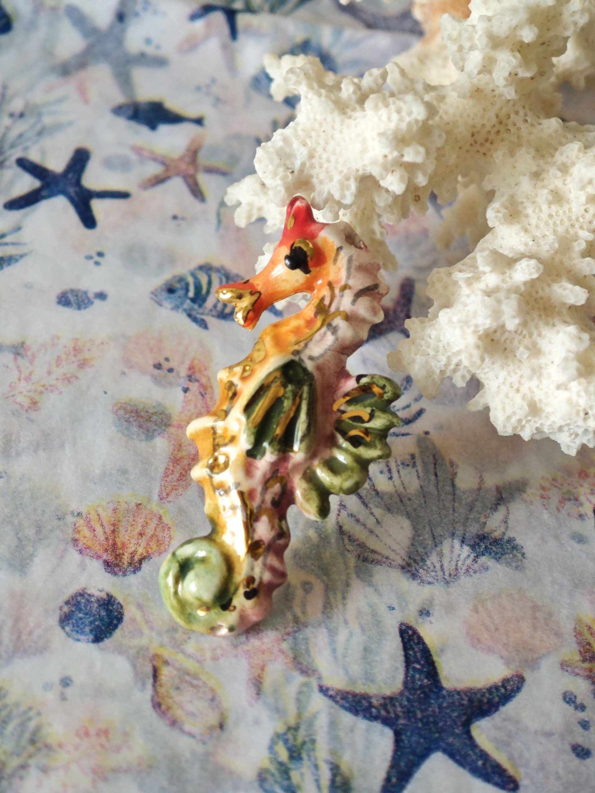 Anello in ottone con cavalluccio marino in ceramica di Caltagirone realizzata e dipinta a mano a mano, 5 cm dimensioni.