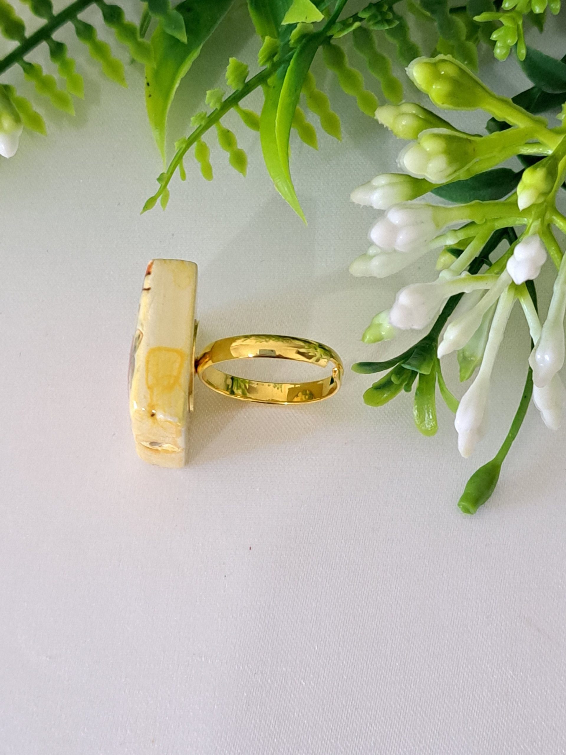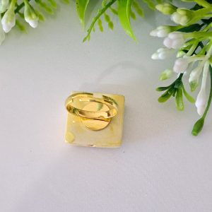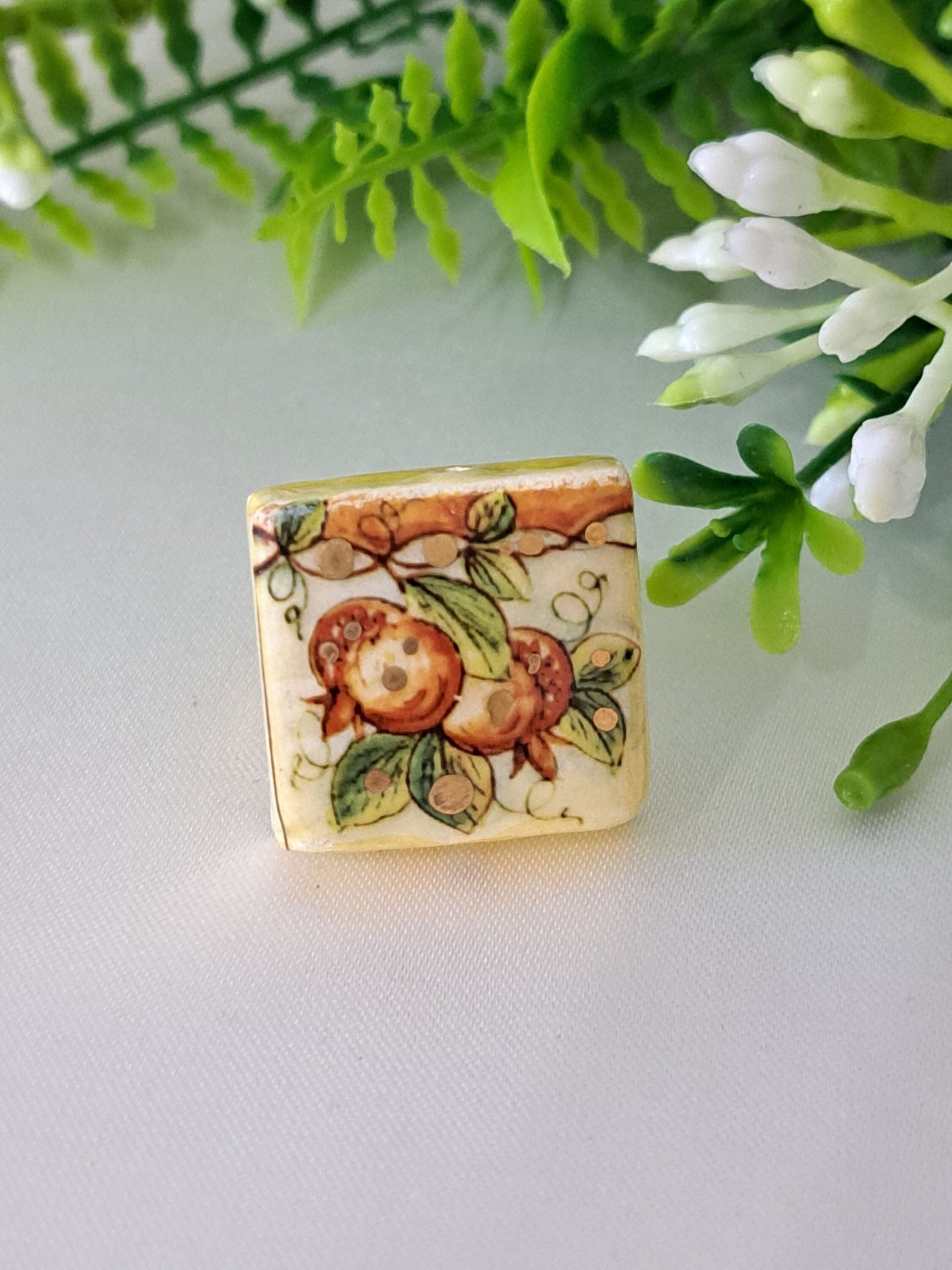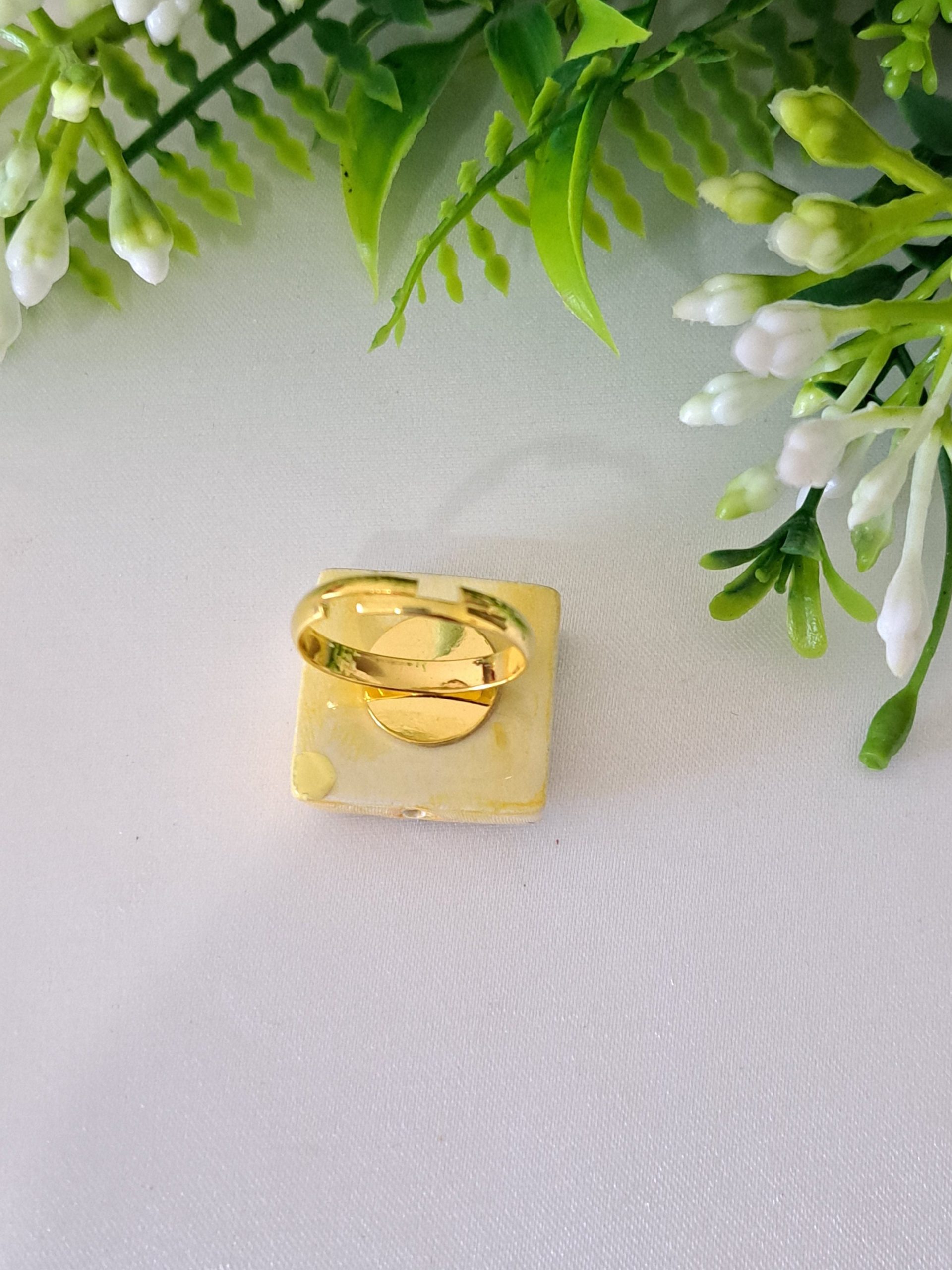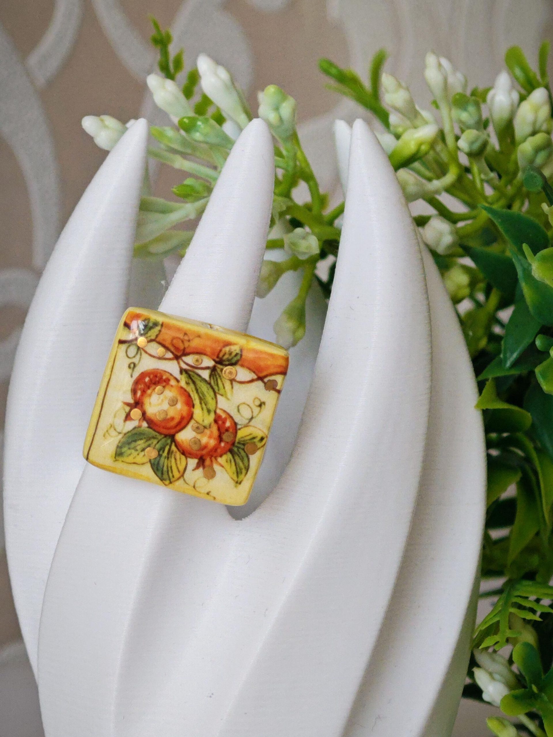 Anello in metallo dorato con piastrella in ceramica stampata con motivi Caltagirone realizzata a mano 2×2 cm dimensioni