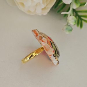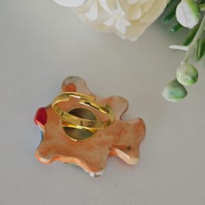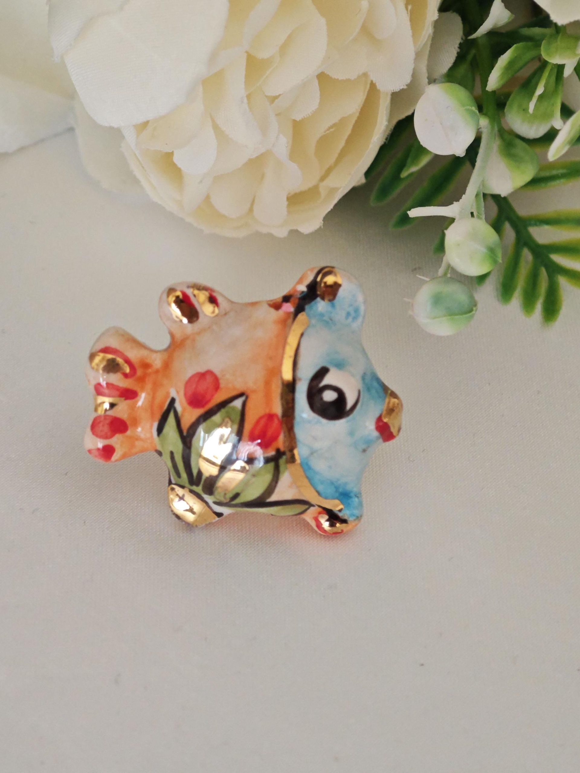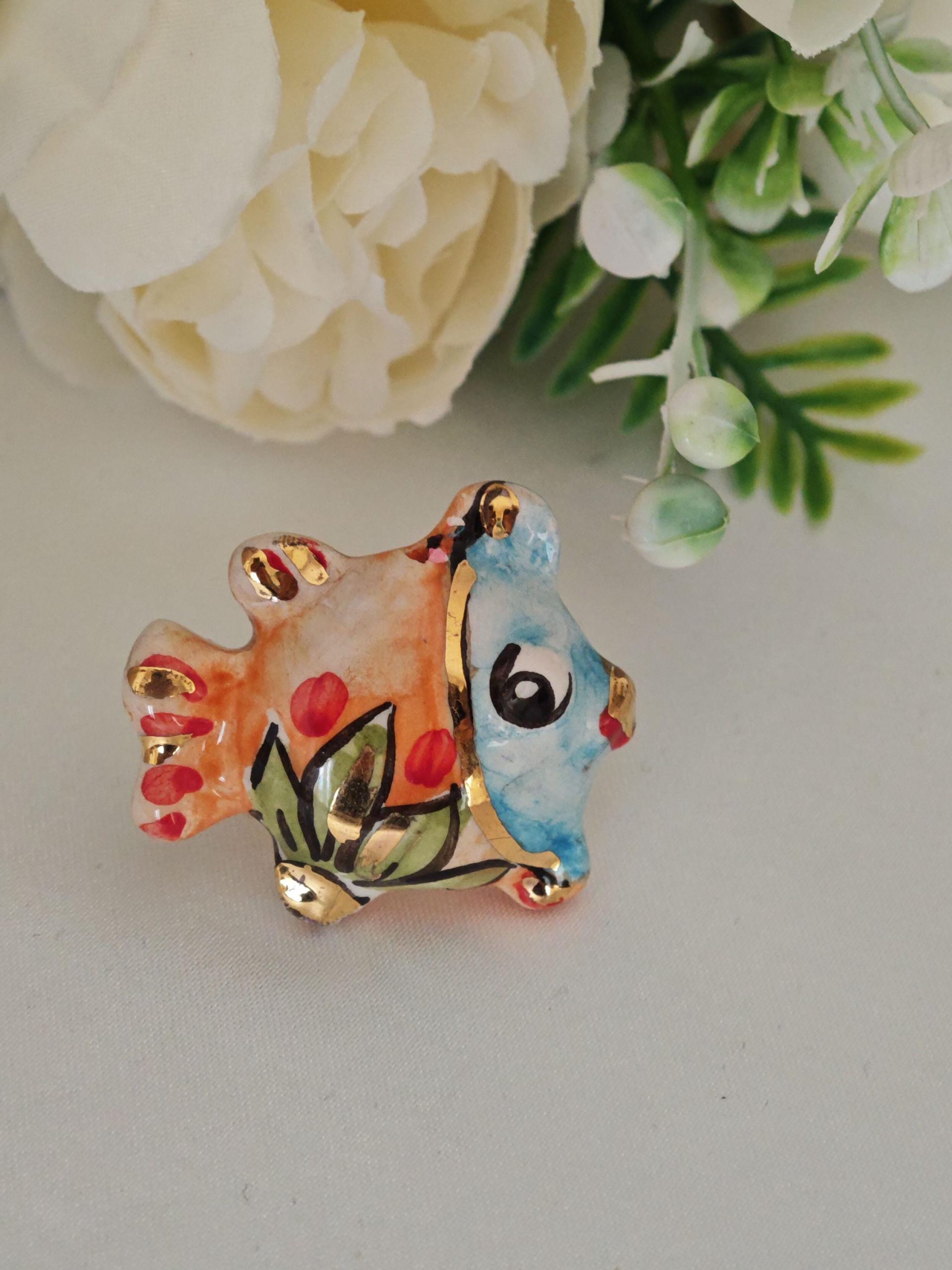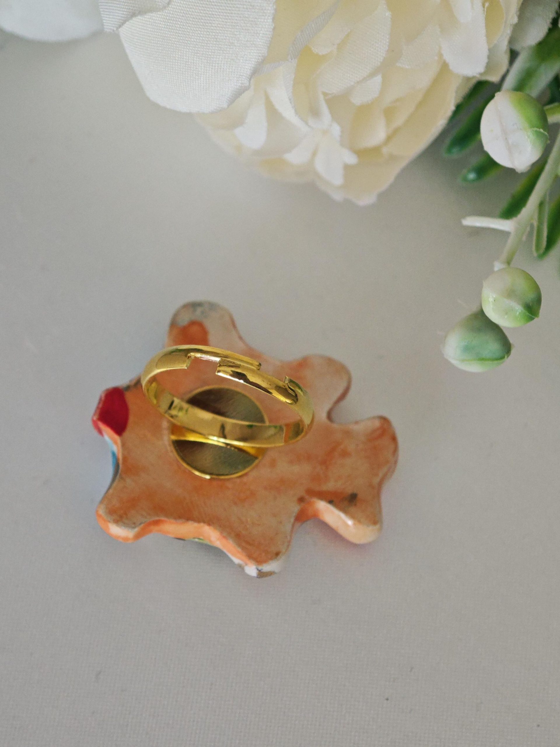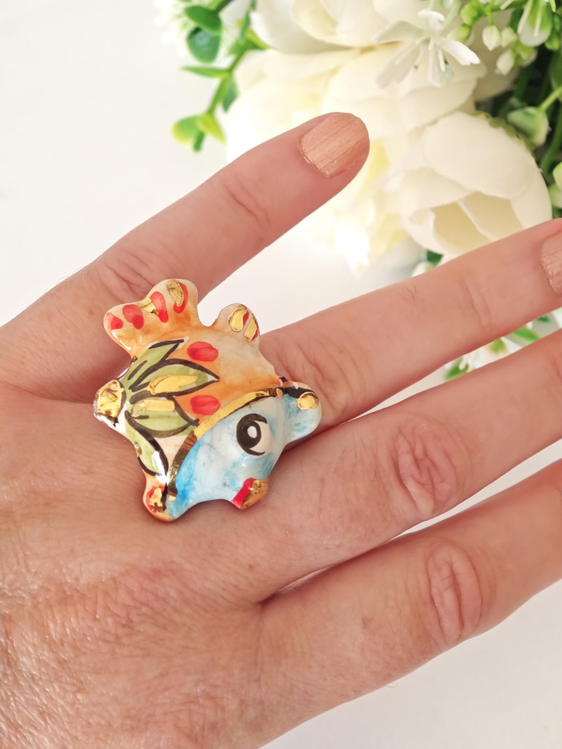 Anello artigianale con base in ottone dorato e con pesciolino in ceramica di Caltagirone realizzata e dipinta a mano a mano, 4×3 cm dimensioni .
