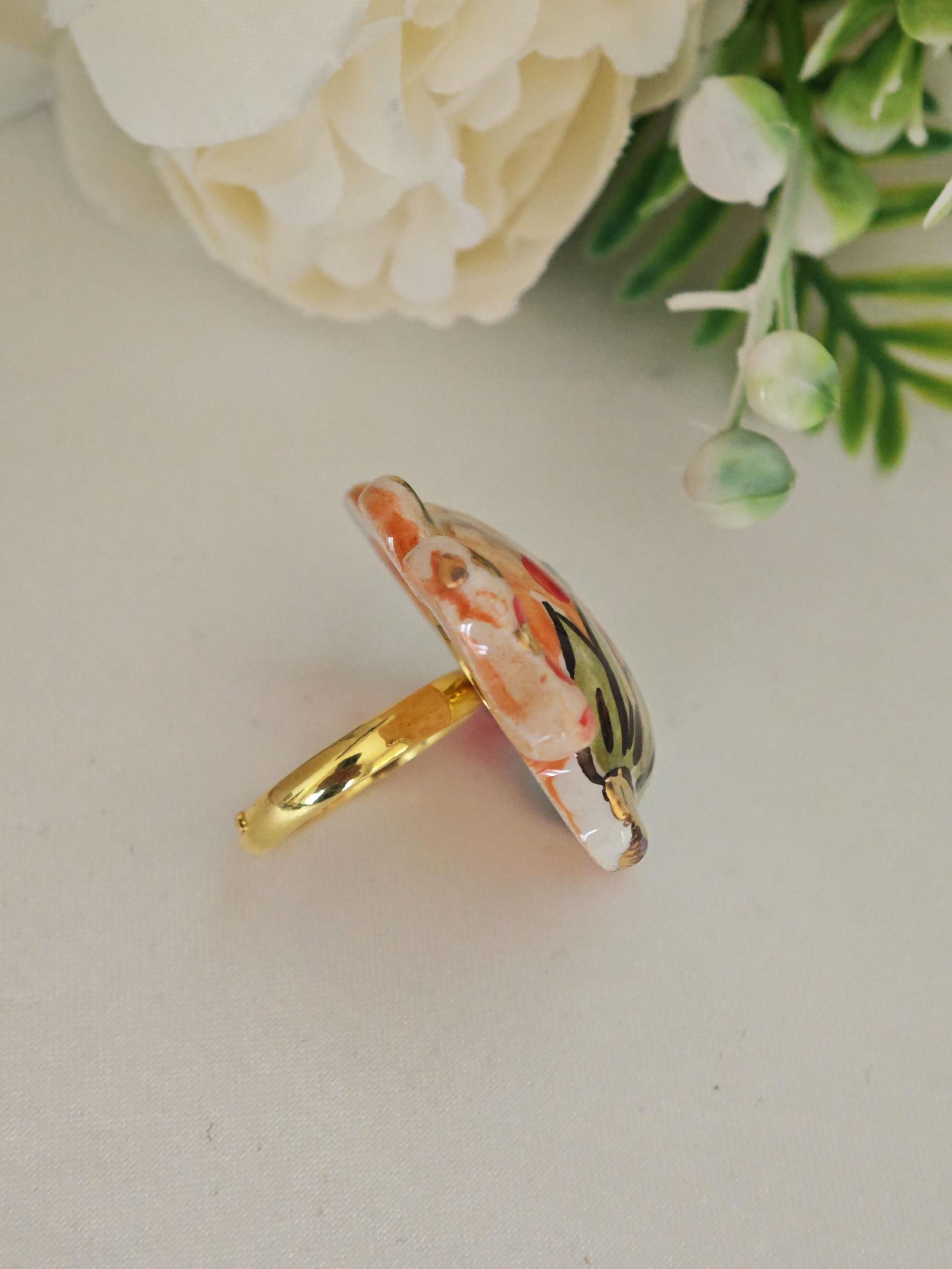 Anello cammeo pasta di corallo bianco e ottone dorato , anello maxi, gioielli italiani