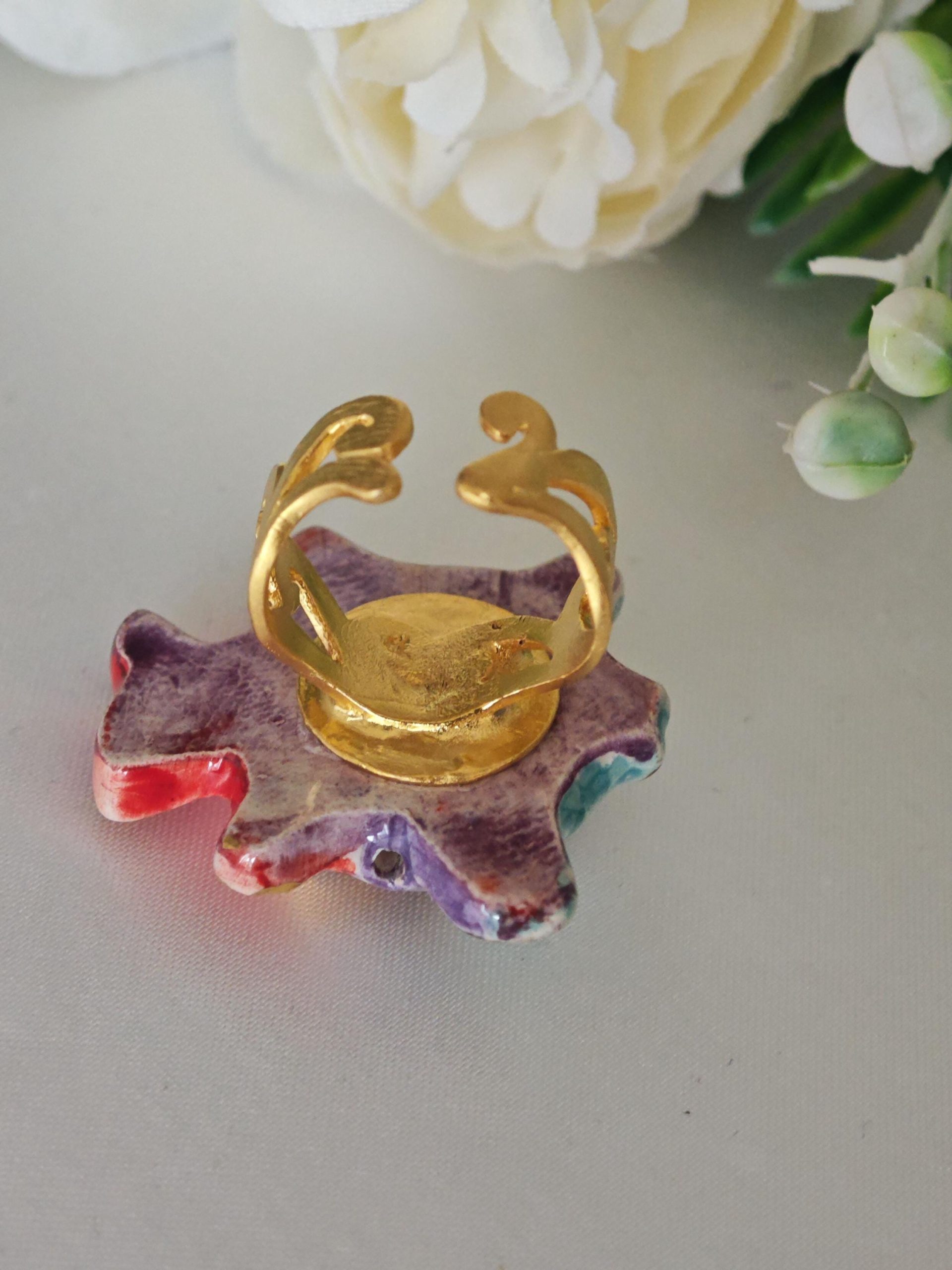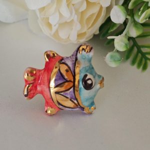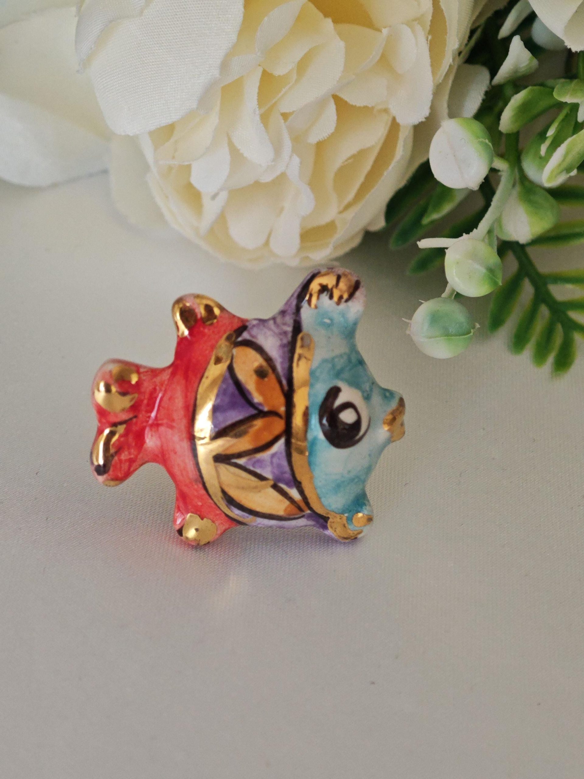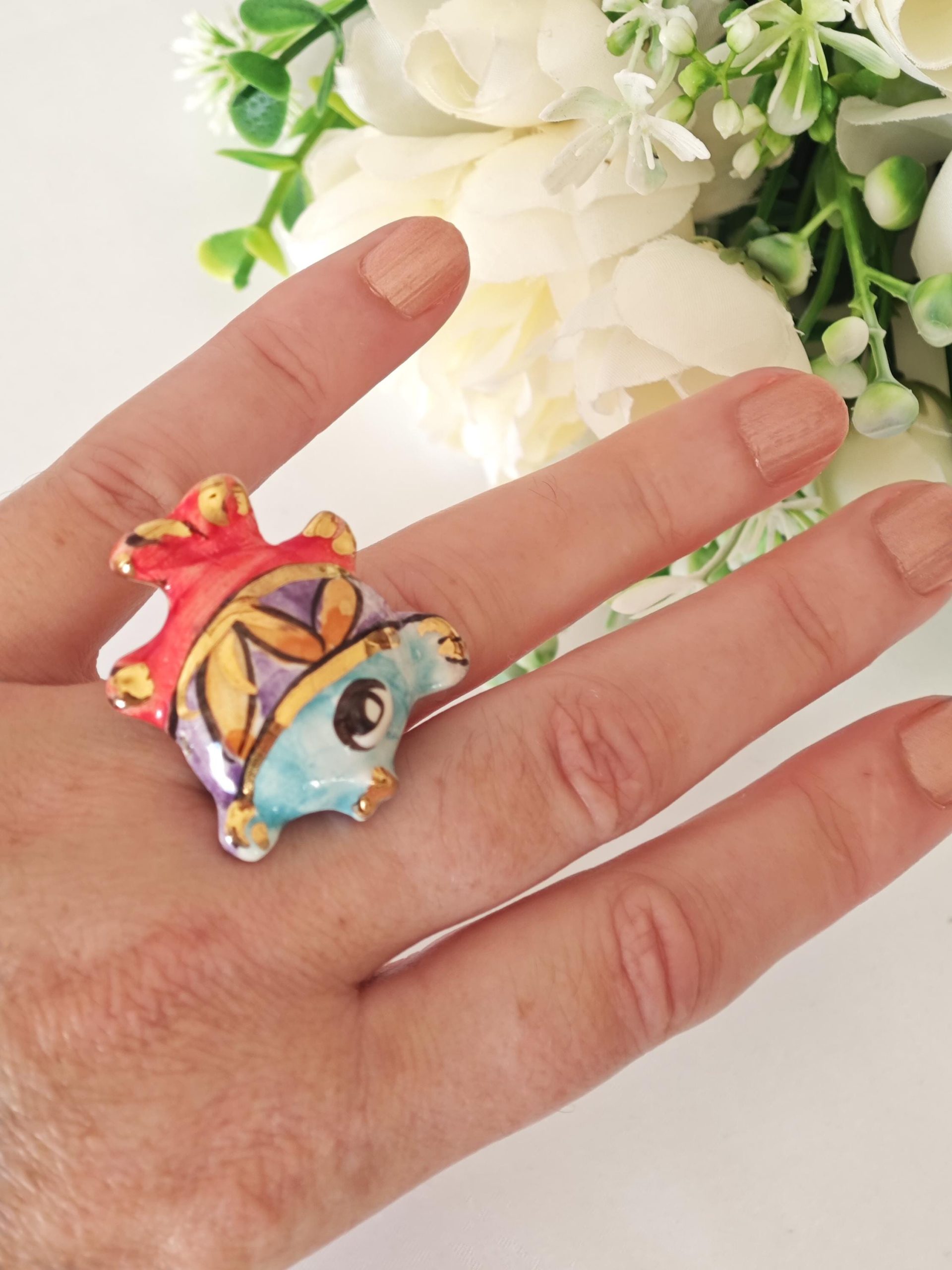 Anello artigianale con base in ottone dorato e con pesciolino in ceramica di Caltagirone realizzata e dipinta a mano a mano, 4×3 cm dimensioni .