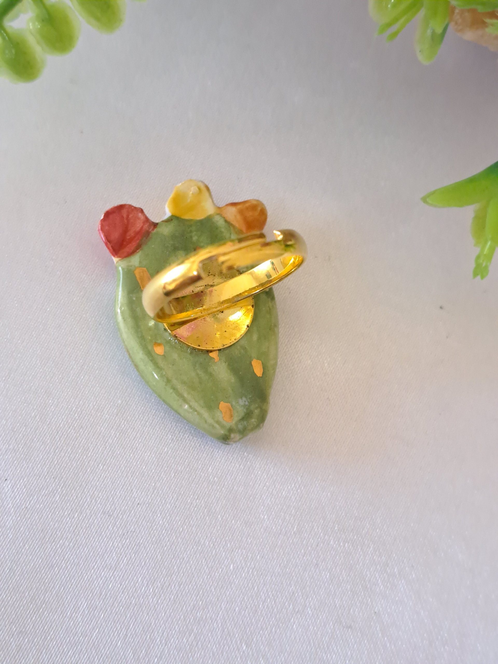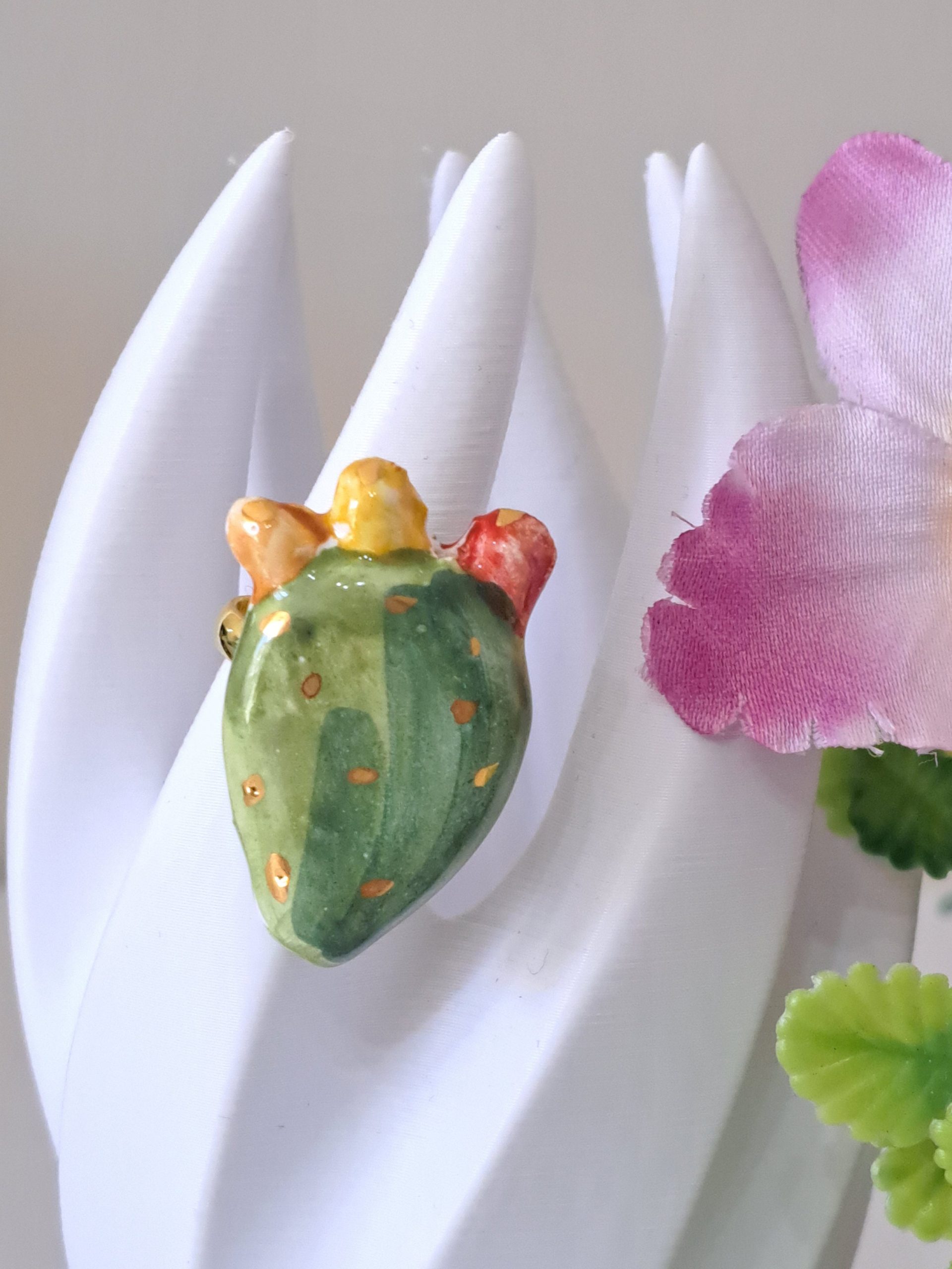 Anello in ottone con fico d’india in ceramica di Caltagirone realizzata e dipinta a mano a mano, 3 cm dimensioni.