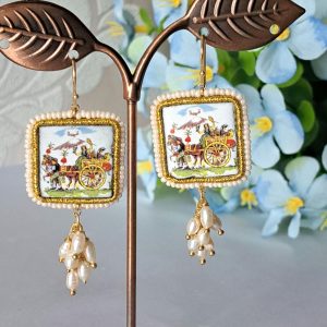 Orecchini piastrelle ceramica Caltagirone con grappolo perle bianche  , orecchini siciliani