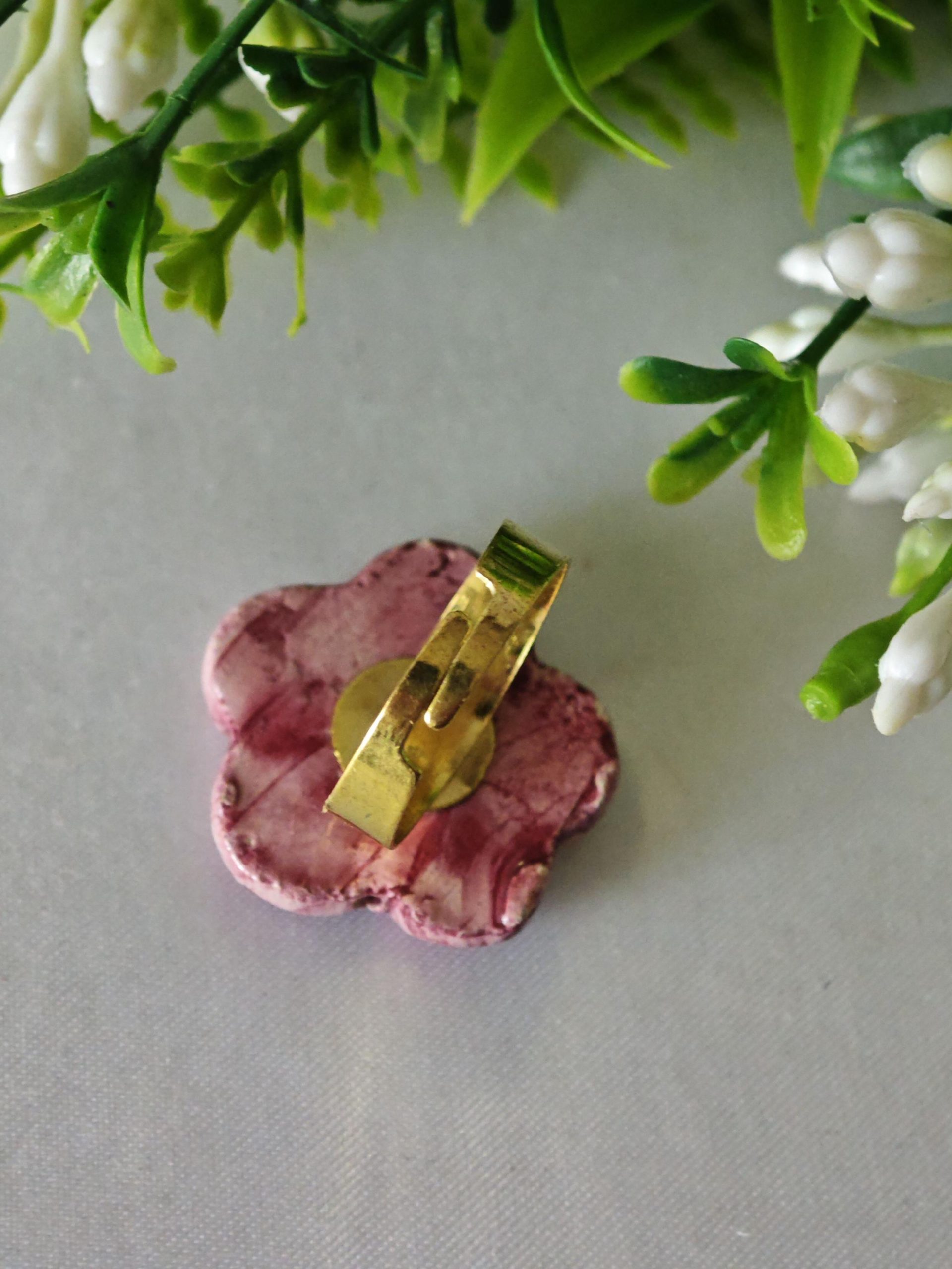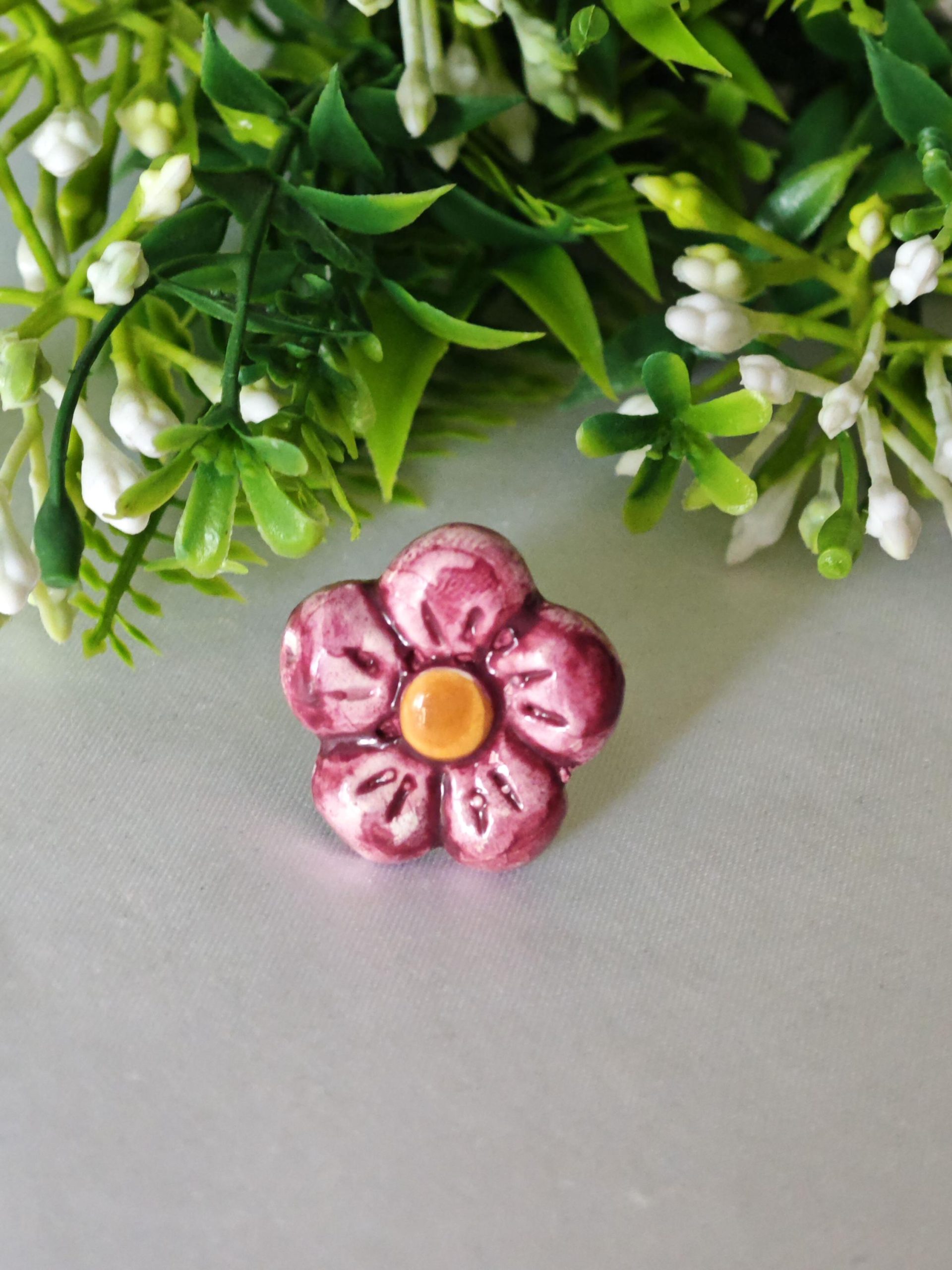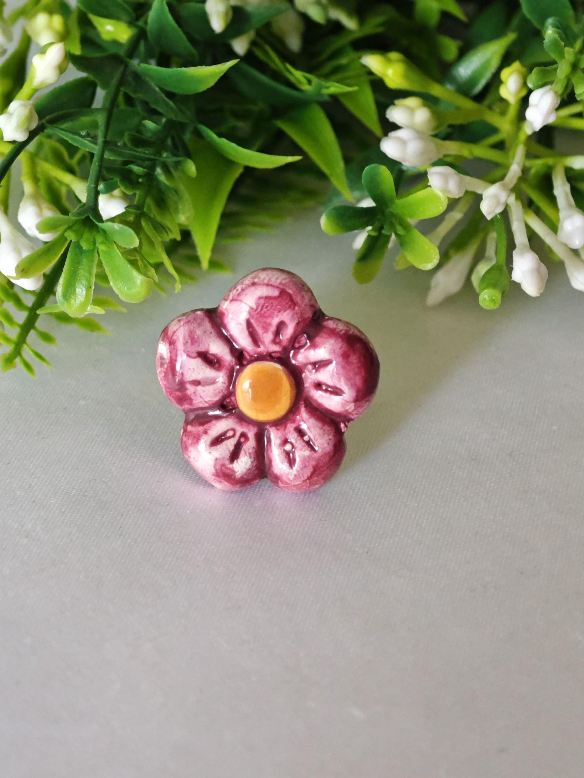 Anello artigianale con fiore in ceramica di Caltagirone realizzata e dipinta a mano, 2,5 cm diametro con base in ottone dorato .