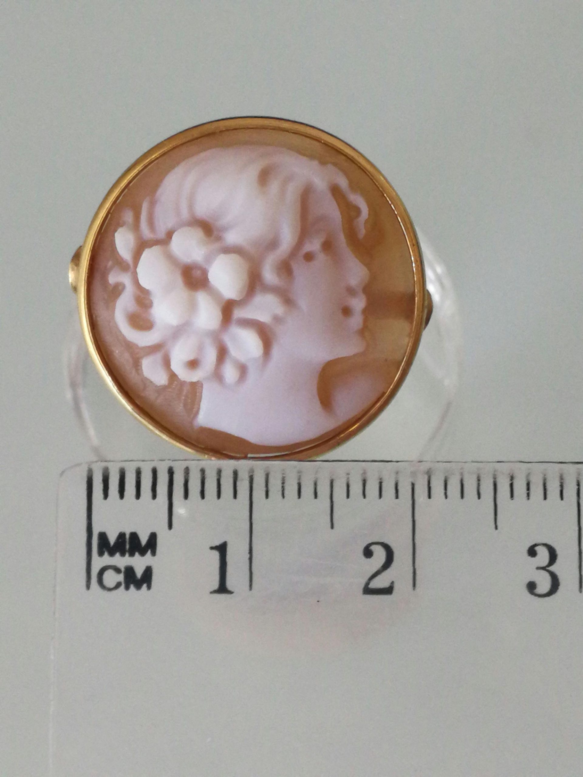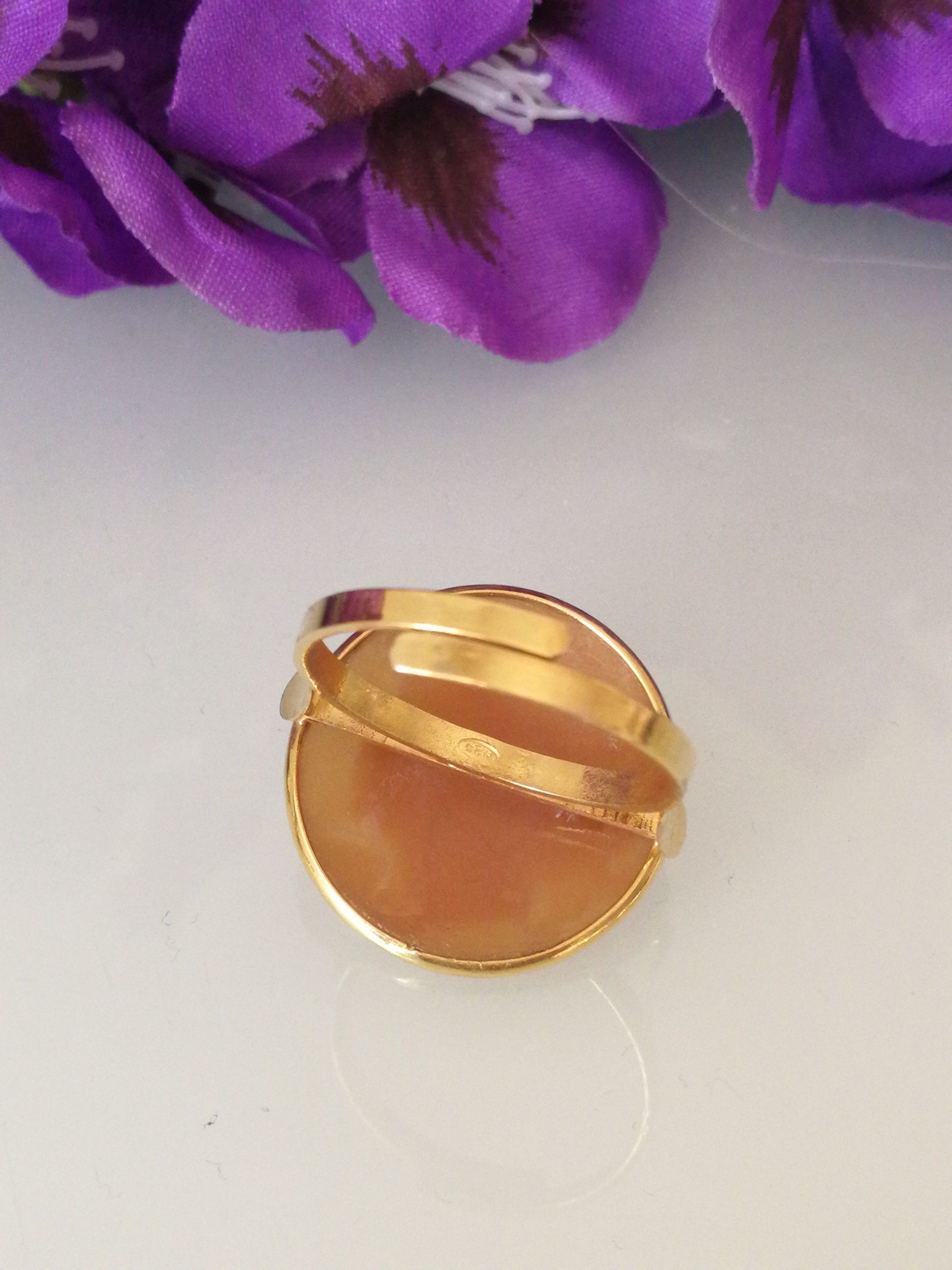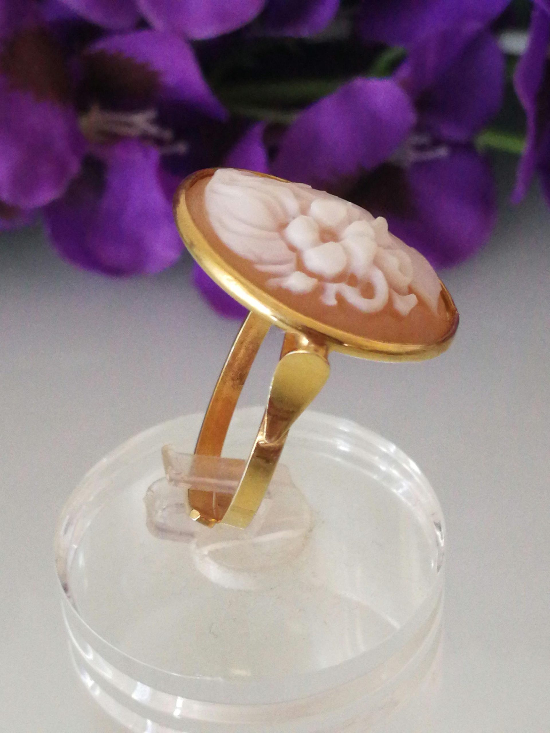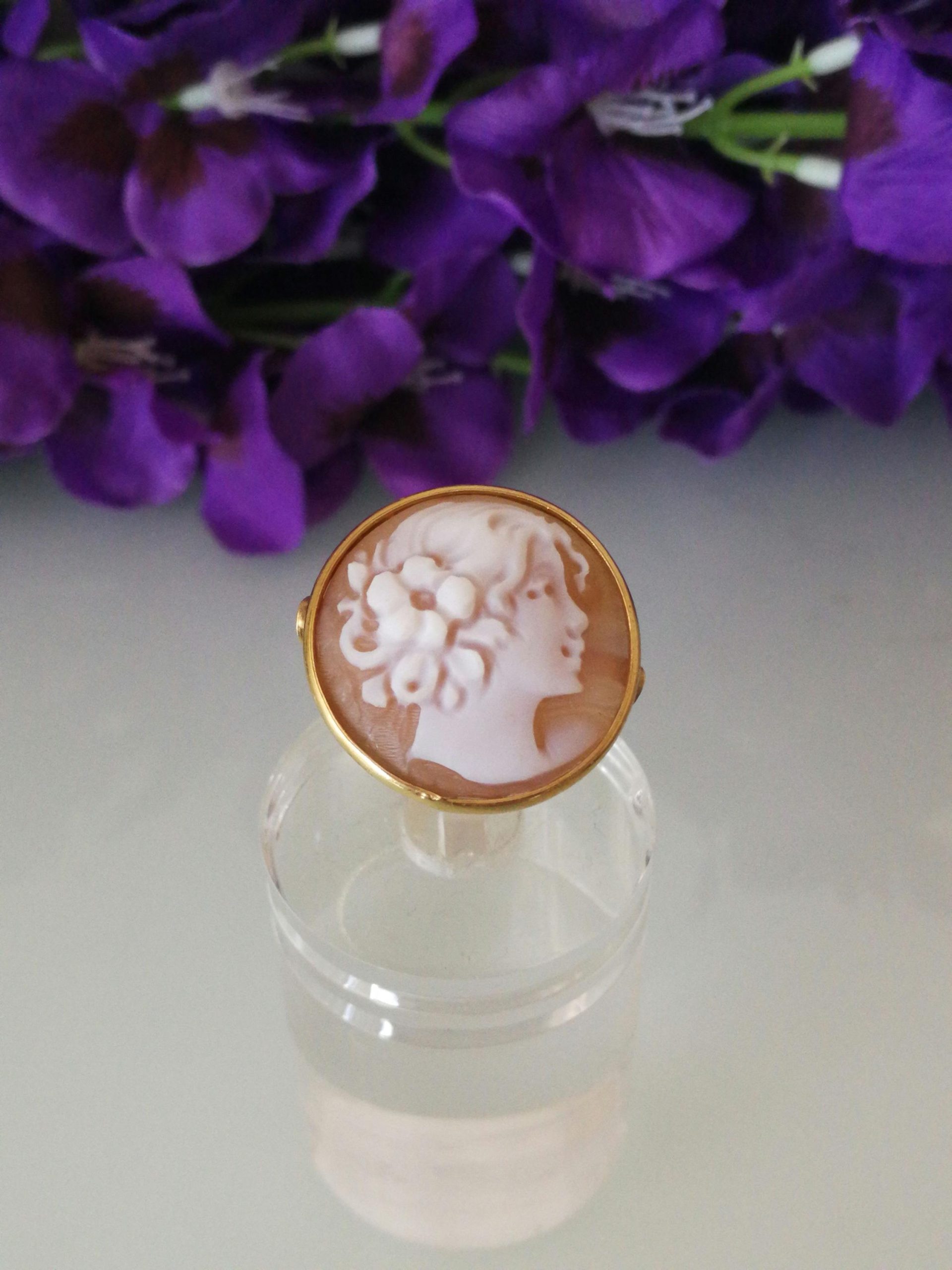 Anello elegante con cammeo conchiglia originale con volto di donna. Montatura in argento 925 placcata oro .Il cammeo è grande diametro 2 cm .Misura anello regolabile.Con scatola regalo.Cammeo perfetto.