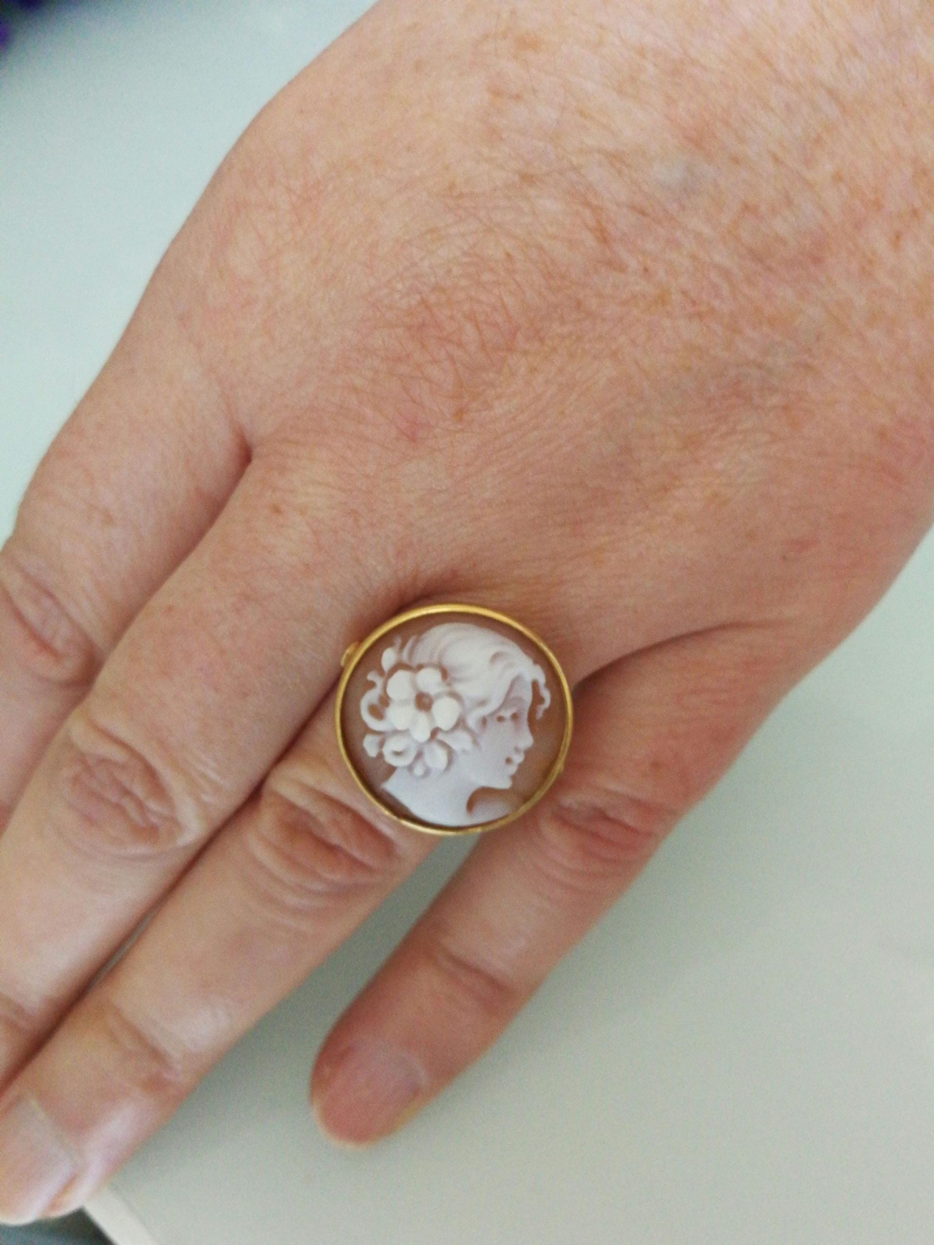 Anello cammeo, conchiglia sardonica e ottone dorato