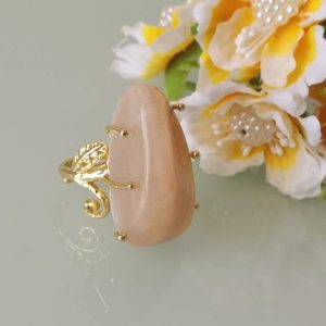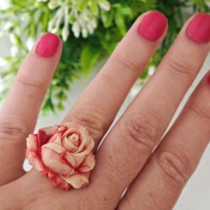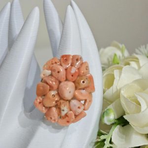 Anello maxi corallo rosa naturale di Sciacca e ottone dorato, gioielli italiani