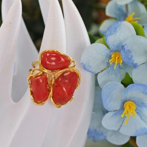 Anello corallo rosso naturale mediterraneo e argento 925 placcato oro , gioielli italiani