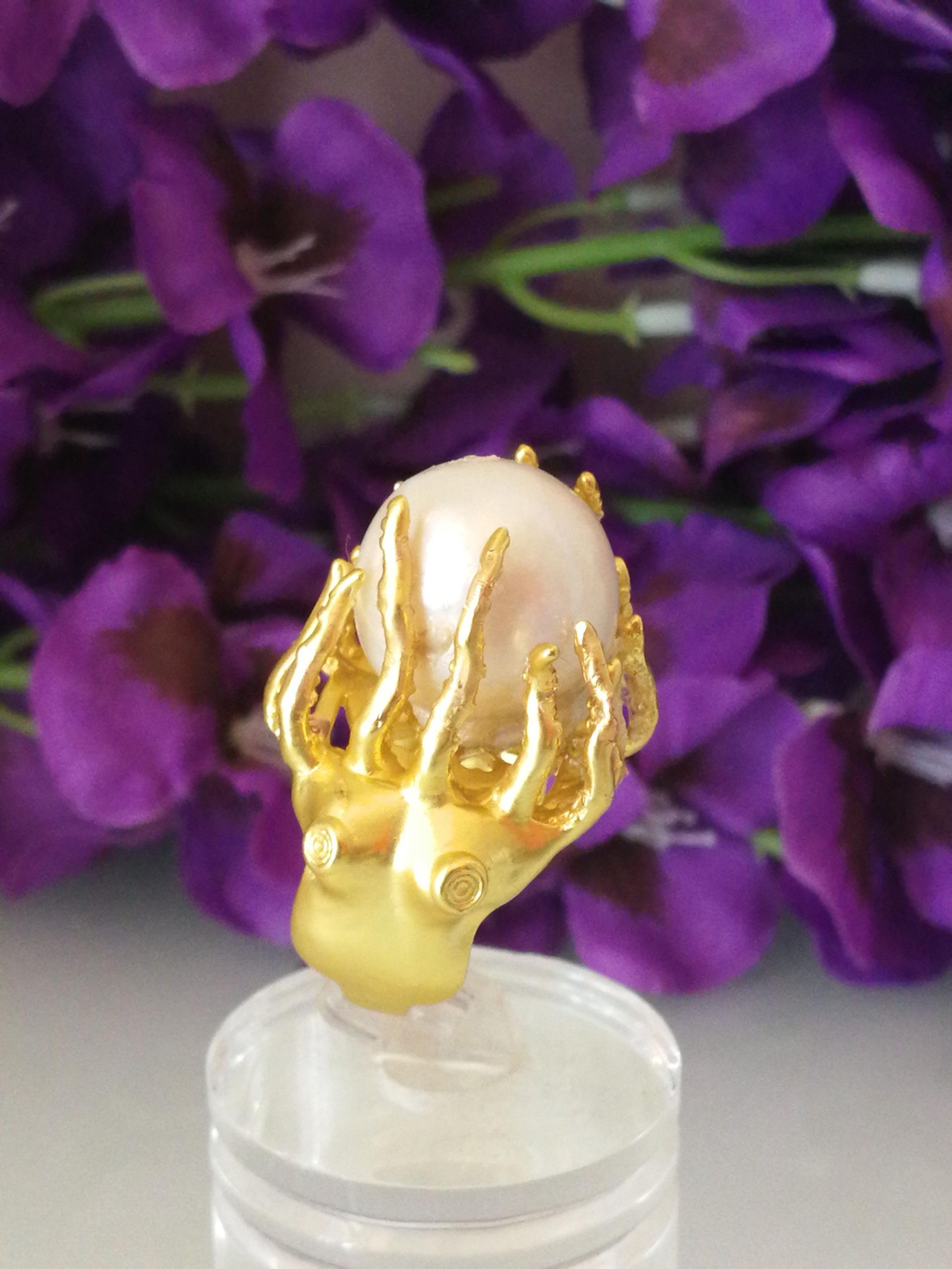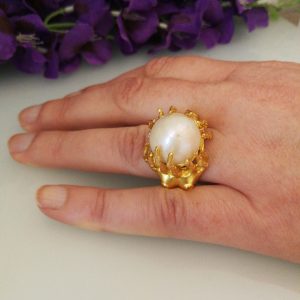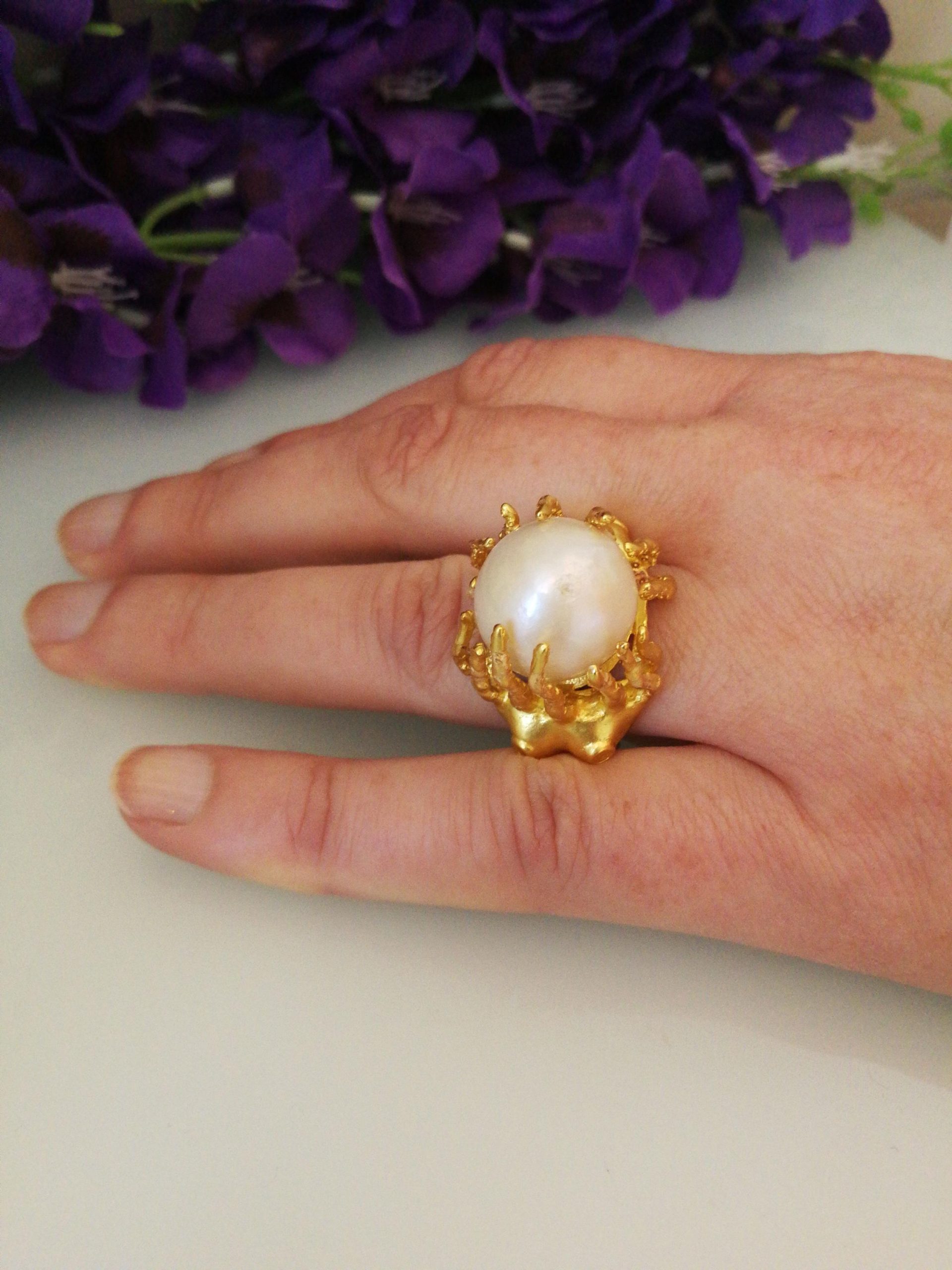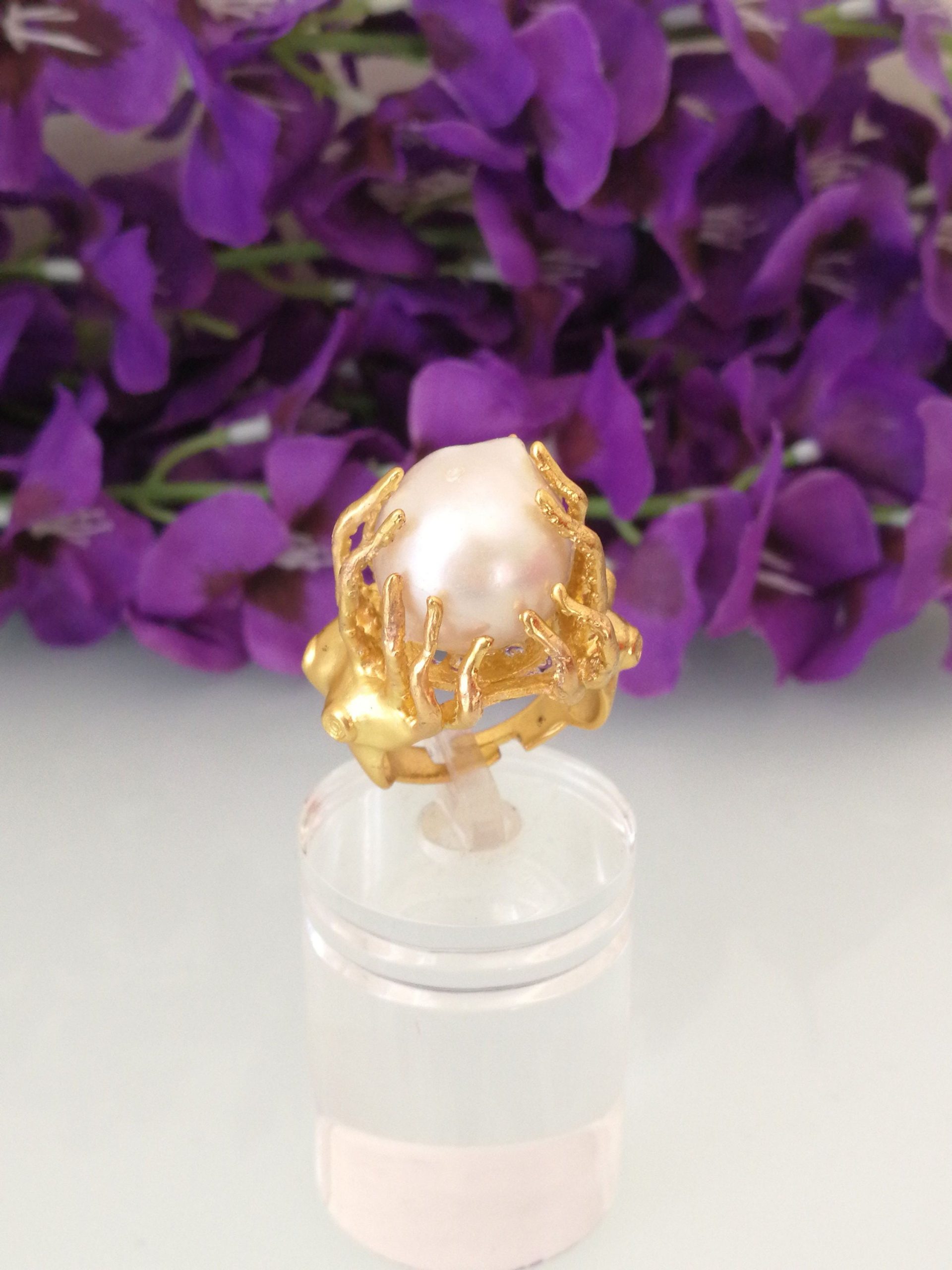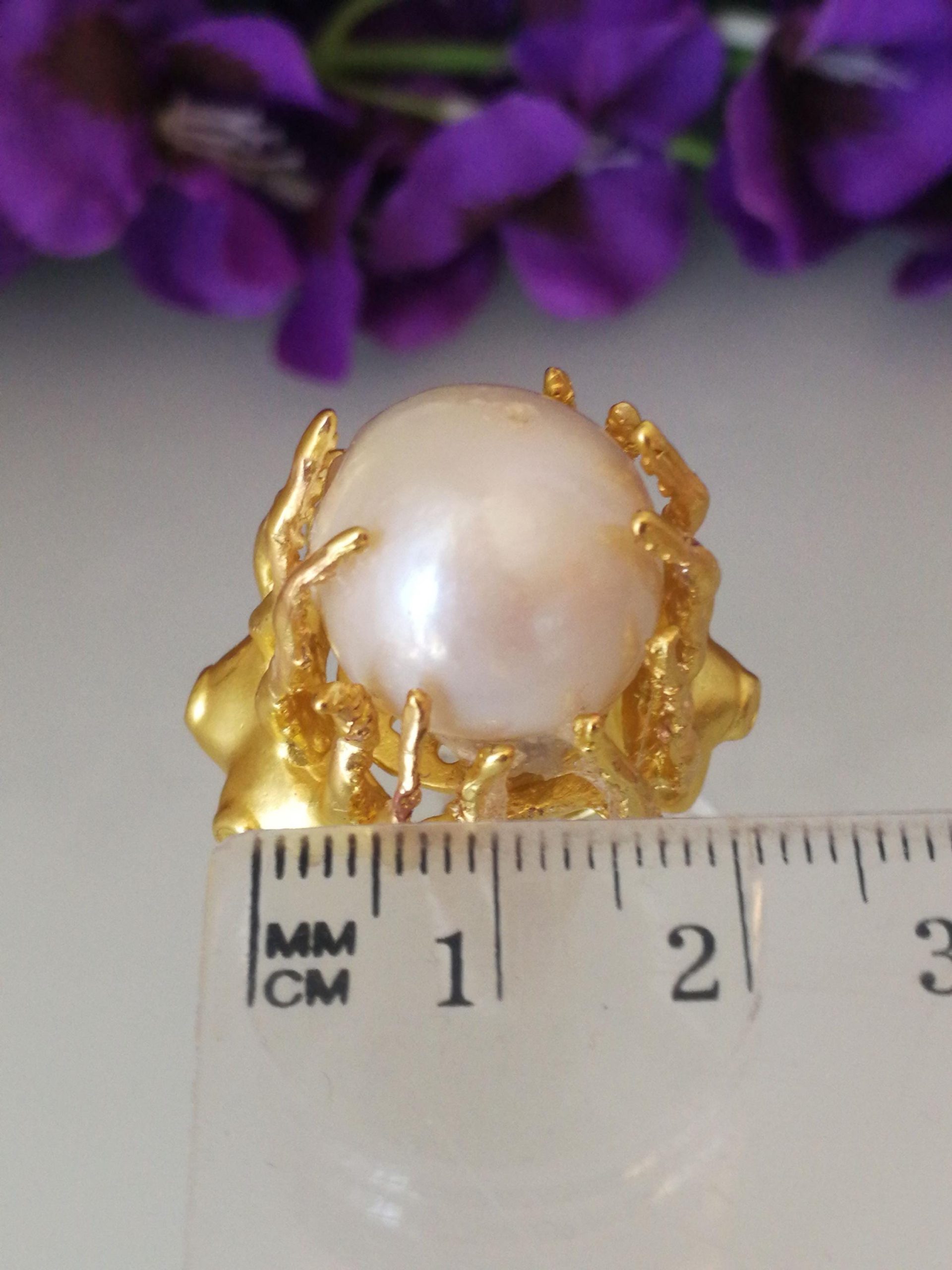 Anello elegante con perla naturale barocca bianca máxi incastonata su montatura artigianale dorata .Misura perla 2 cm. Misura anello regolabile.15/16/17/18/19