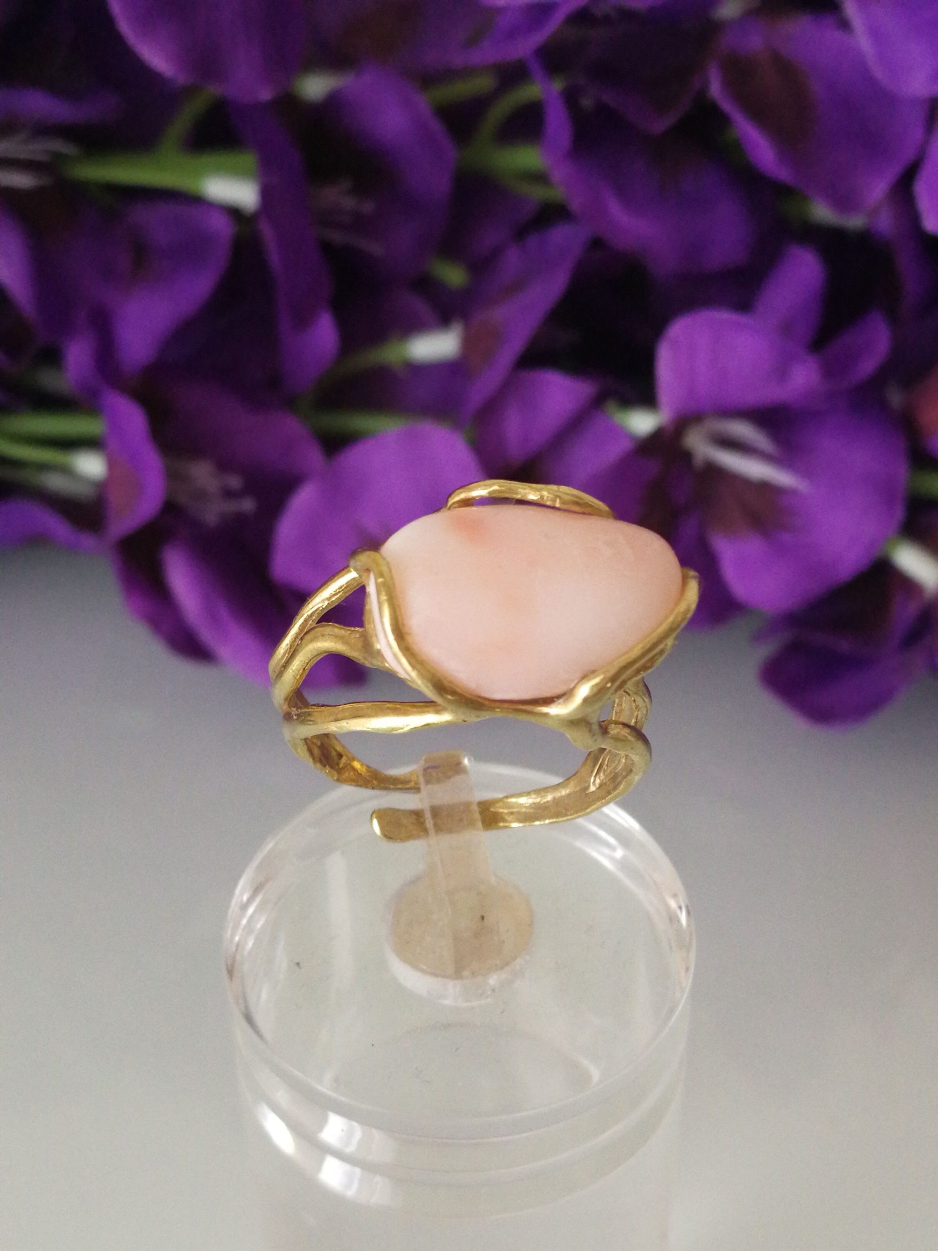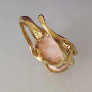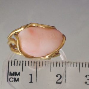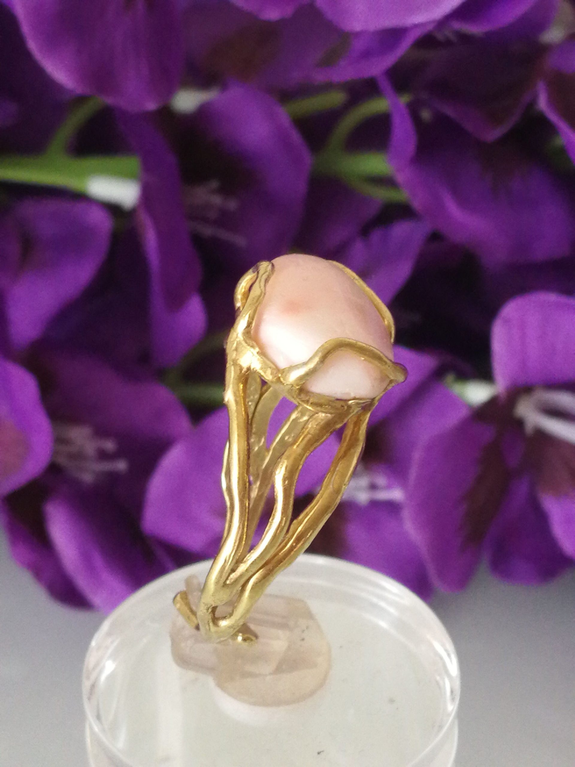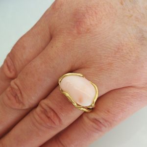 Anello elegante con corallo rosa naturale del mediterraneo a cabochon , montatura in argento placcato oro in stile Liberty .Misura corallo 2 cm. Misura anello regolabile.