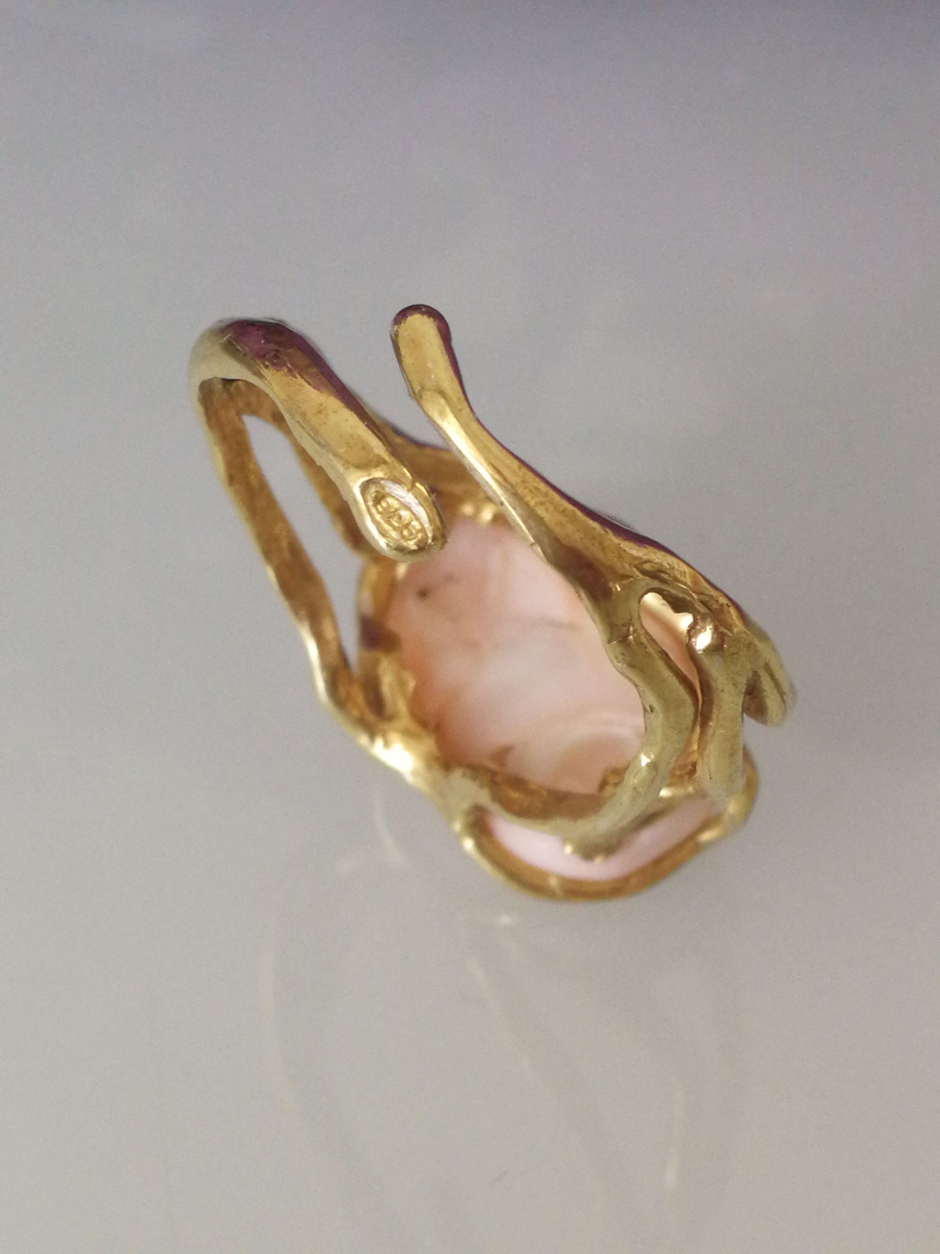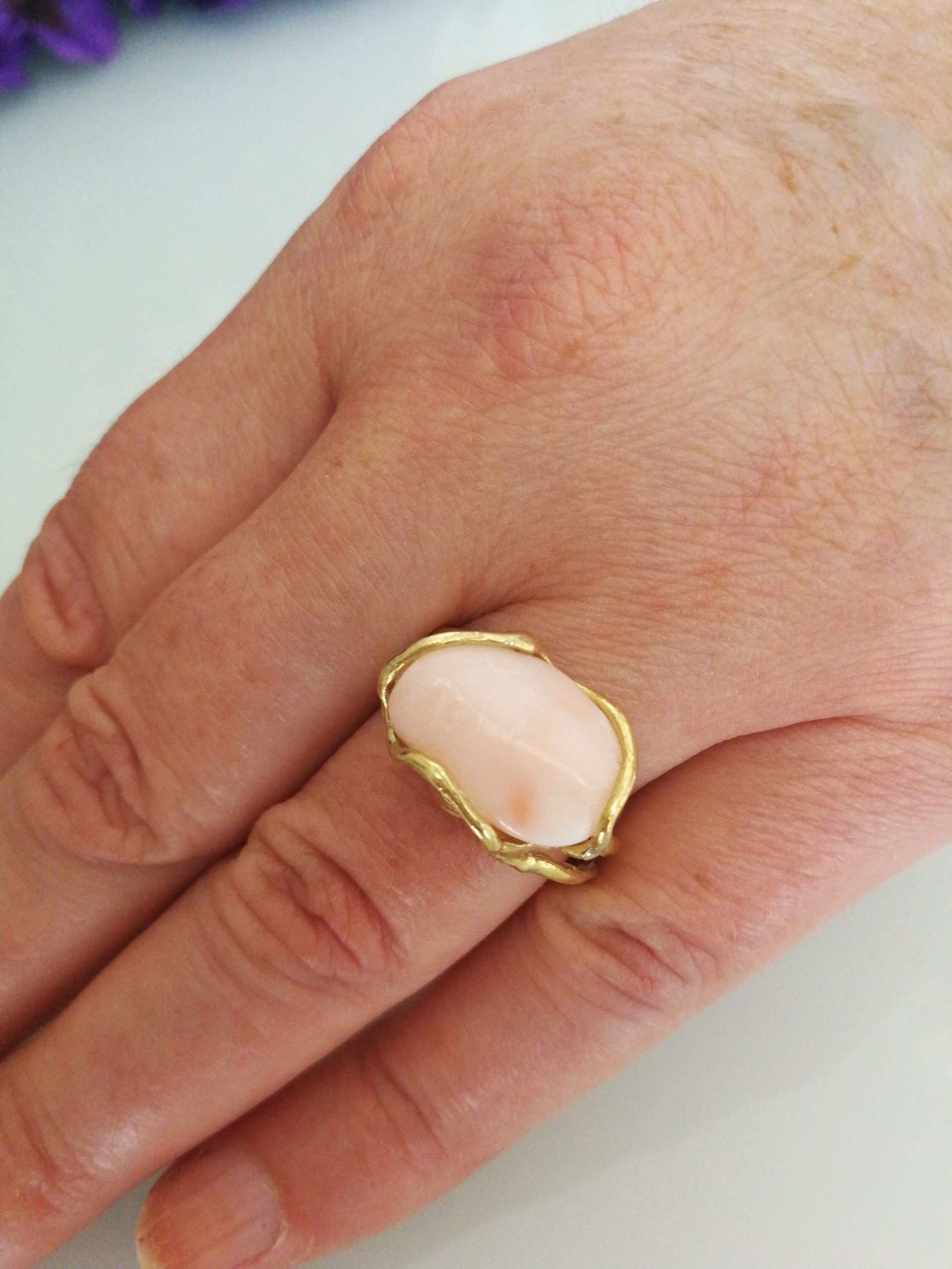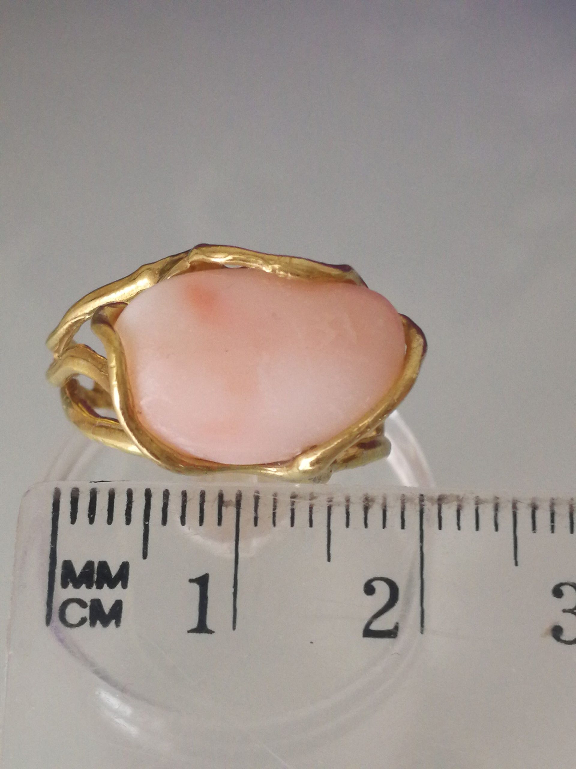 Anello elegante con corallo rosa naturale del mediterraneo a cabochon , montatura in argento placcato oro in stile Liberty .Misura corallo 2 cm. Misura anello regolabile.