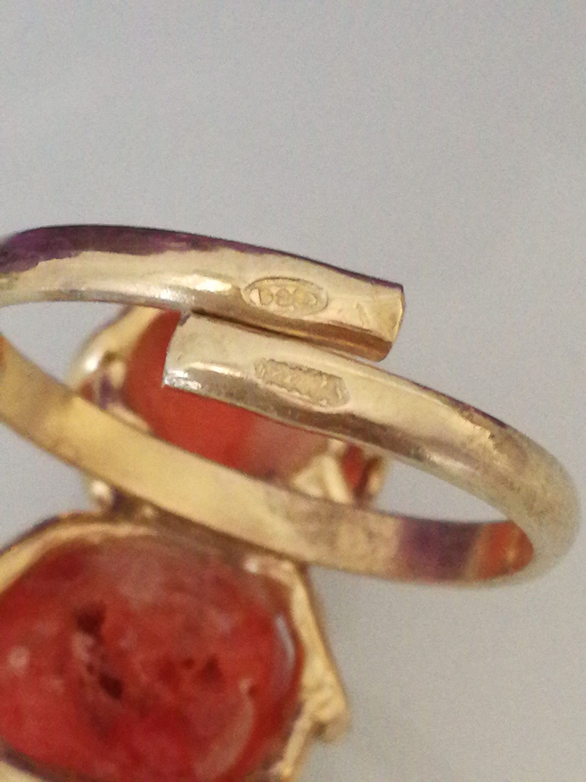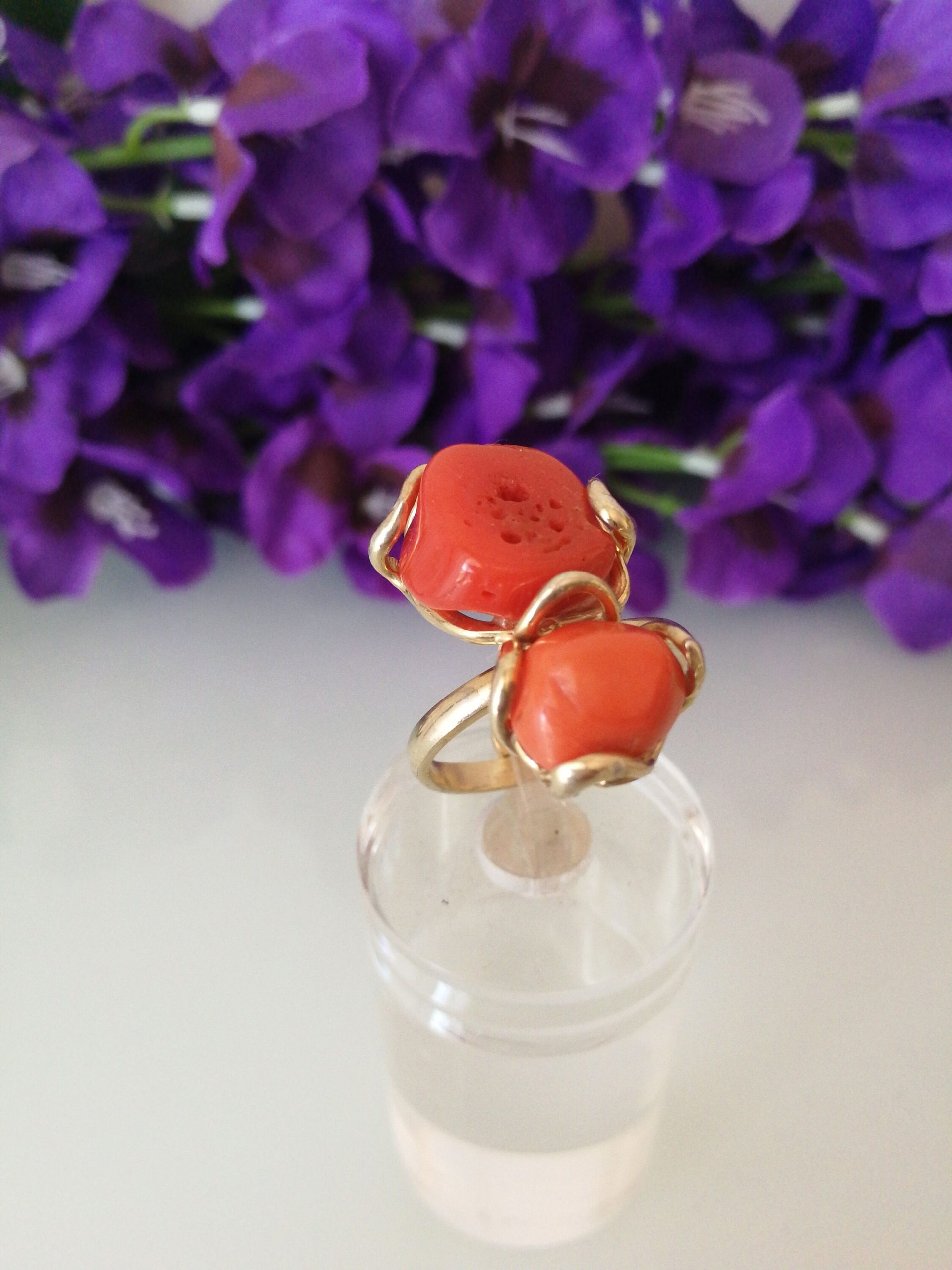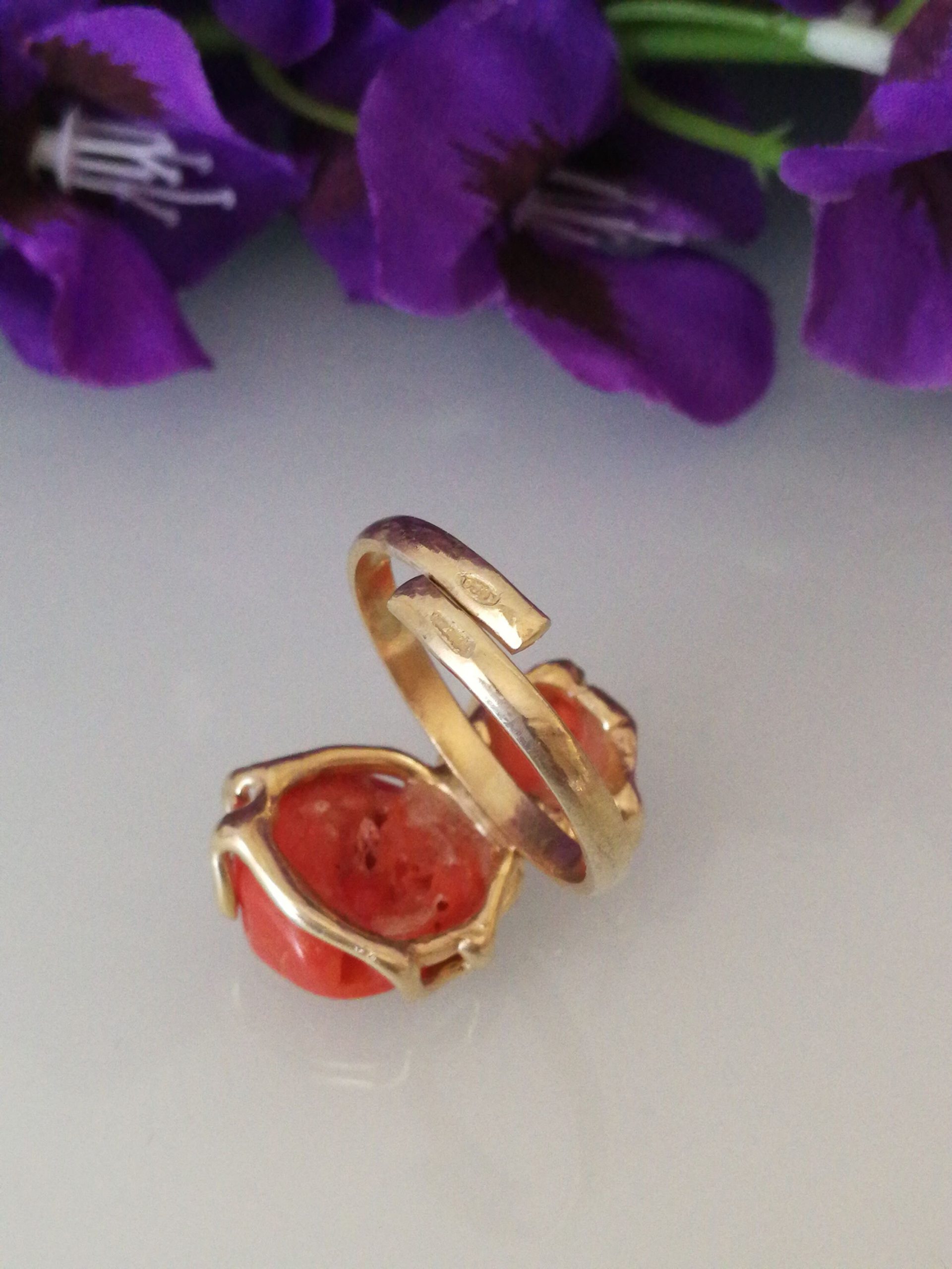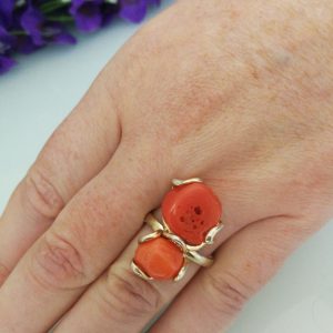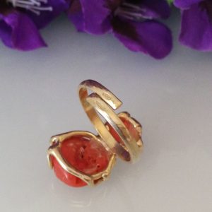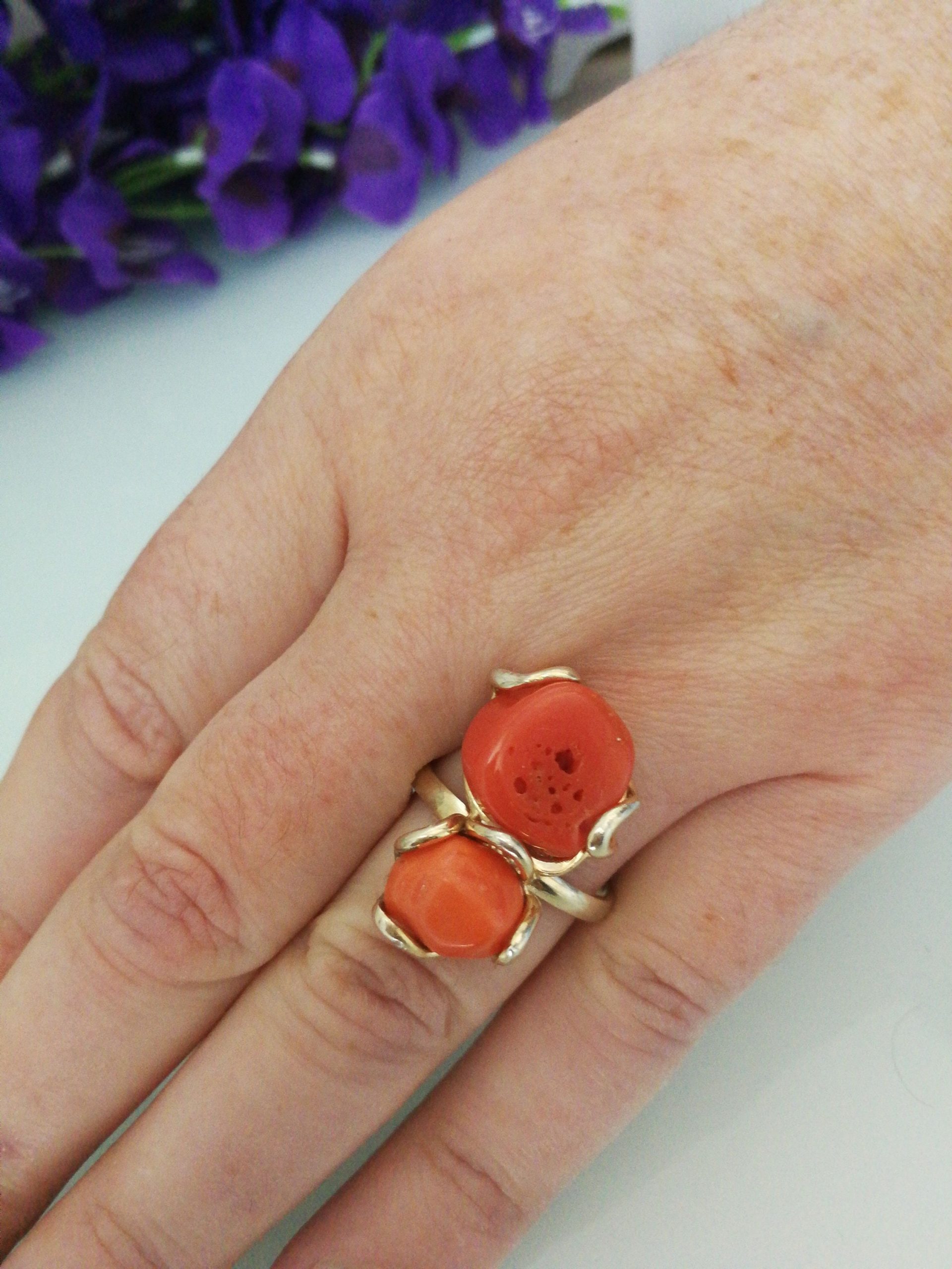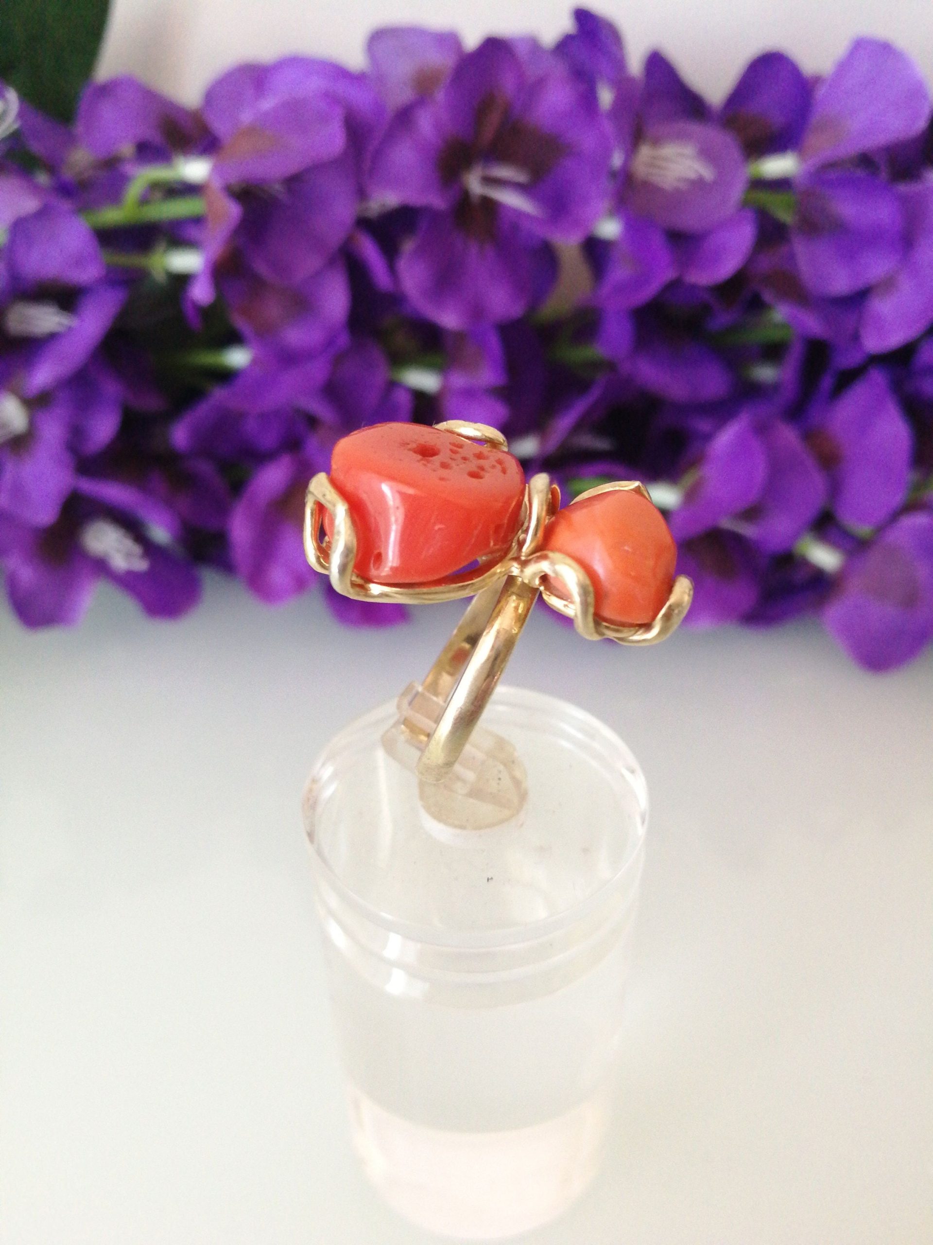 Anello elegante in argento, con due pezzi di corallo rosso naturale del mediterraneo, incastonati in montatura argento placcata oro. Misura lunghezza corallo 3 cm . Misura anello regolabile.