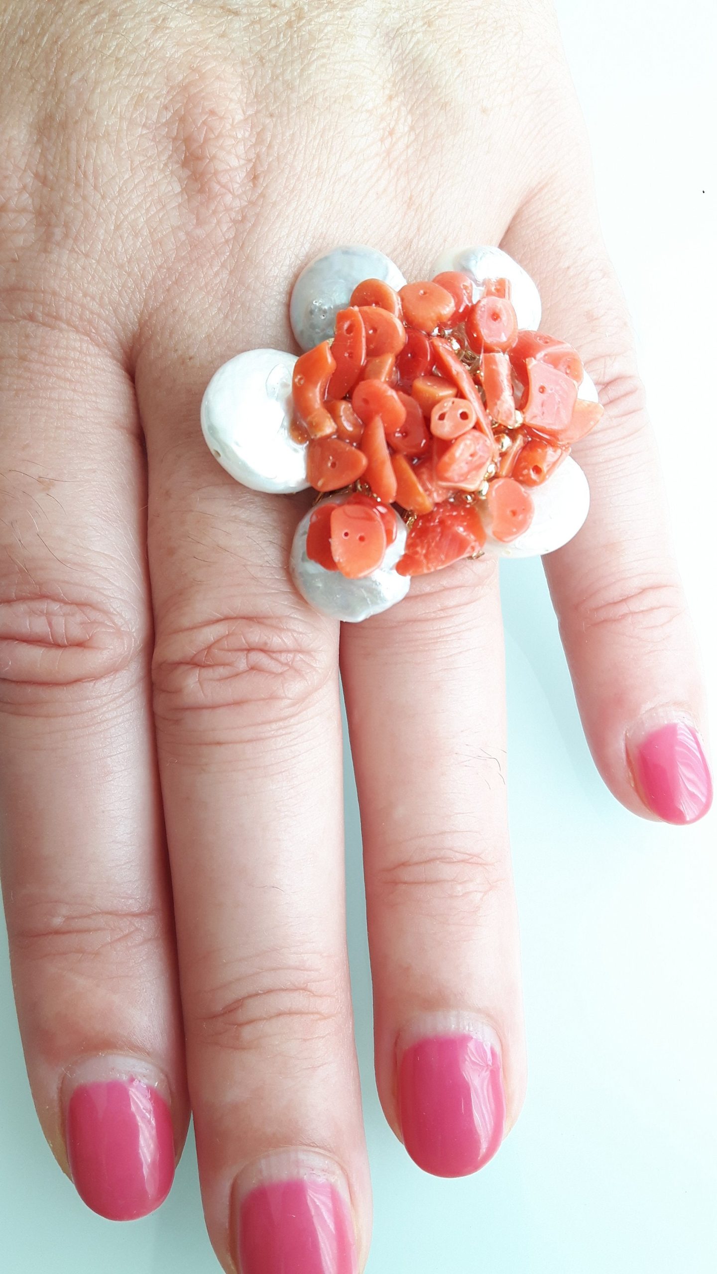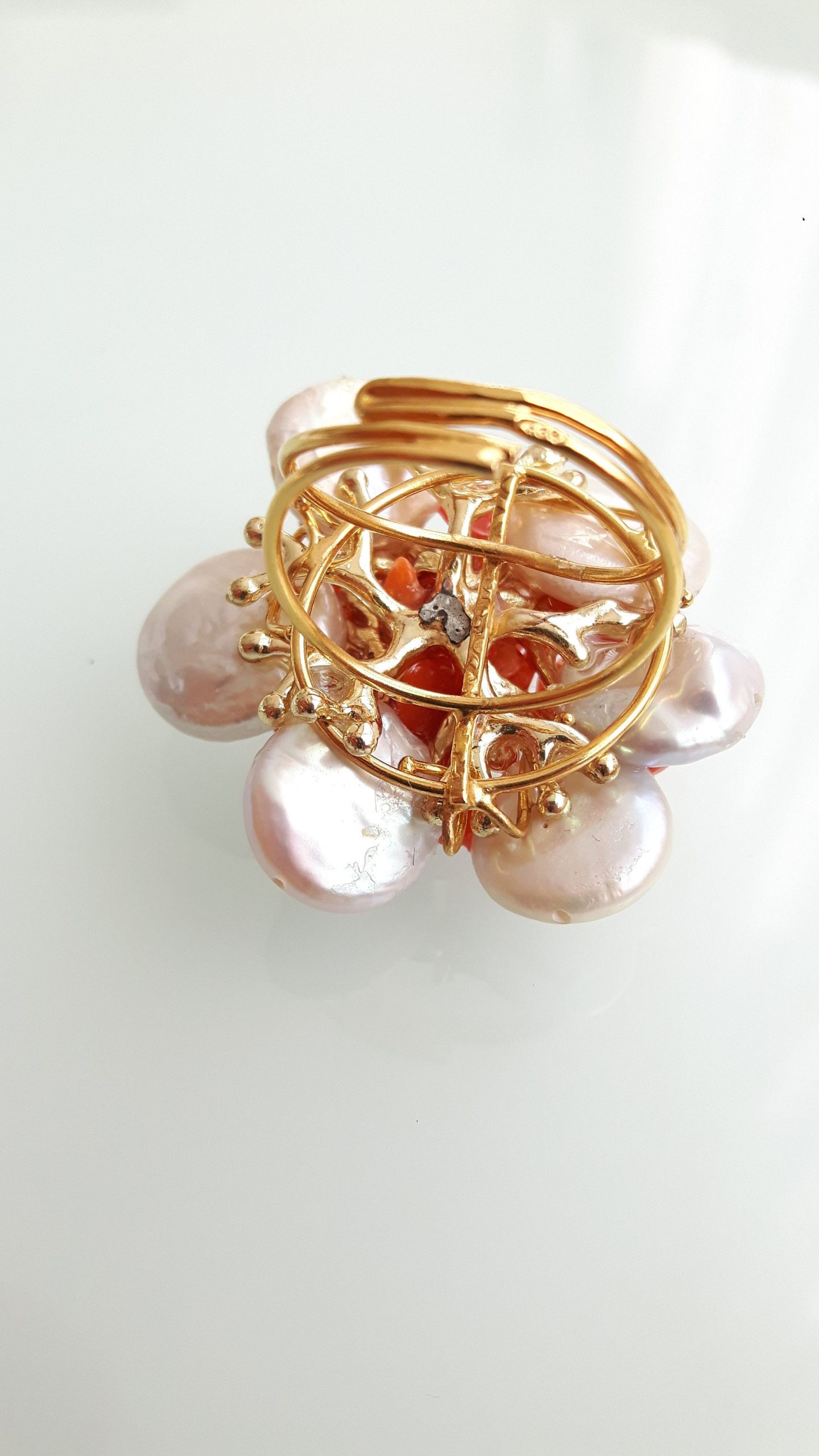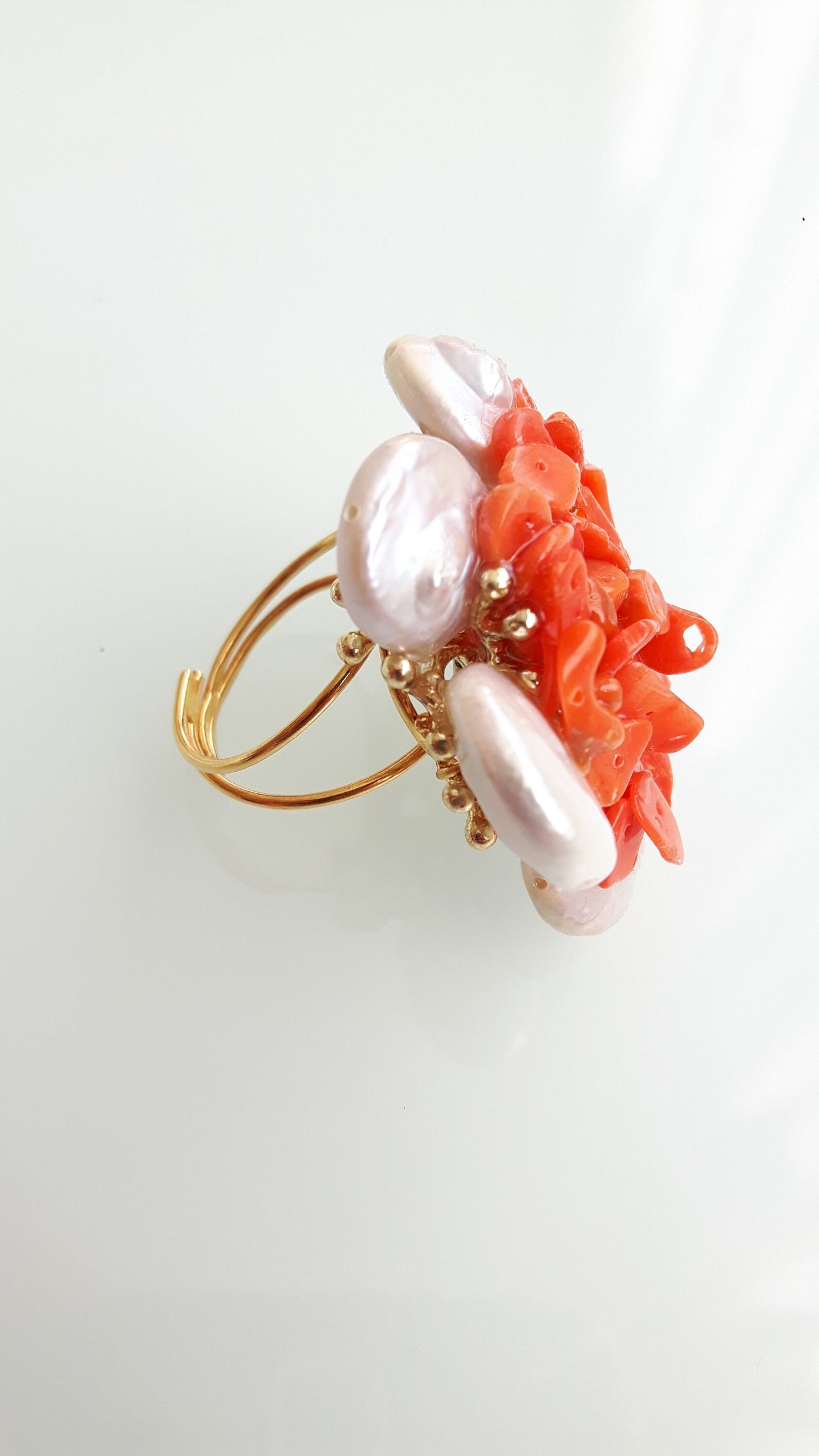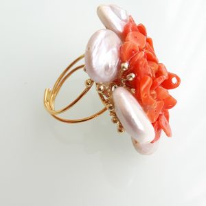 Anello elegante con perle naturali bianche piatte con corallo rosso del mediterraneo centrale.Montatura anello in argento placcata oro. Misura anello regolabile.