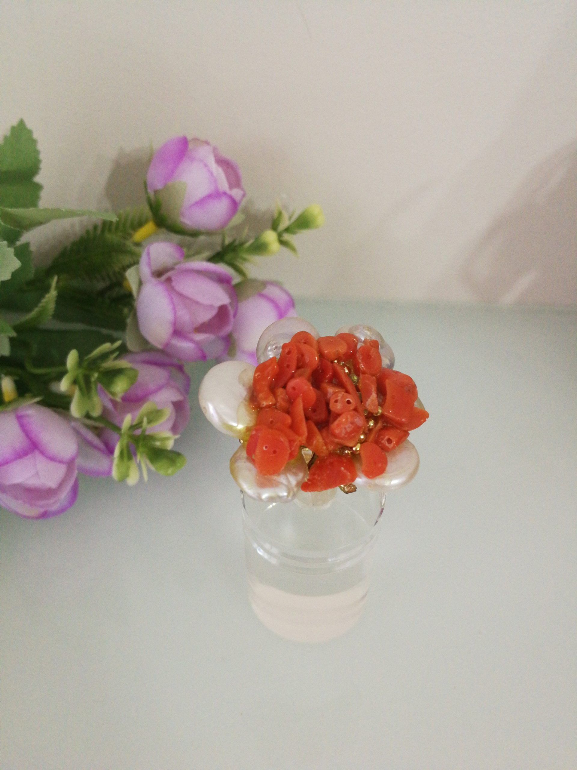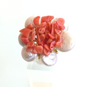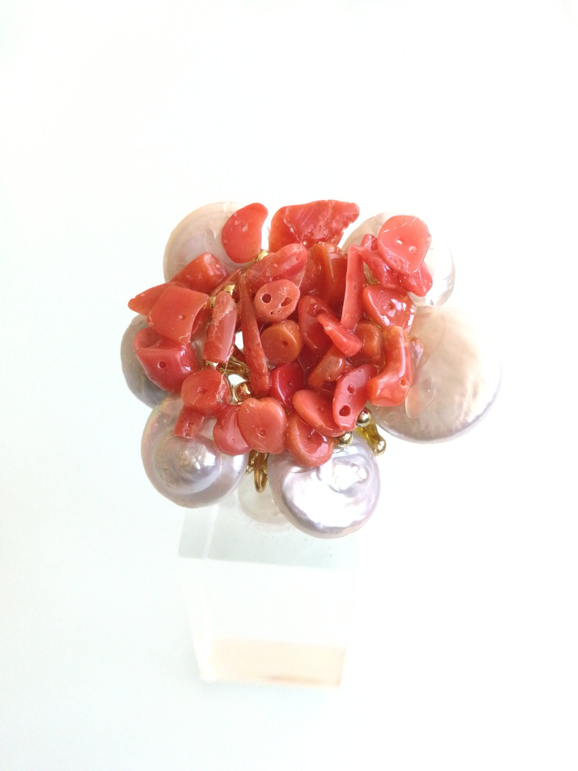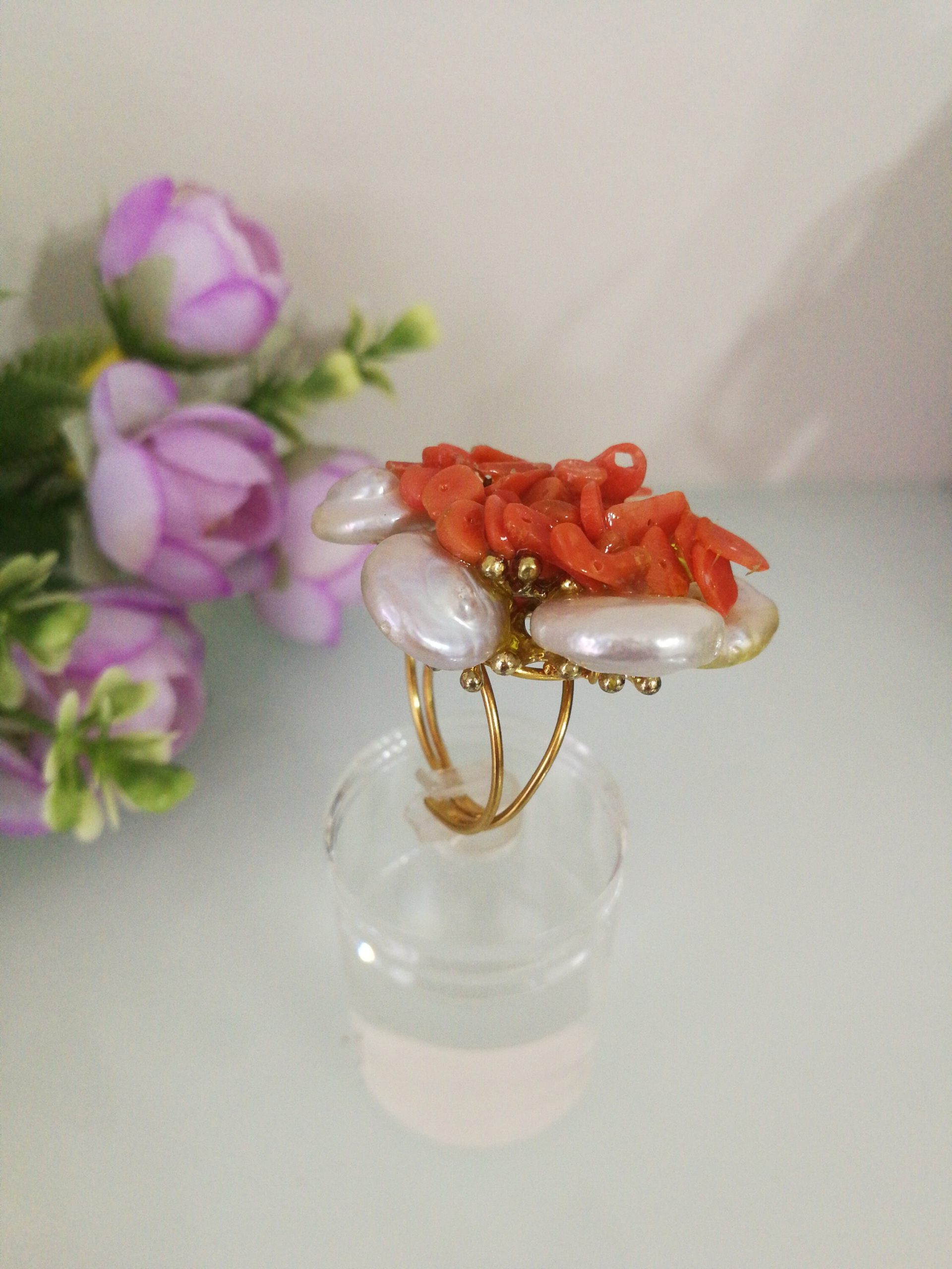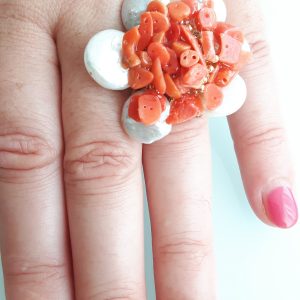 Anello elegante con perle naturali bianche piatte con corallo rosso del mediterraneo centrale.Montatura anello in argento placcata oro. Misura anello regolabile.
