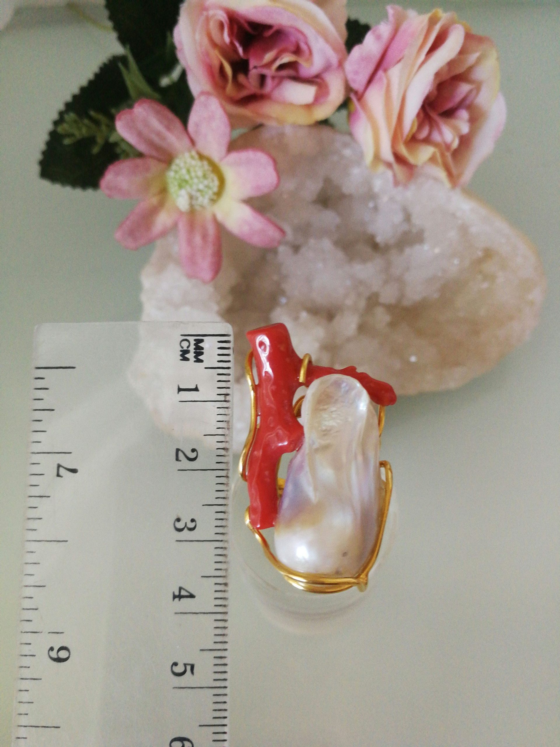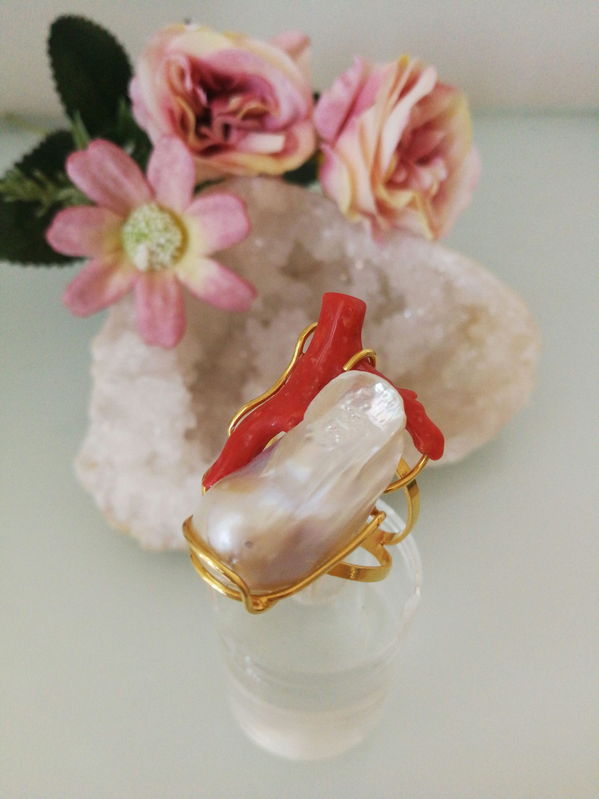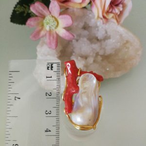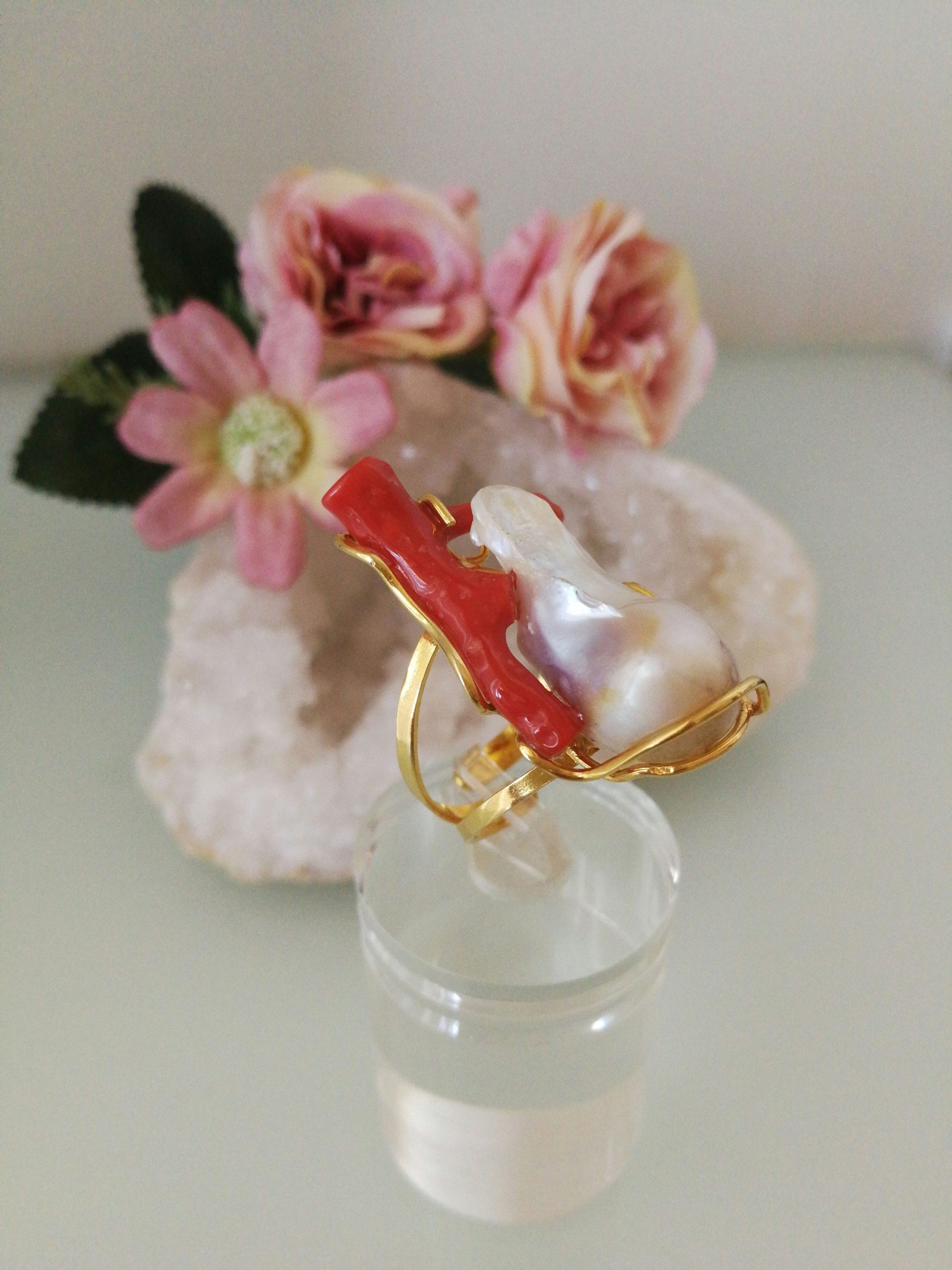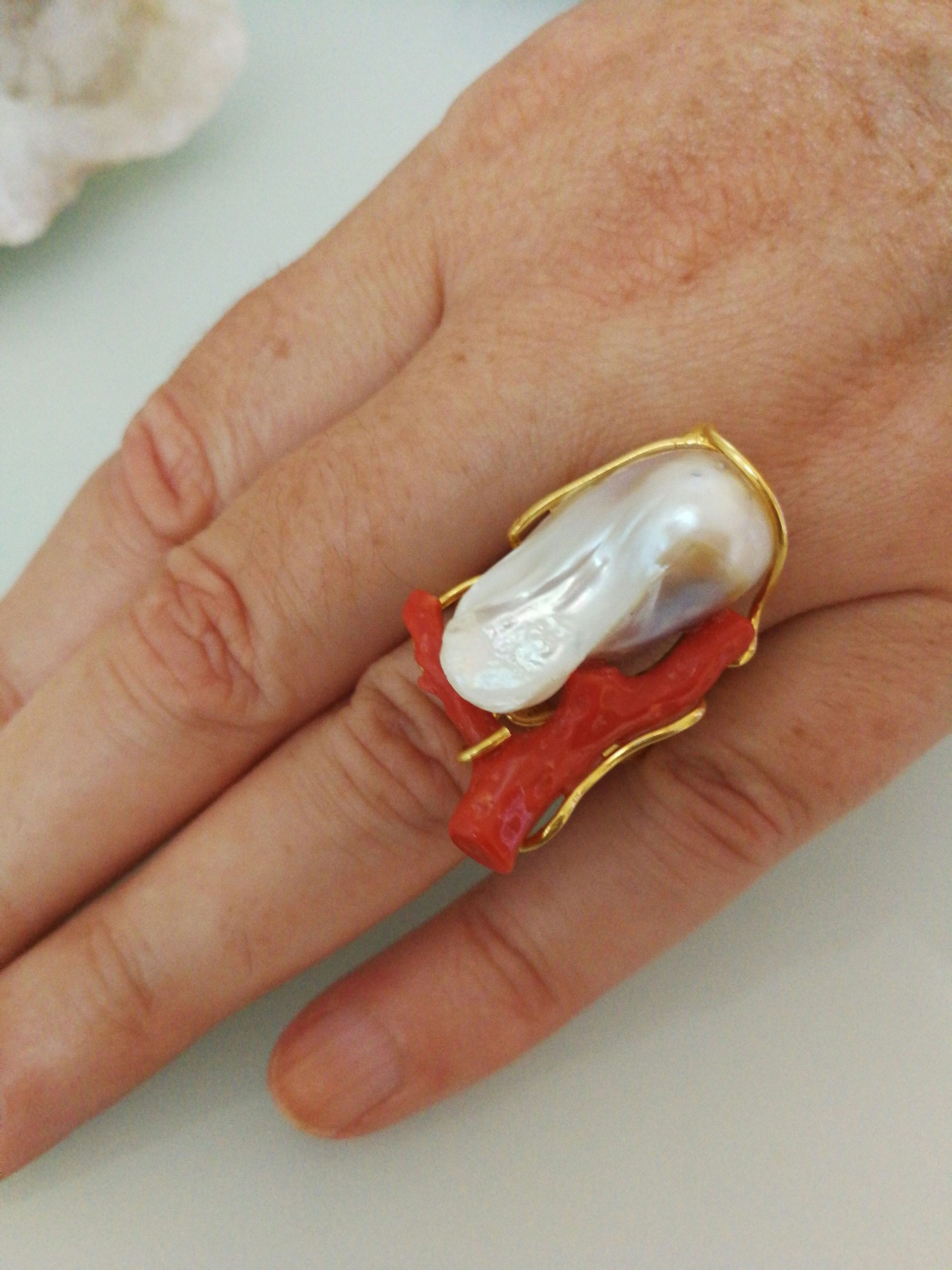 Anello elegante con perla naturale barocca bianca e corallo naturale rosso a ramo, montatura in argento 925 placcata oro .Misura lunghezza perla 3,5 cm . Misura anello regolabile.