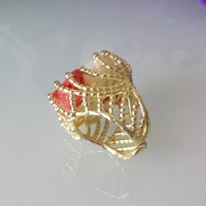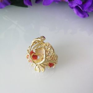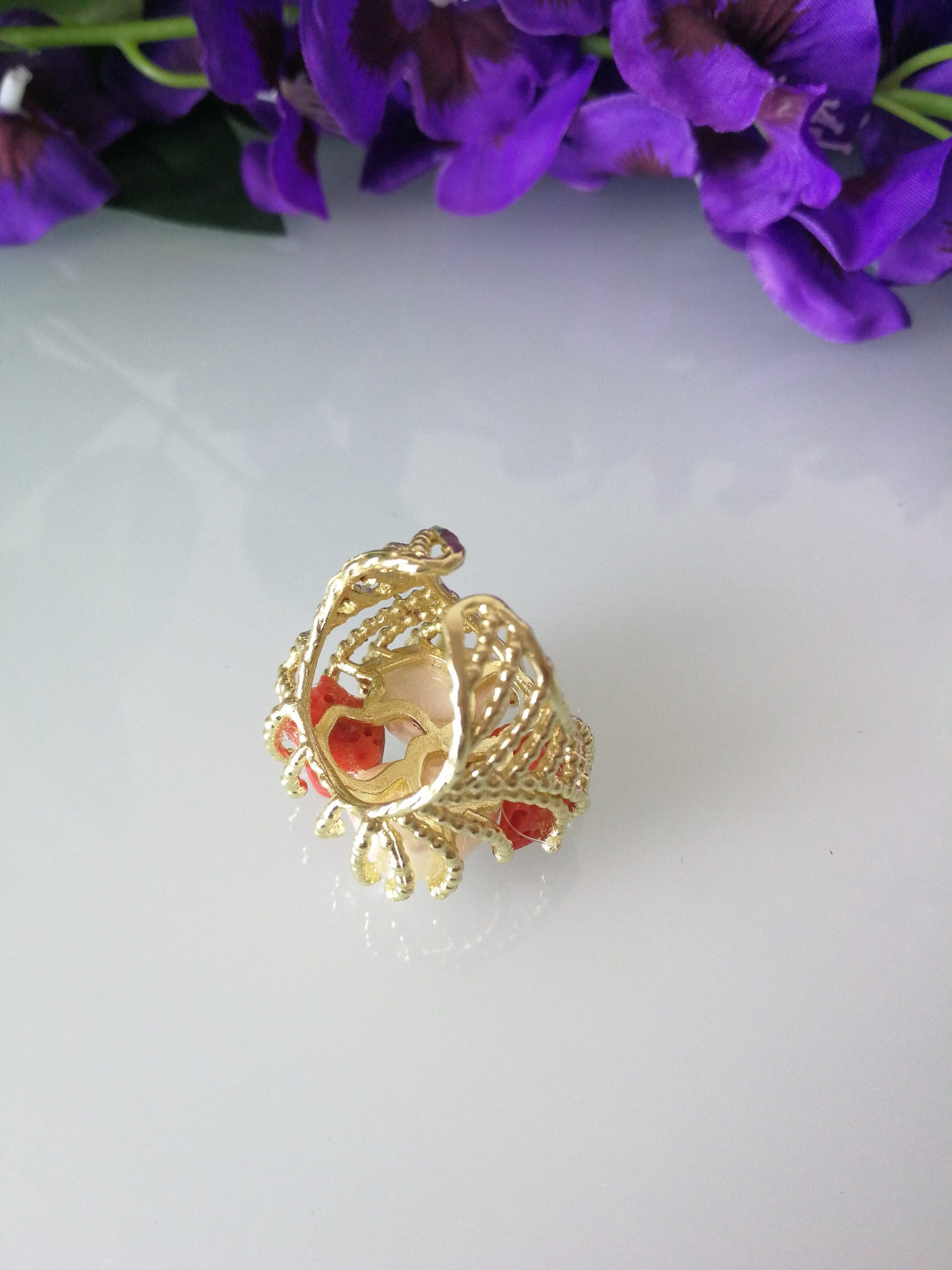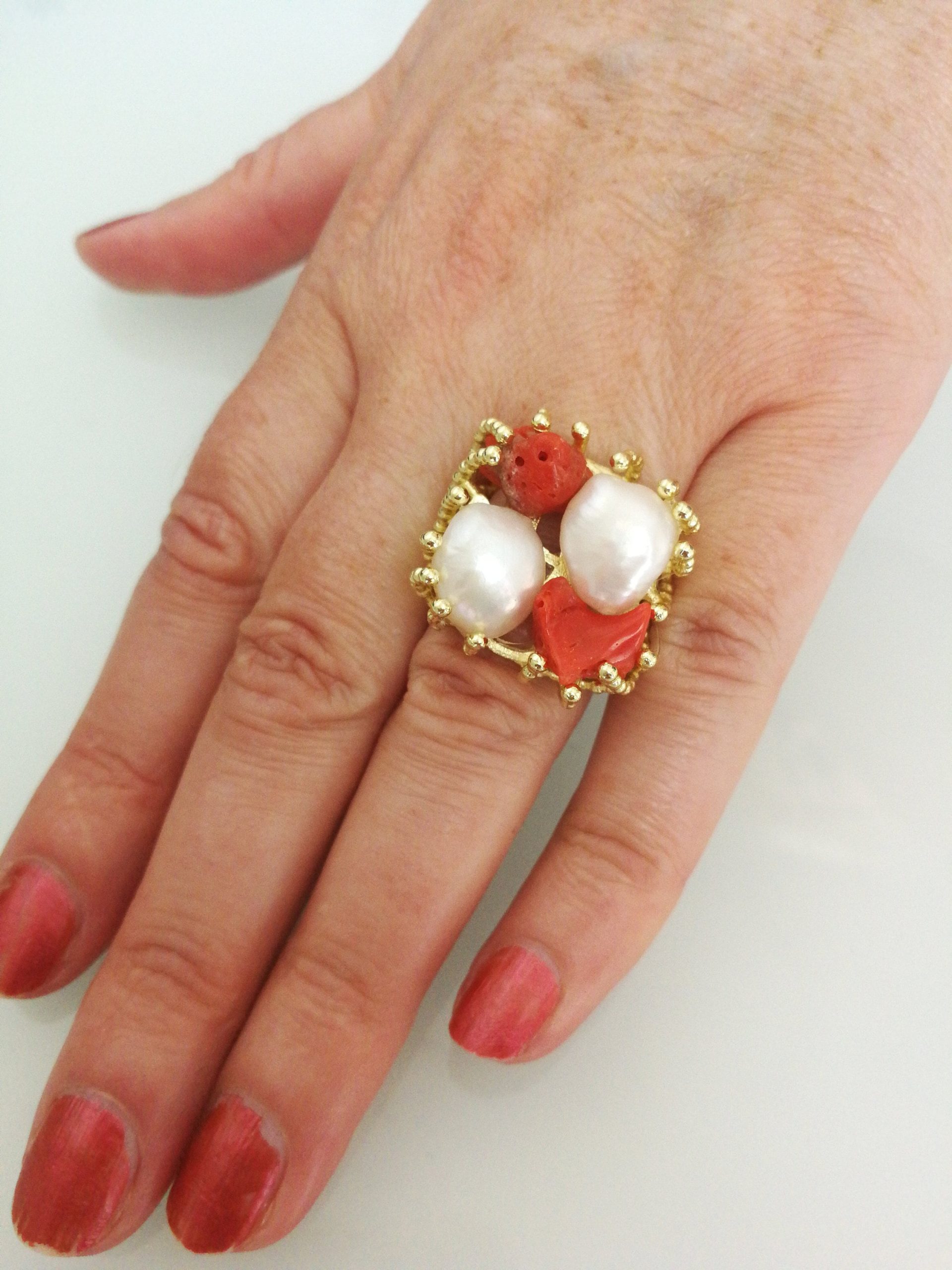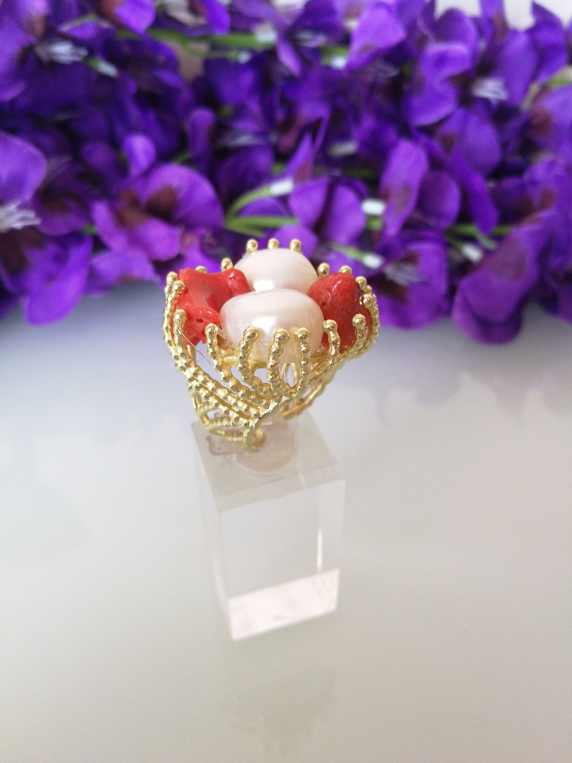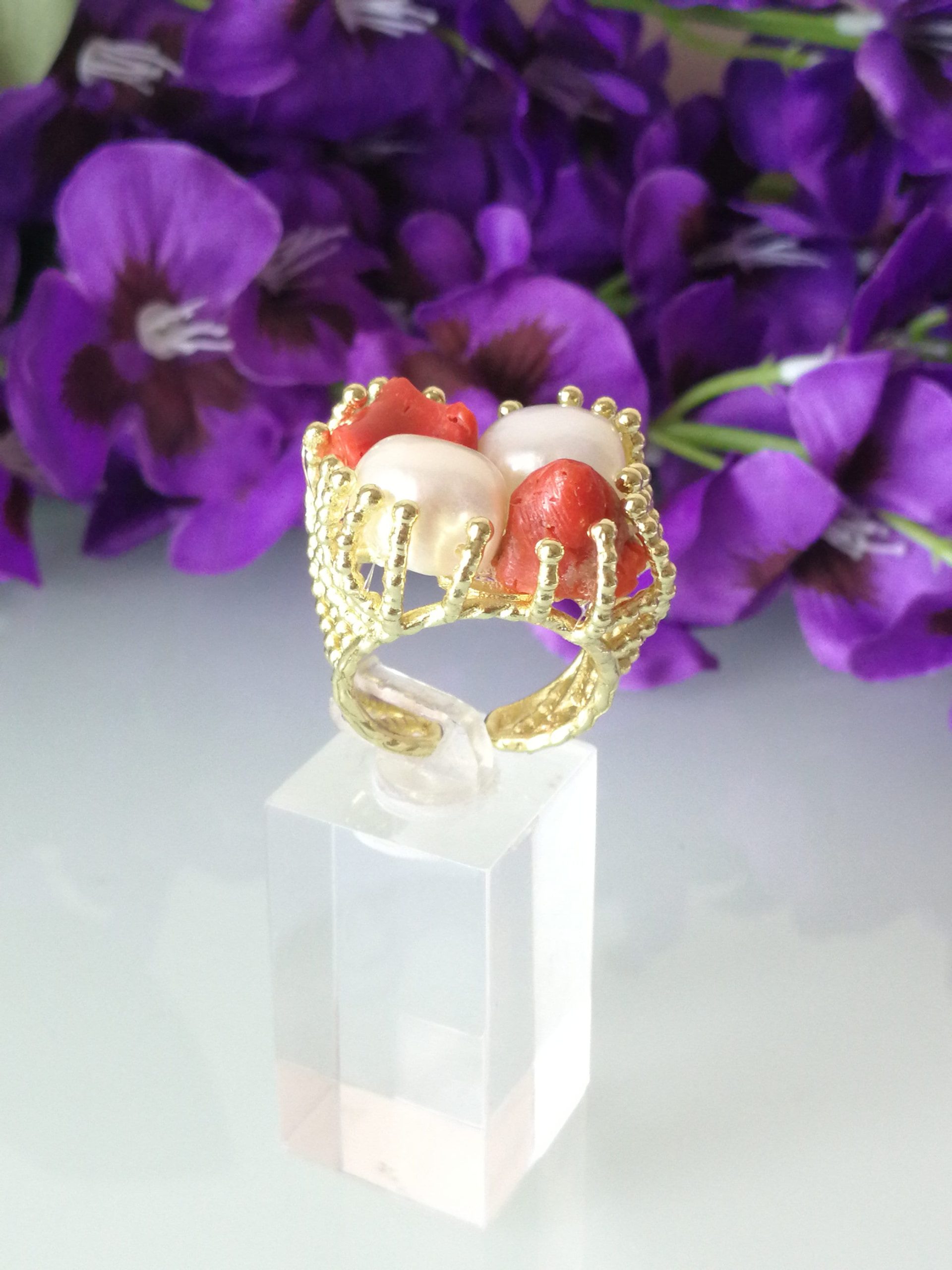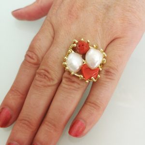 Anello particolare con corallo rosso naturale del mediterraneo, perle naturale bianca barocca , montatura in ottone dorato a lavorazione artigianale . Misura delle pietre 2×2 cm. Misura anello regolabile.