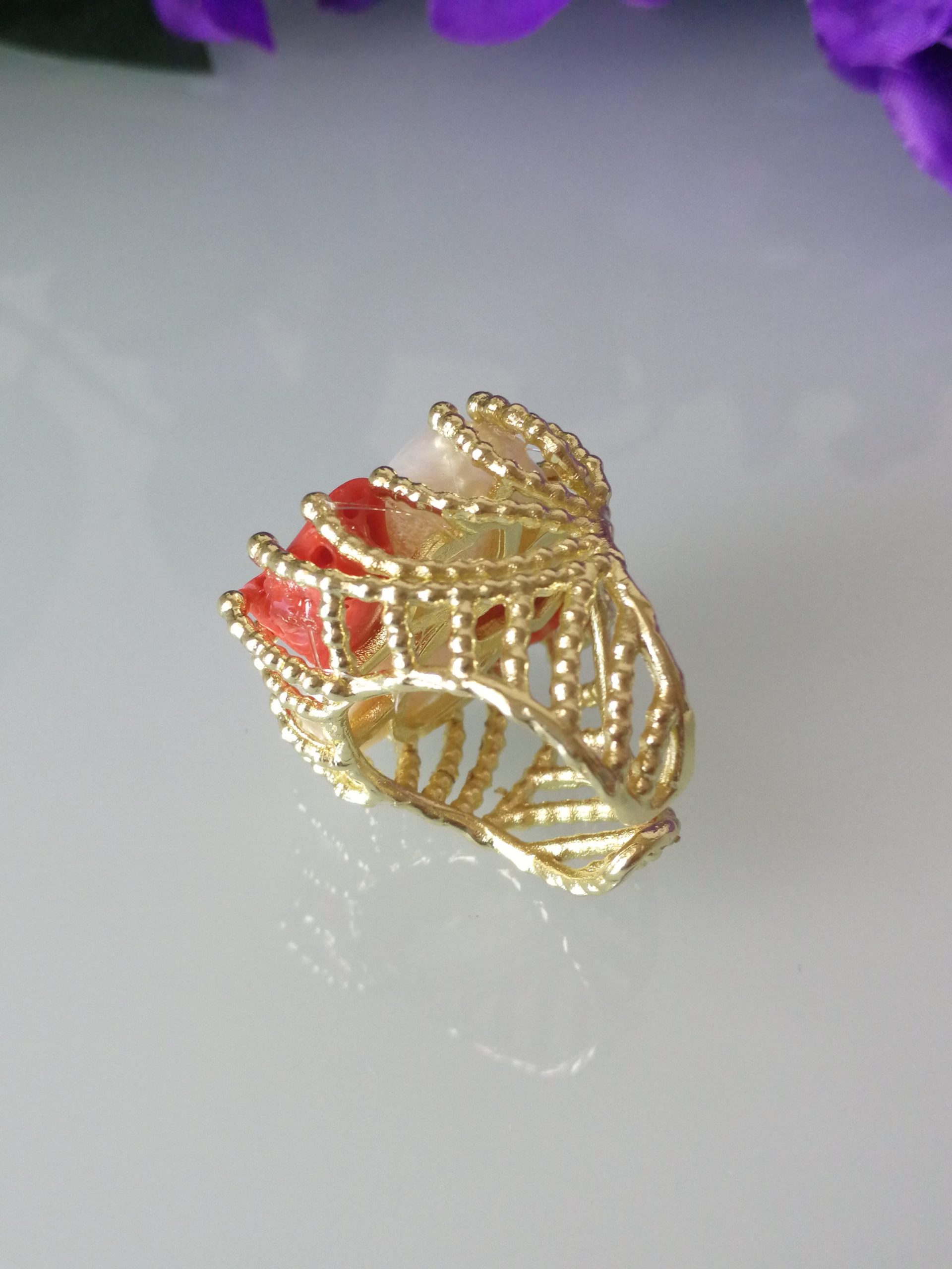 Anello rosa pasta di corallo rosso e ottone dorato , anello maxi