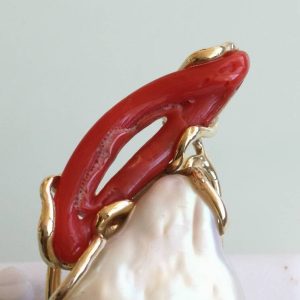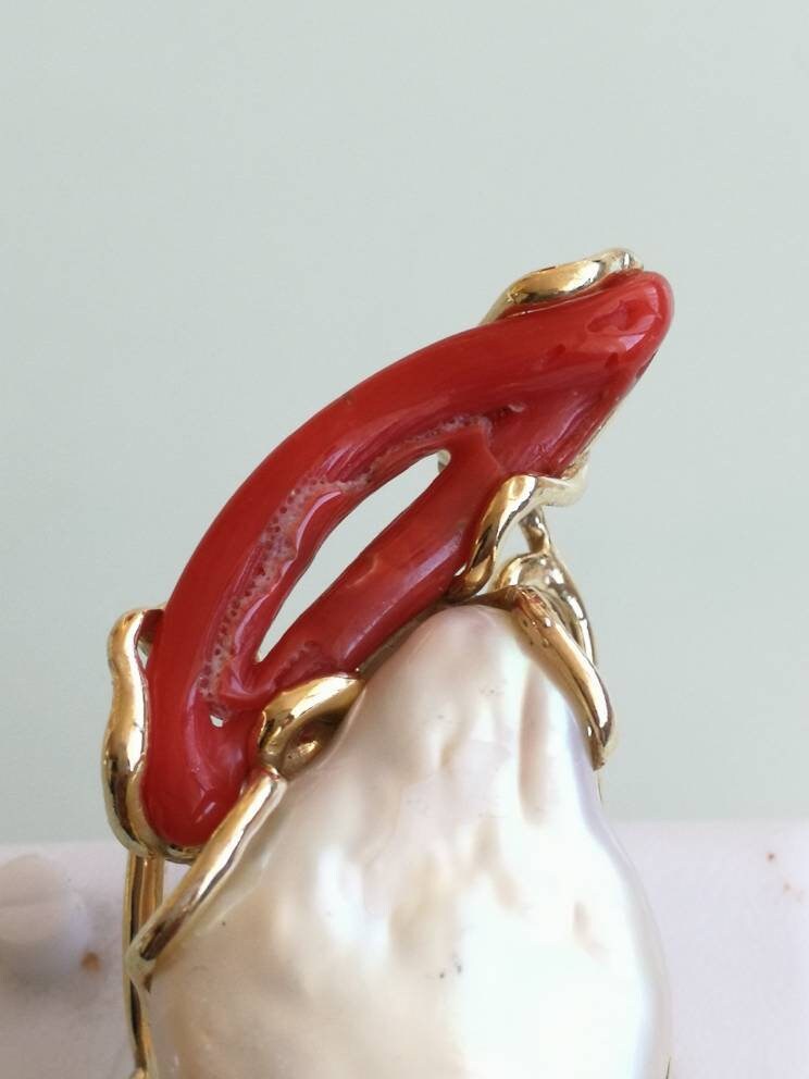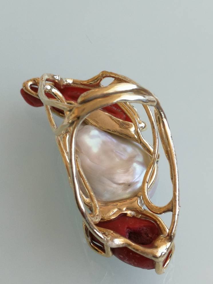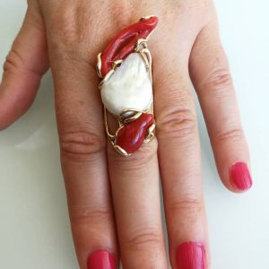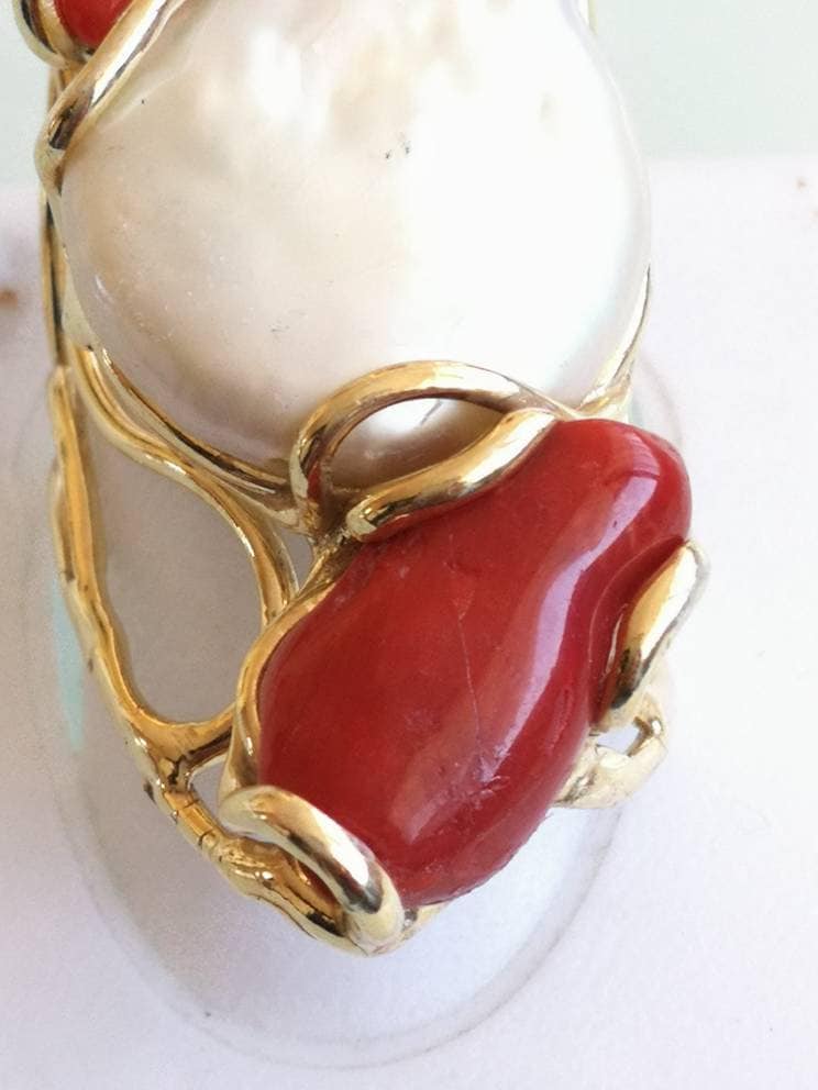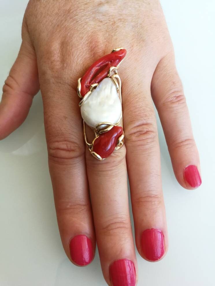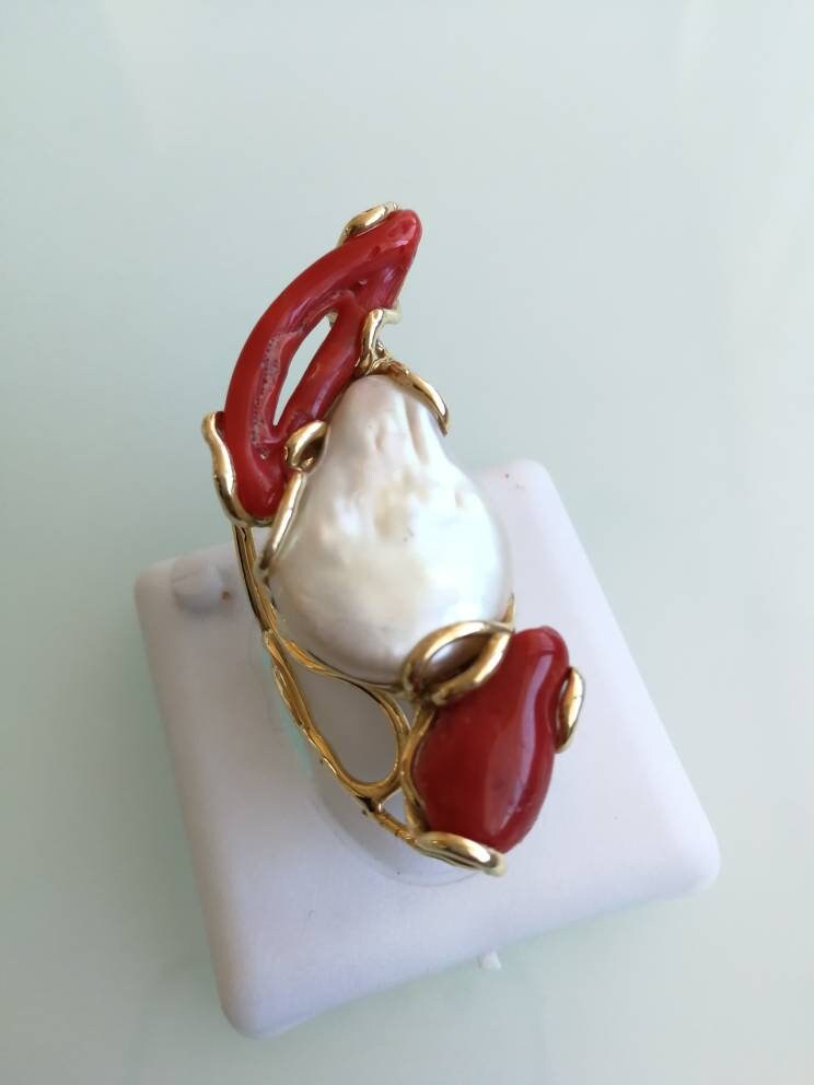 Anello esclusivo grande perla naturale barocca bianca e due coralli naturale rosso di forma particolare , montatura in argento placcata oro .Misura pietre 5 cm. Misura anello regolabile.