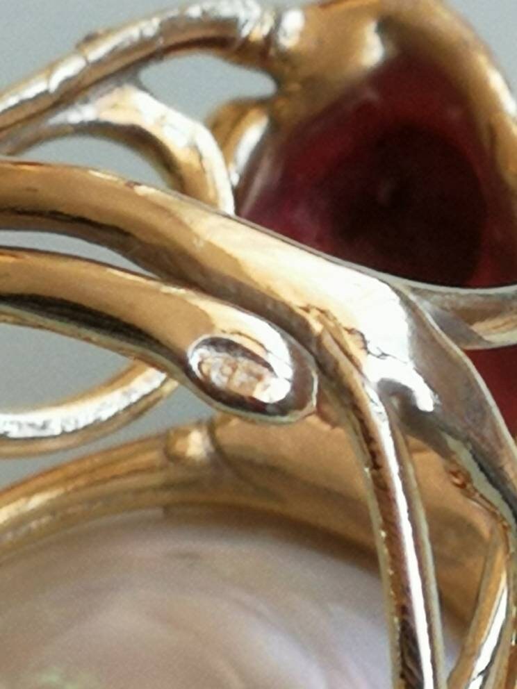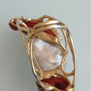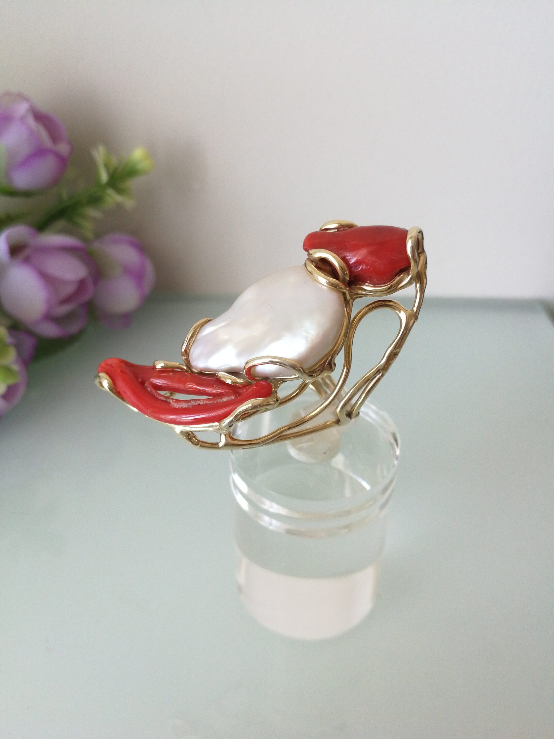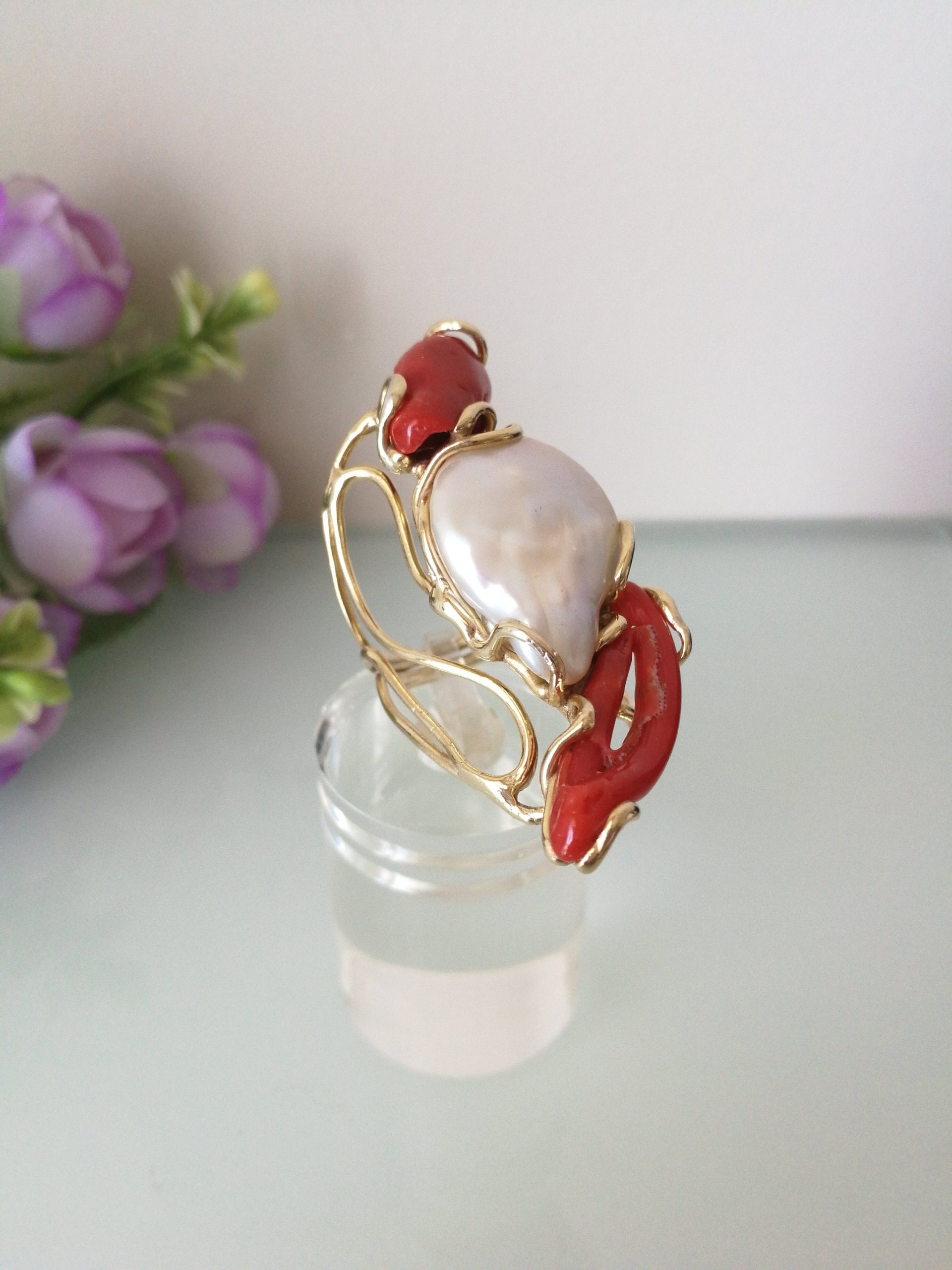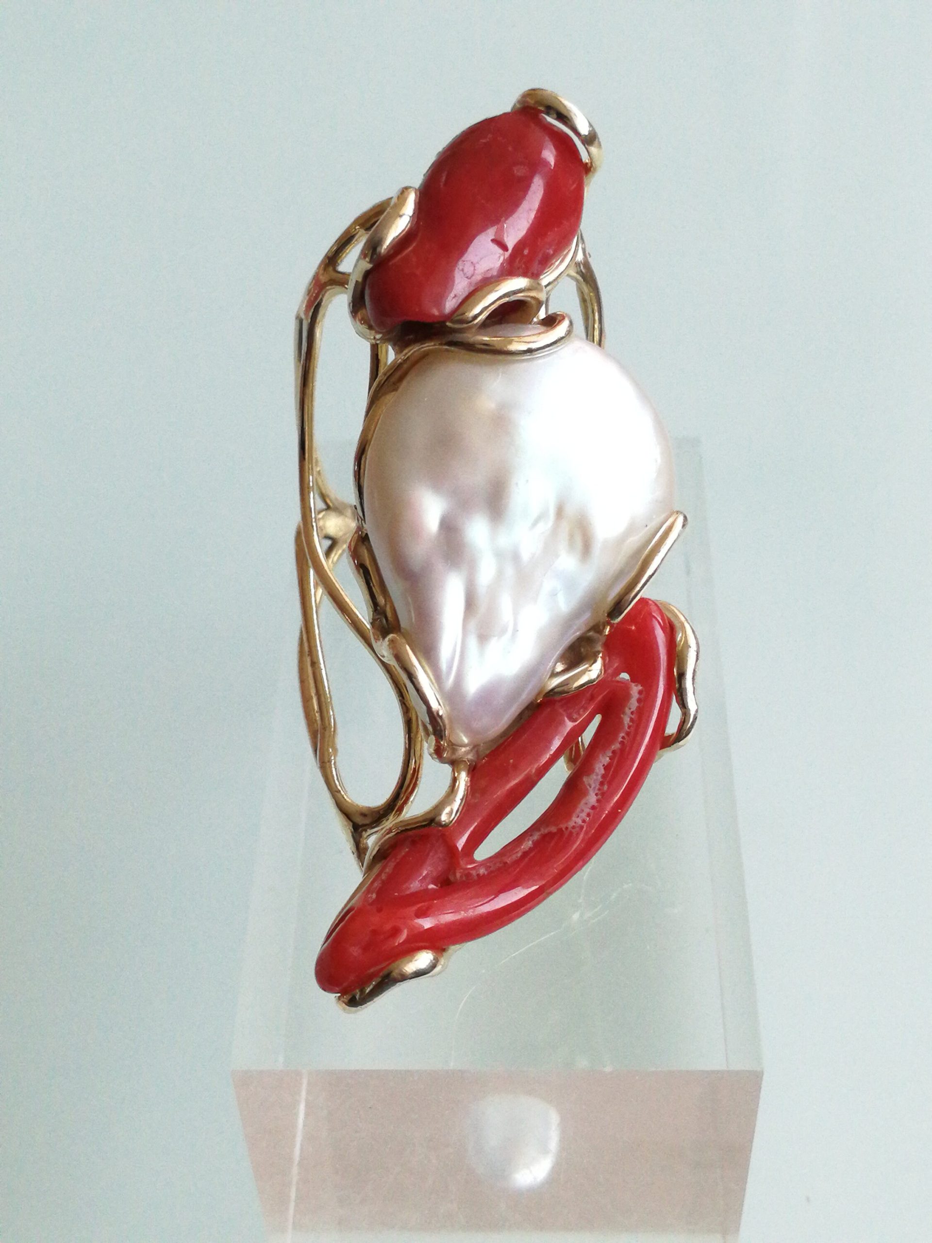 Anello esclusivo grande perla naturale barocca bianca e due coralli naturale rosso di forma particolare , montatura in argento placcata oro .Misura pietre 5 cm. Misura anello regolabile.