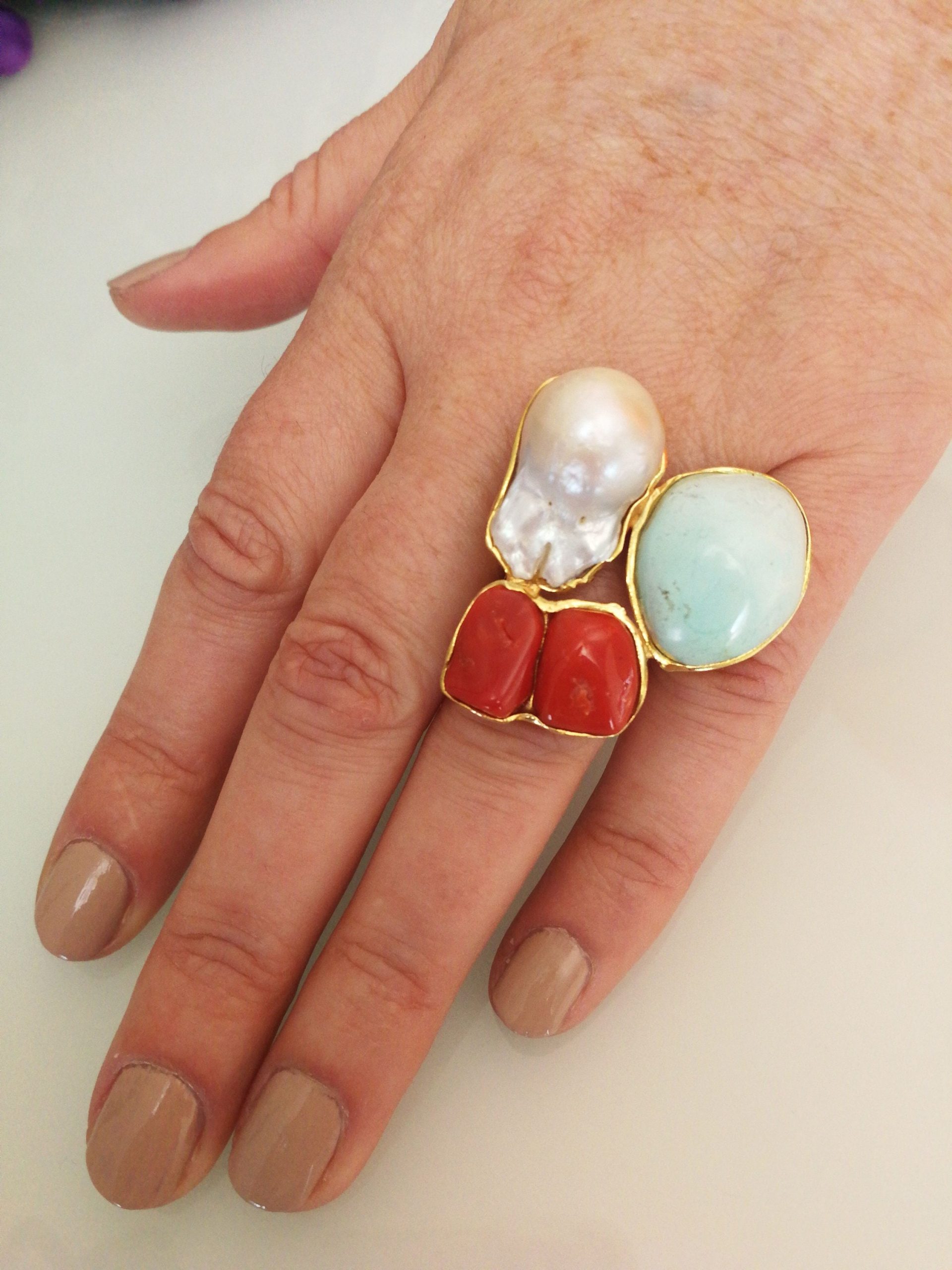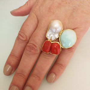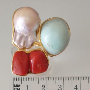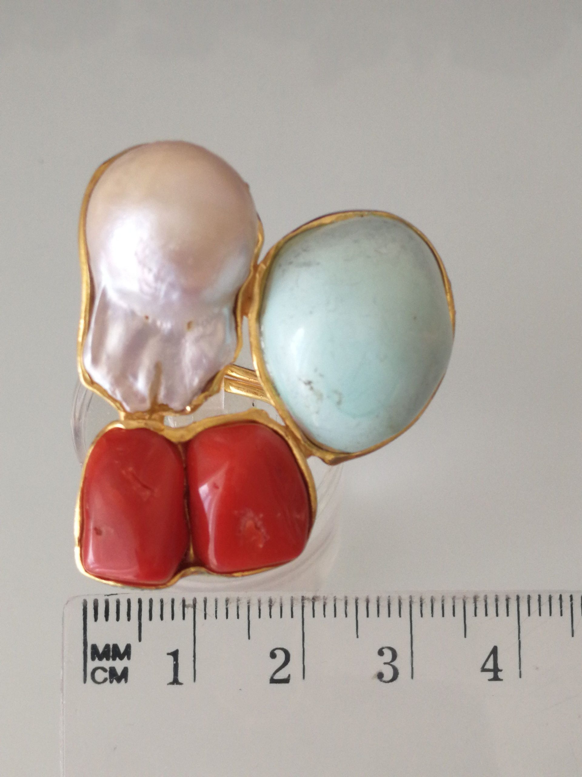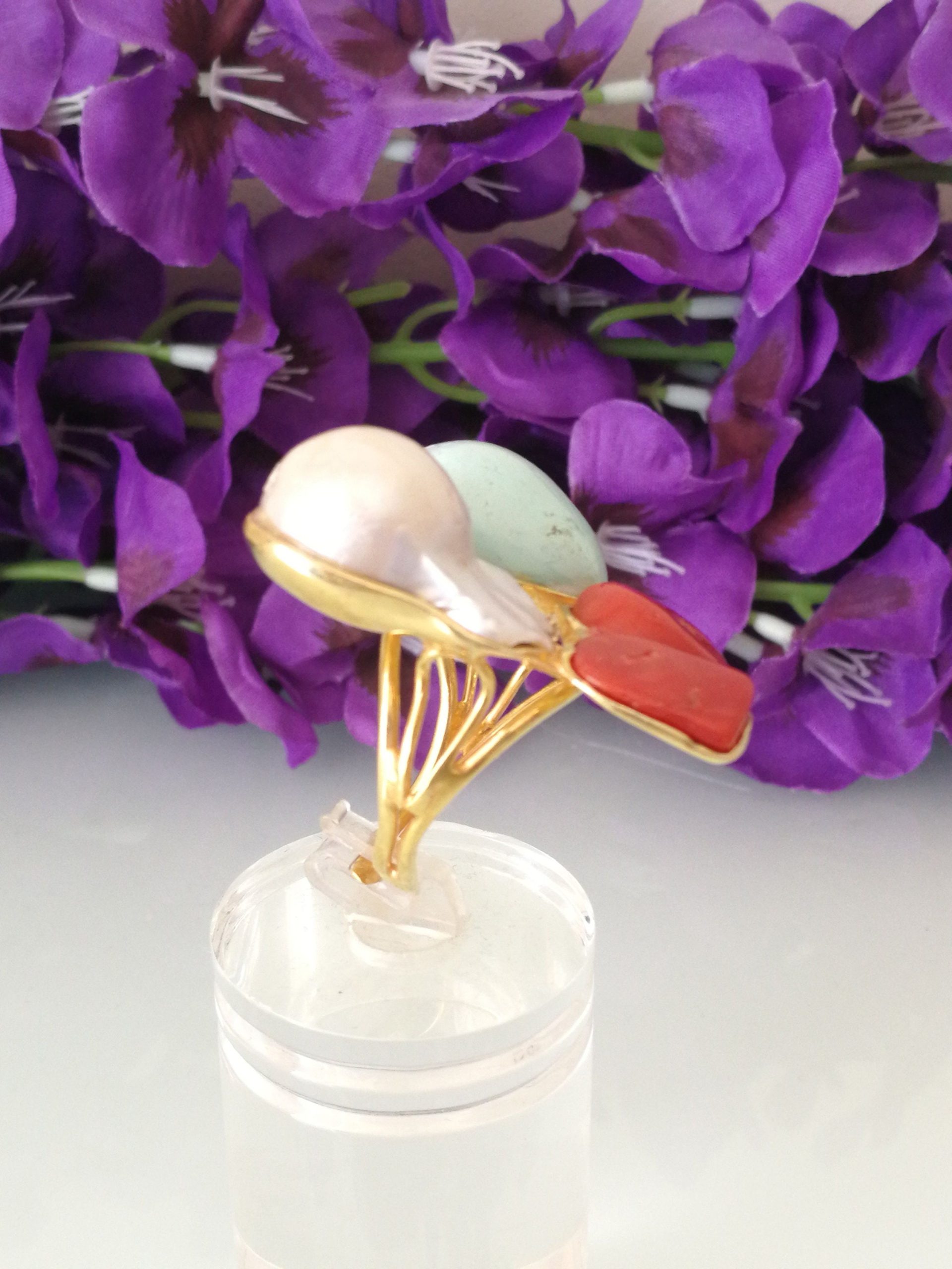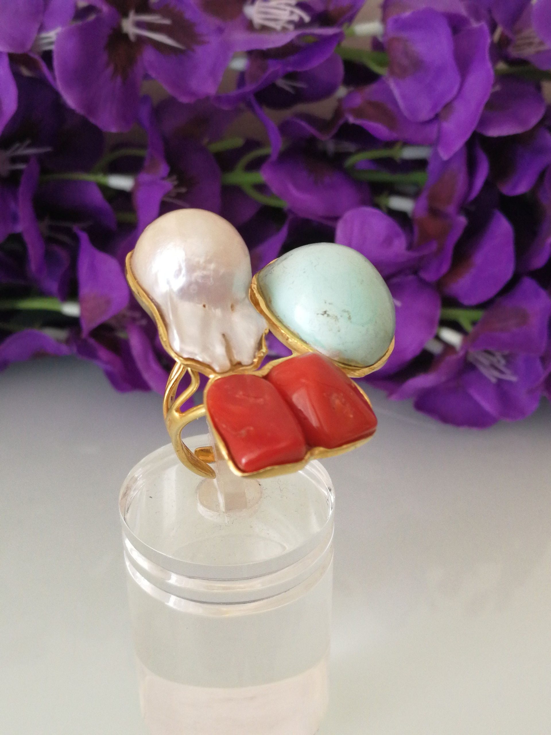 Anello elegante con perla naturale bianca, due coralli rosso naturale del mediterraneo con pietra di turchese incastonati in montatura artigianale in argento placcato oro . Misura anello regolabile.