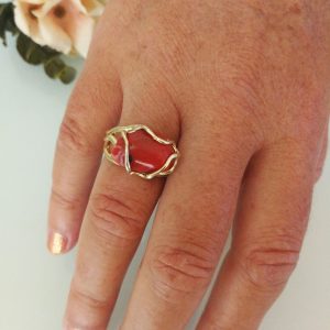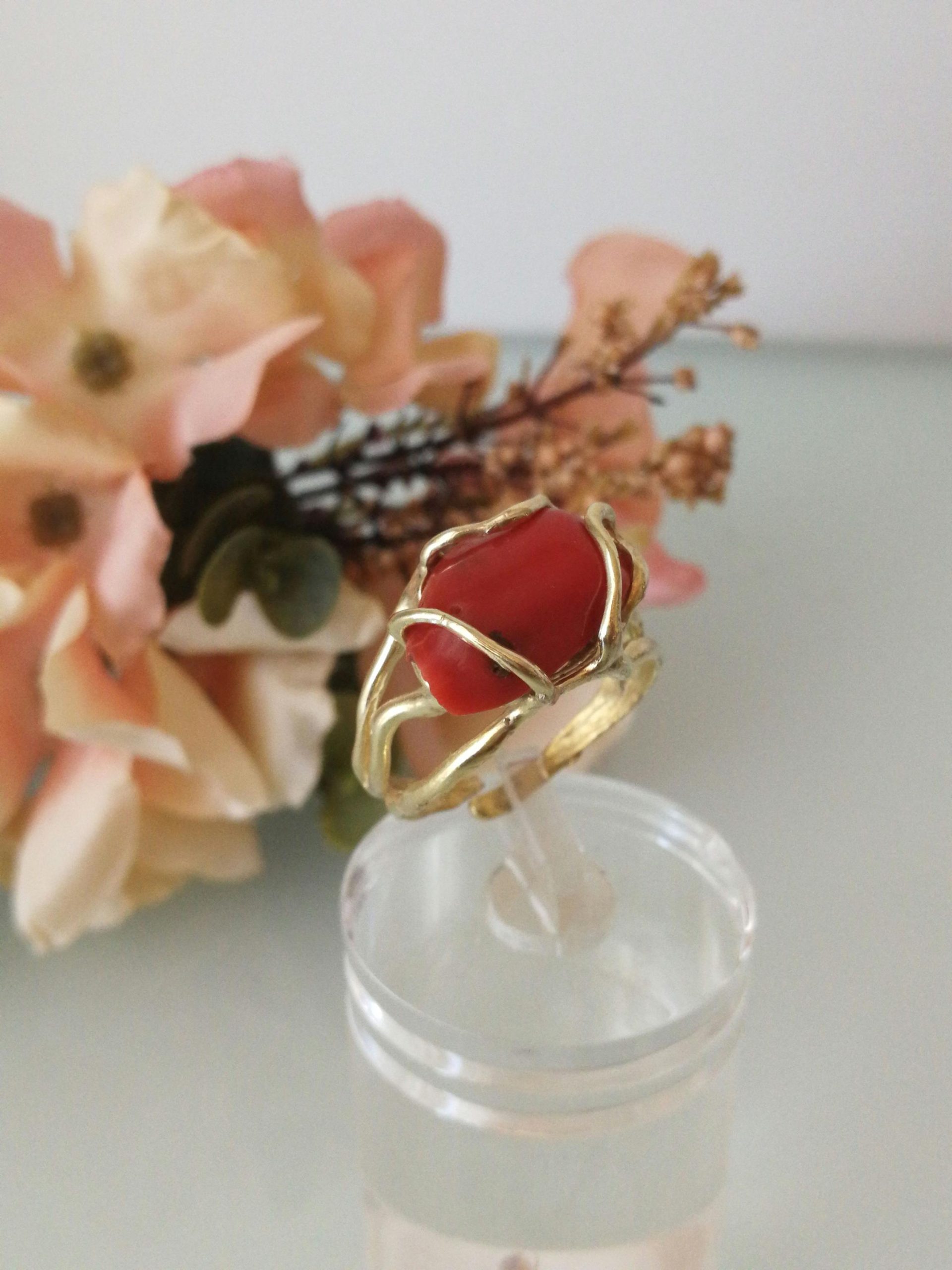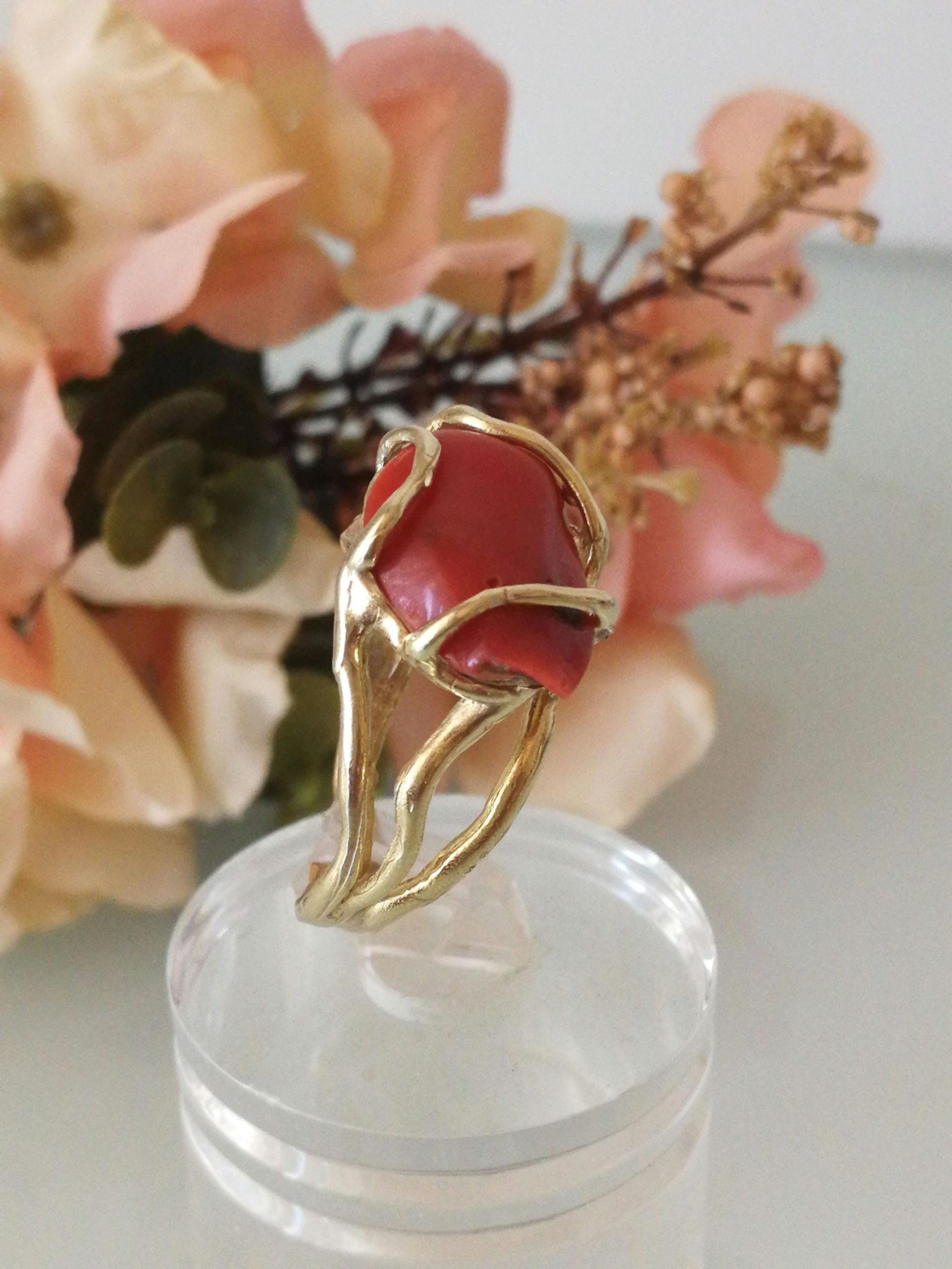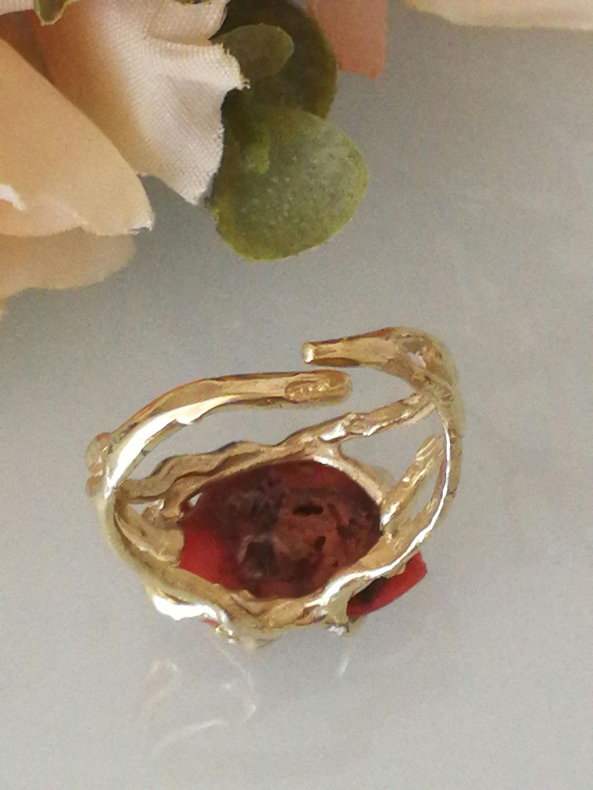 Anello elegante con corallo rosso naturale del mediterraneo a cabochon , montatura in argento placcato oro in stile Liberty .Misura corallo 1,5 cm. Misura anello regolabile.