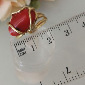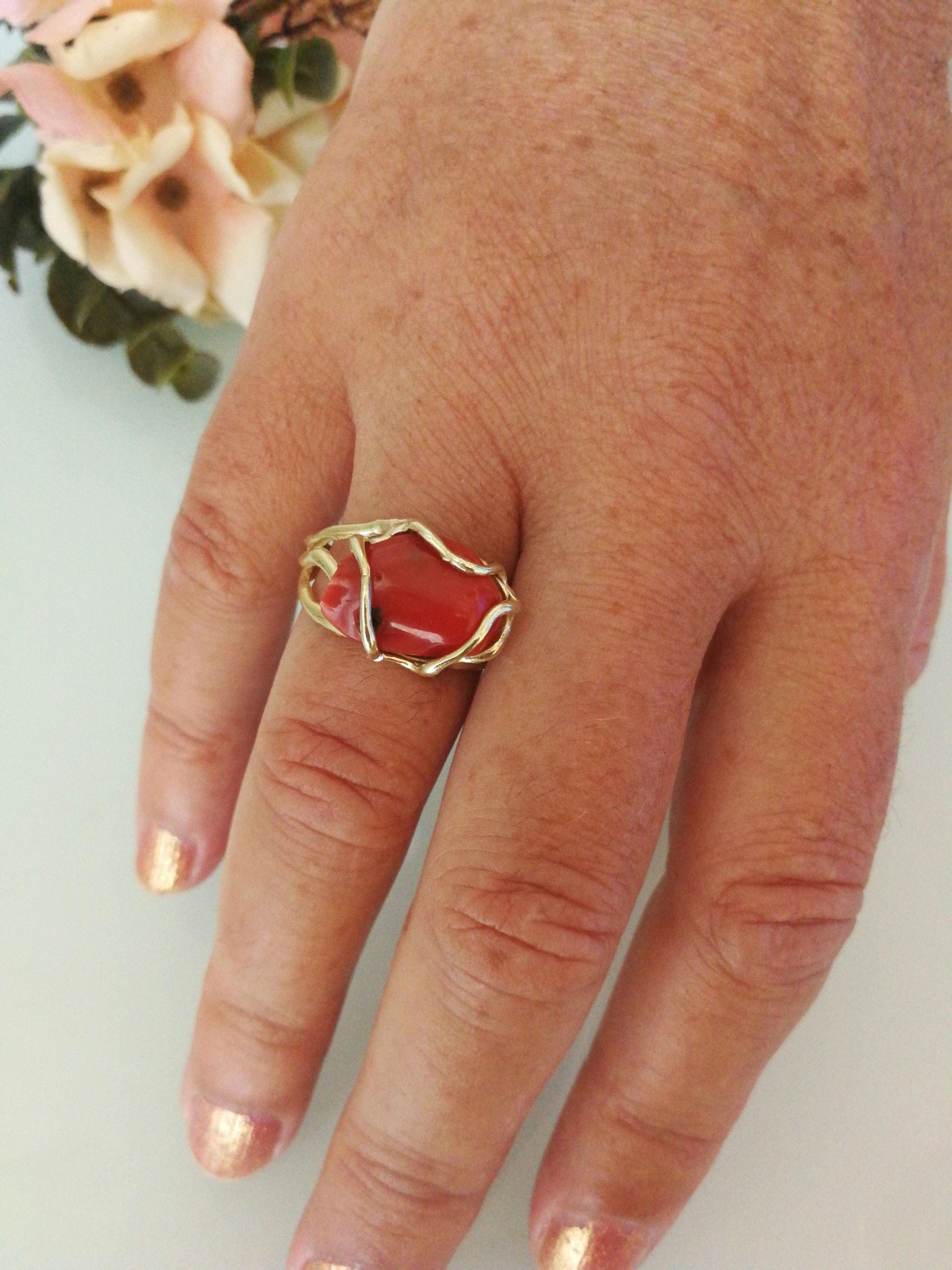 Anello corallo rosso naturale mediterraneo e argento 925 placcato oro , gioielli italiani