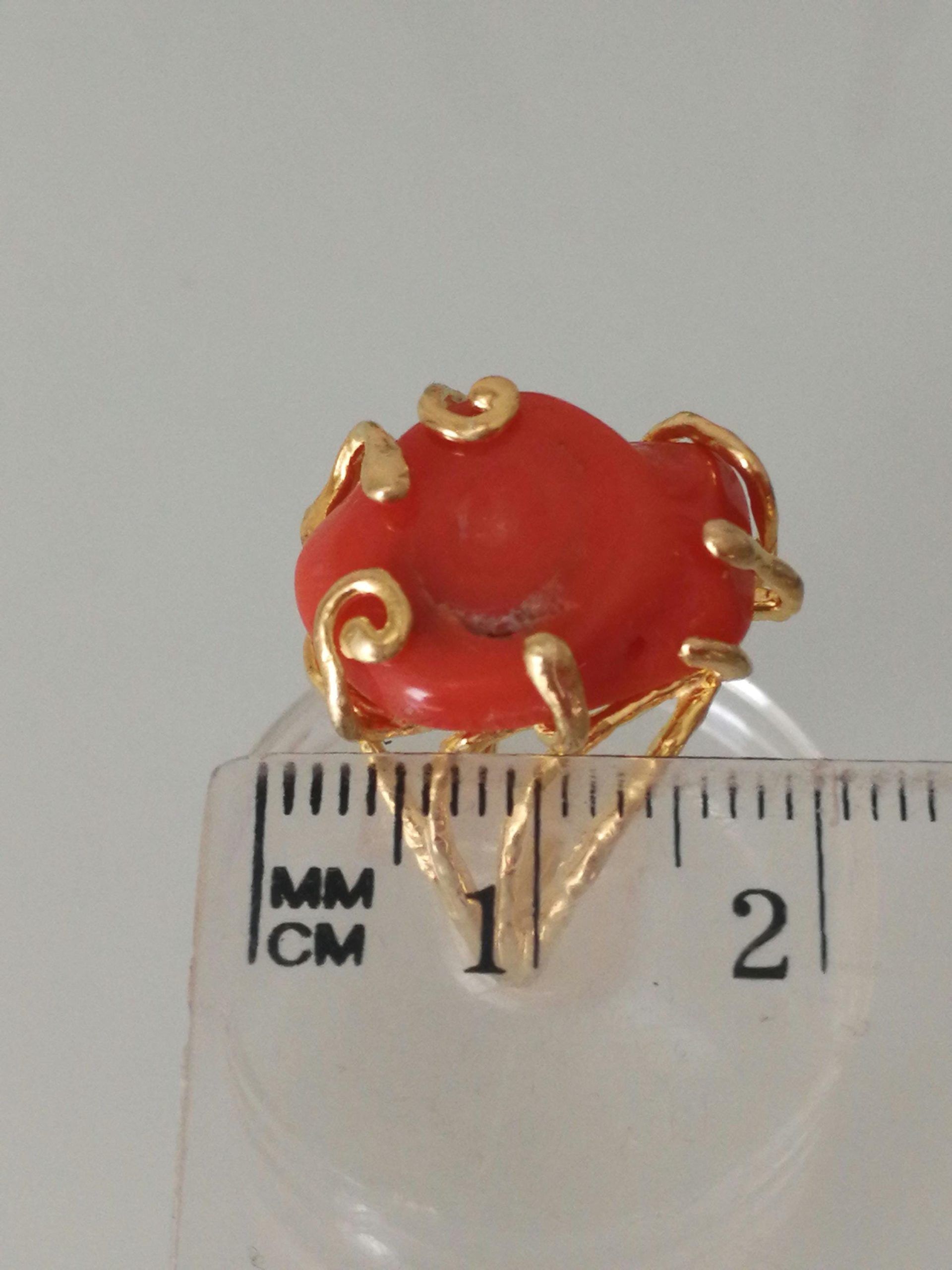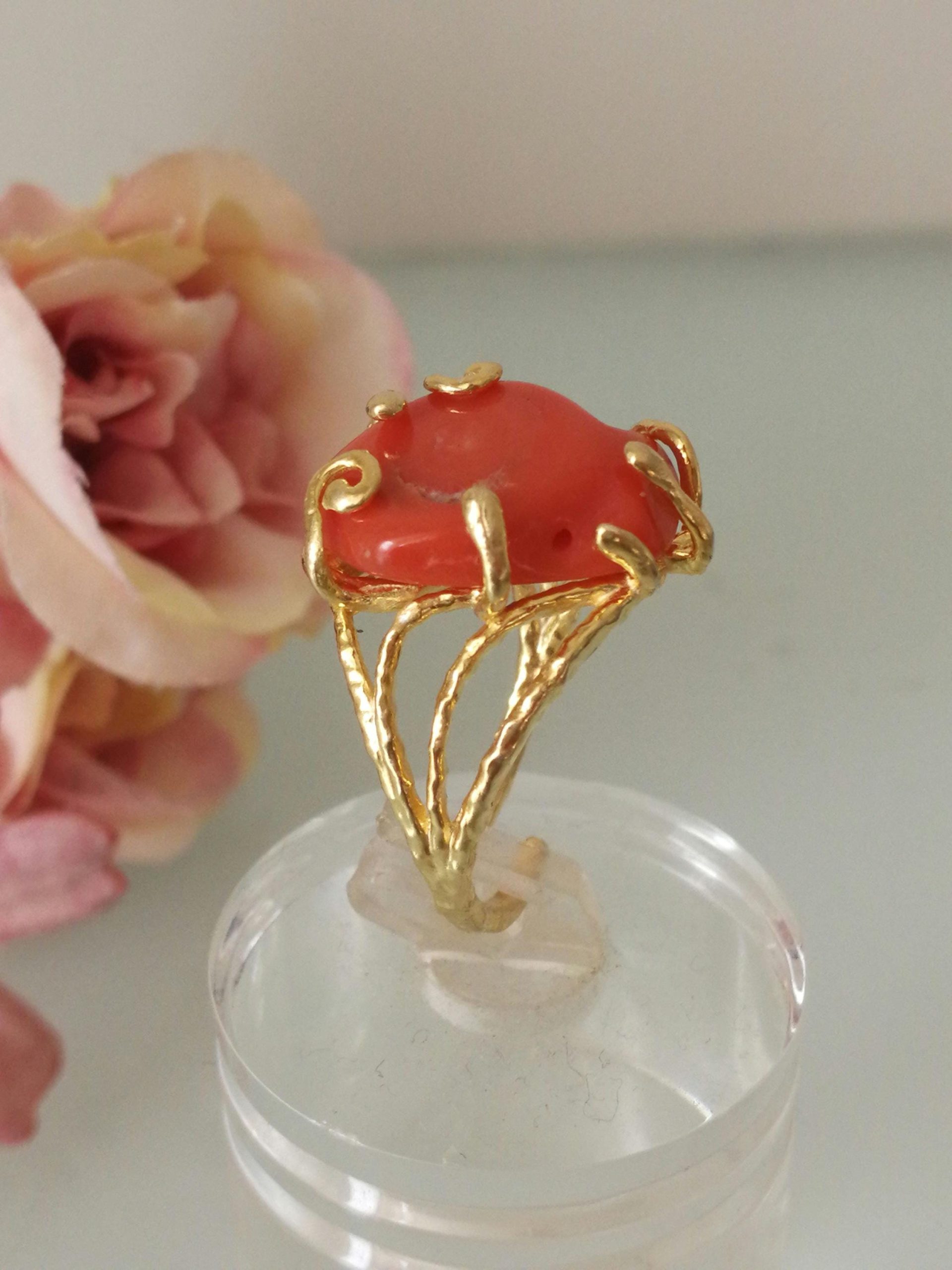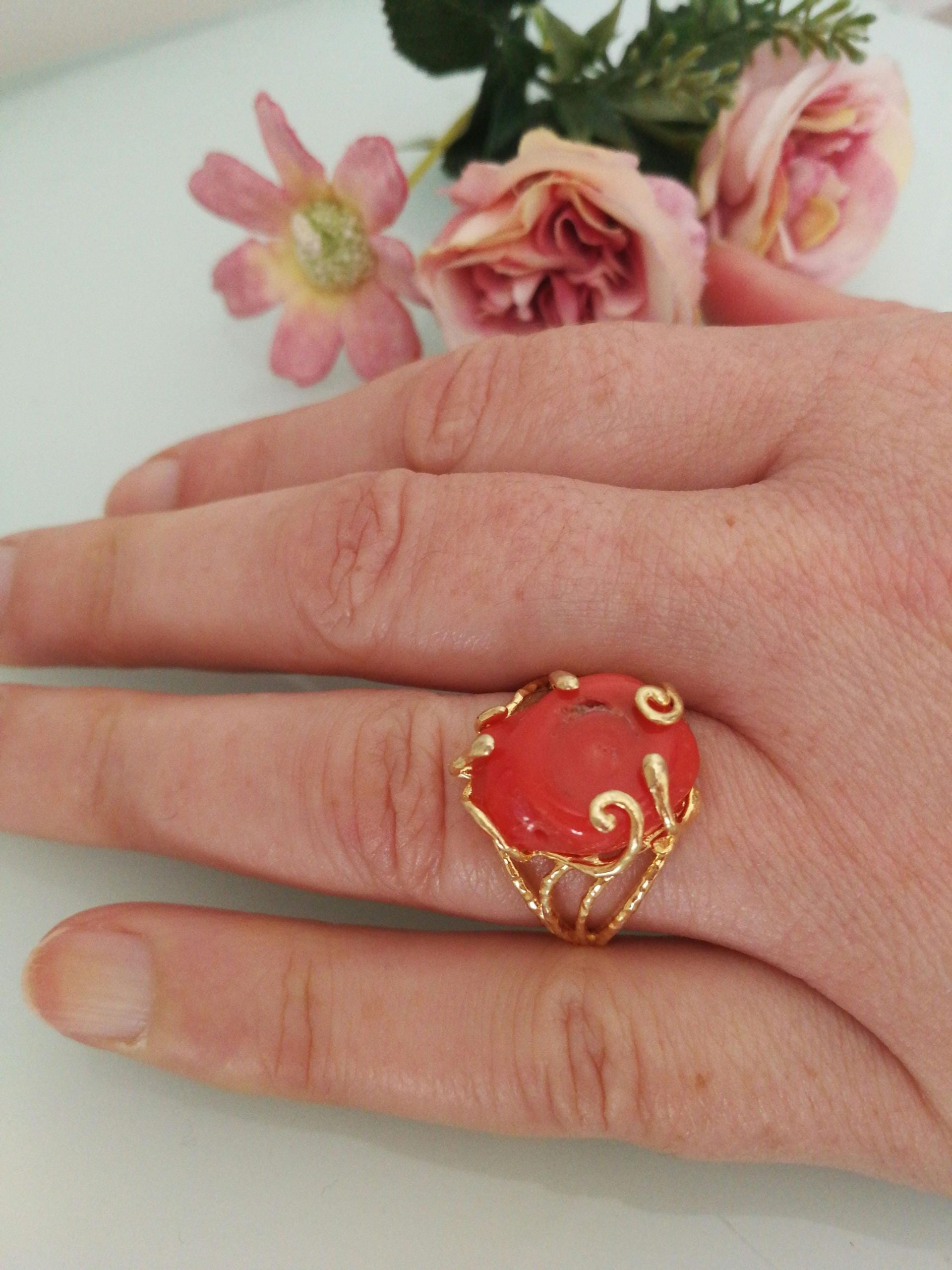 Anello elegante con corallo rosso naturale del mediterraneo a cabochon , montatura in argento placcato oro in stile Liberty .Misura corallo 2 cm. Misura anello regolabile.