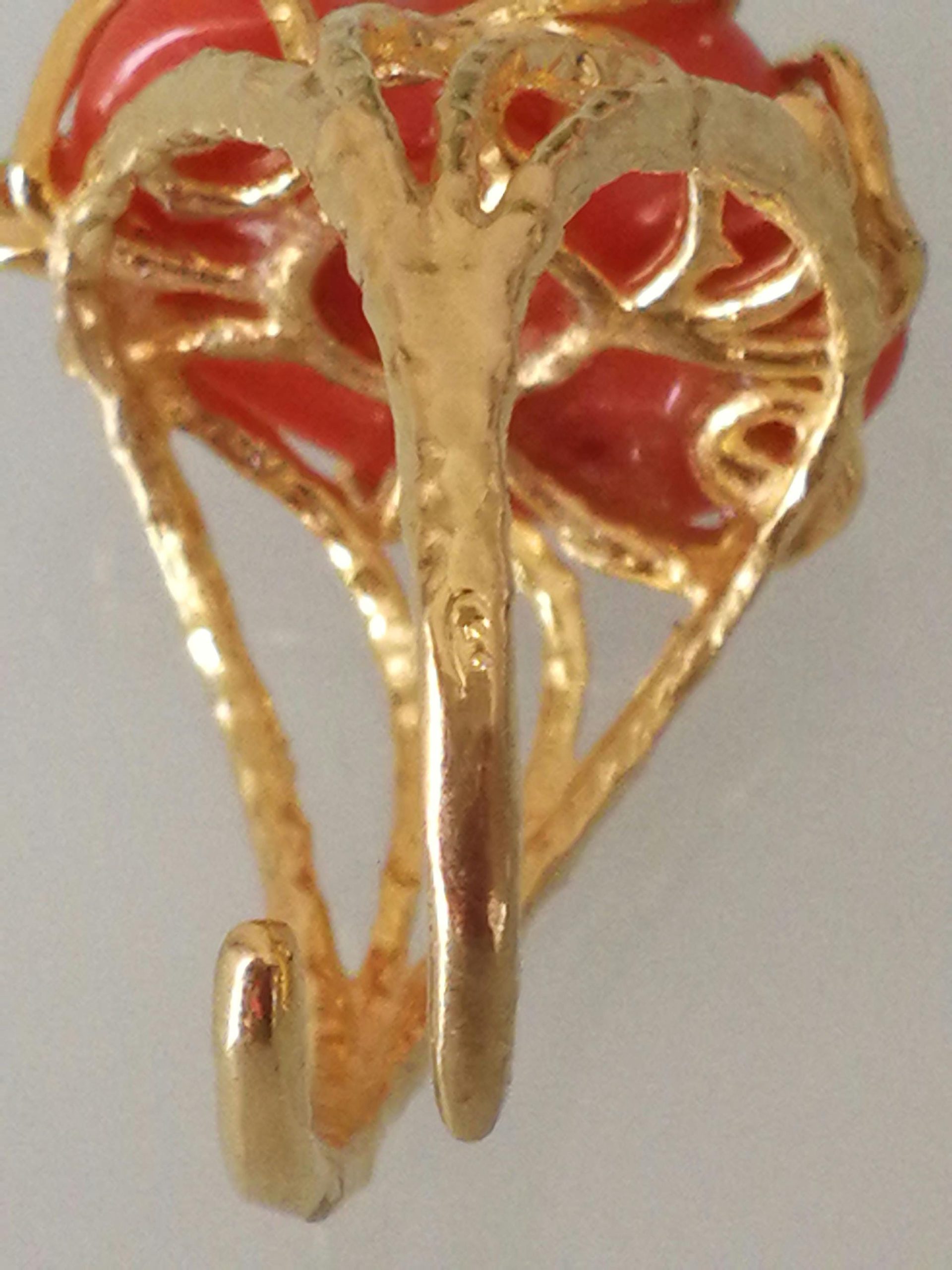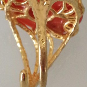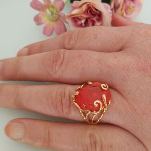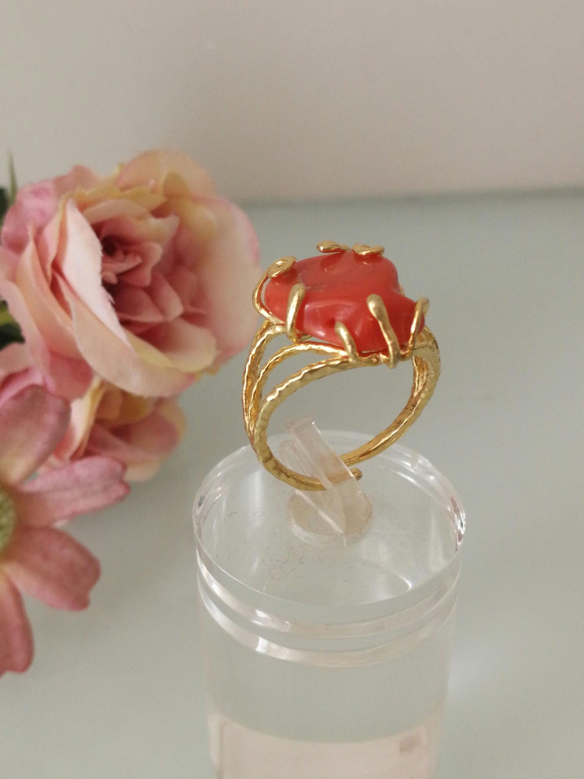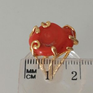 Anello elegante con corallo rosso naturale del mediterraneo a cabochon , montatura in argento placcato oro in stile Liberty .Misura corallo 2 cm. Misura anello regolabile.
