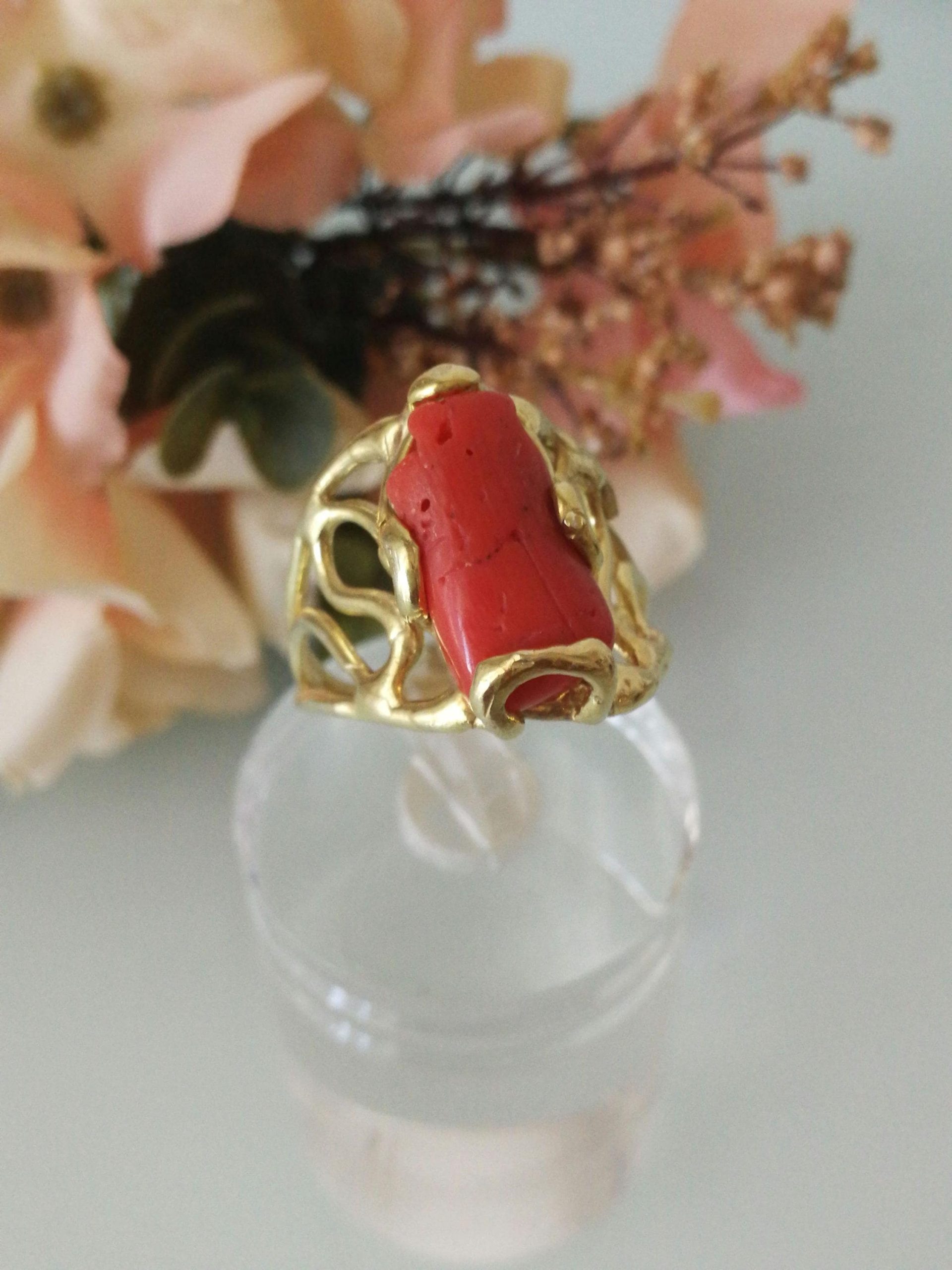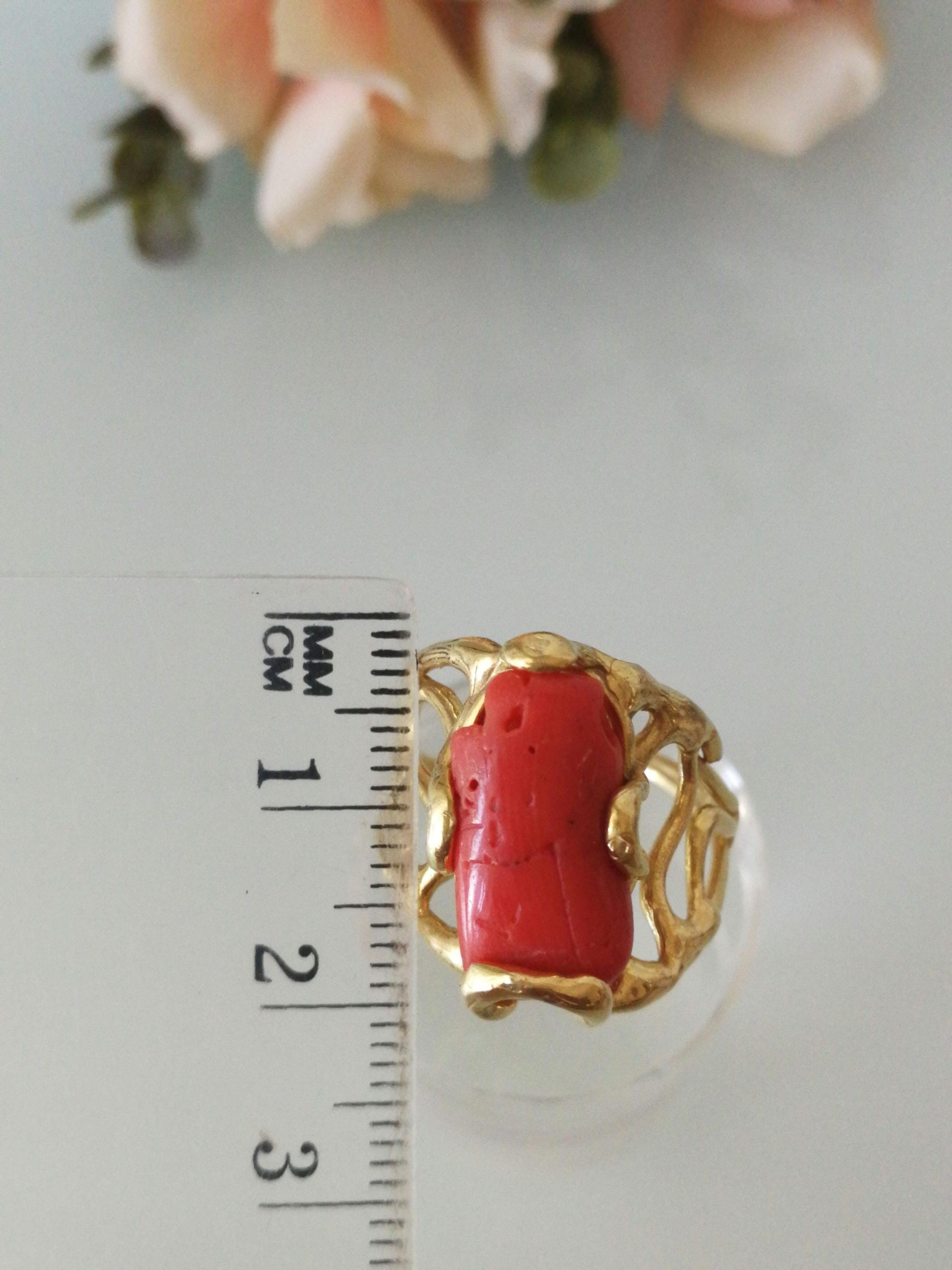 Anello corallo rosso naturale mediterraneo e argento 925 placcato oro , gioielli italiani