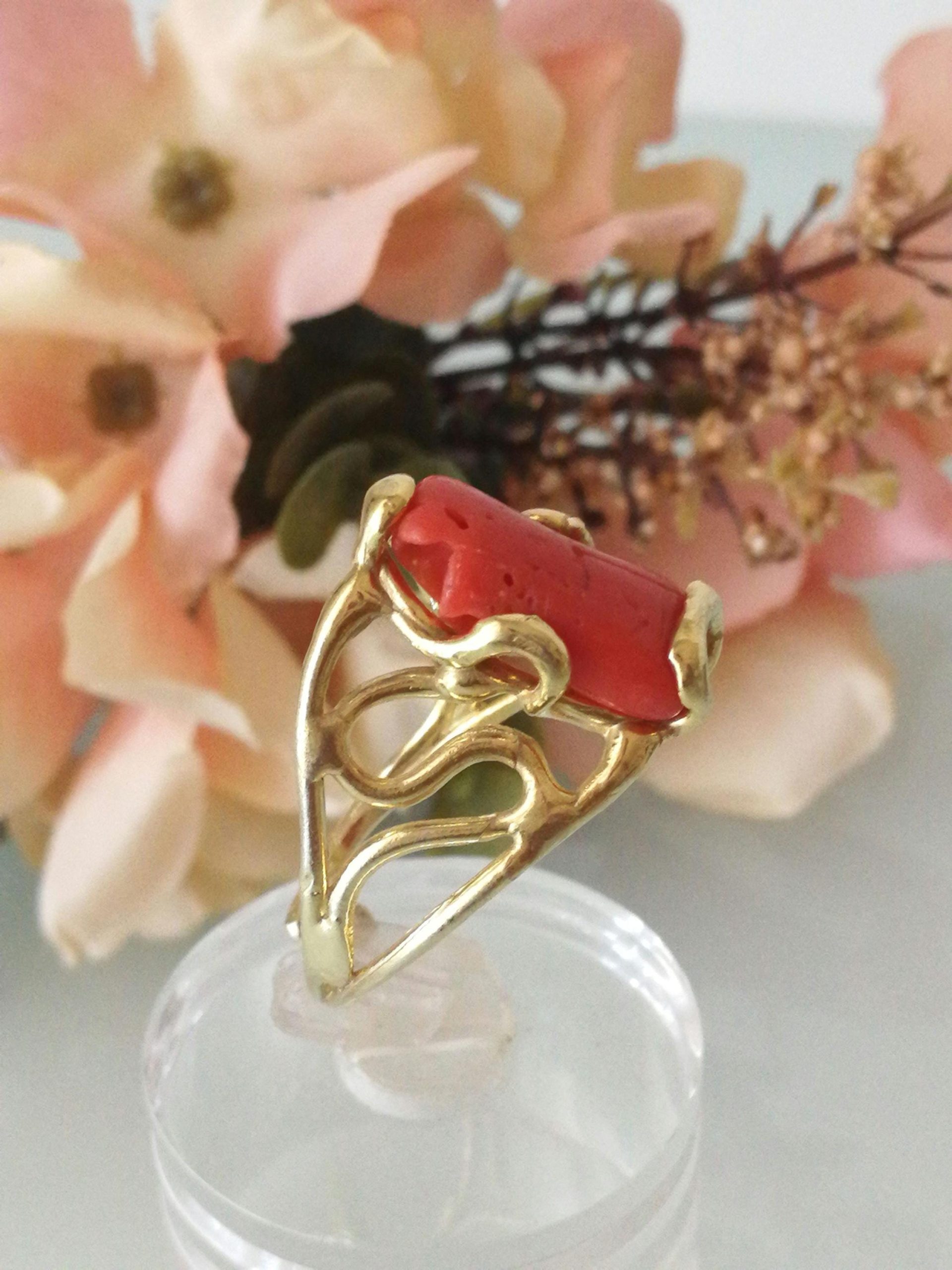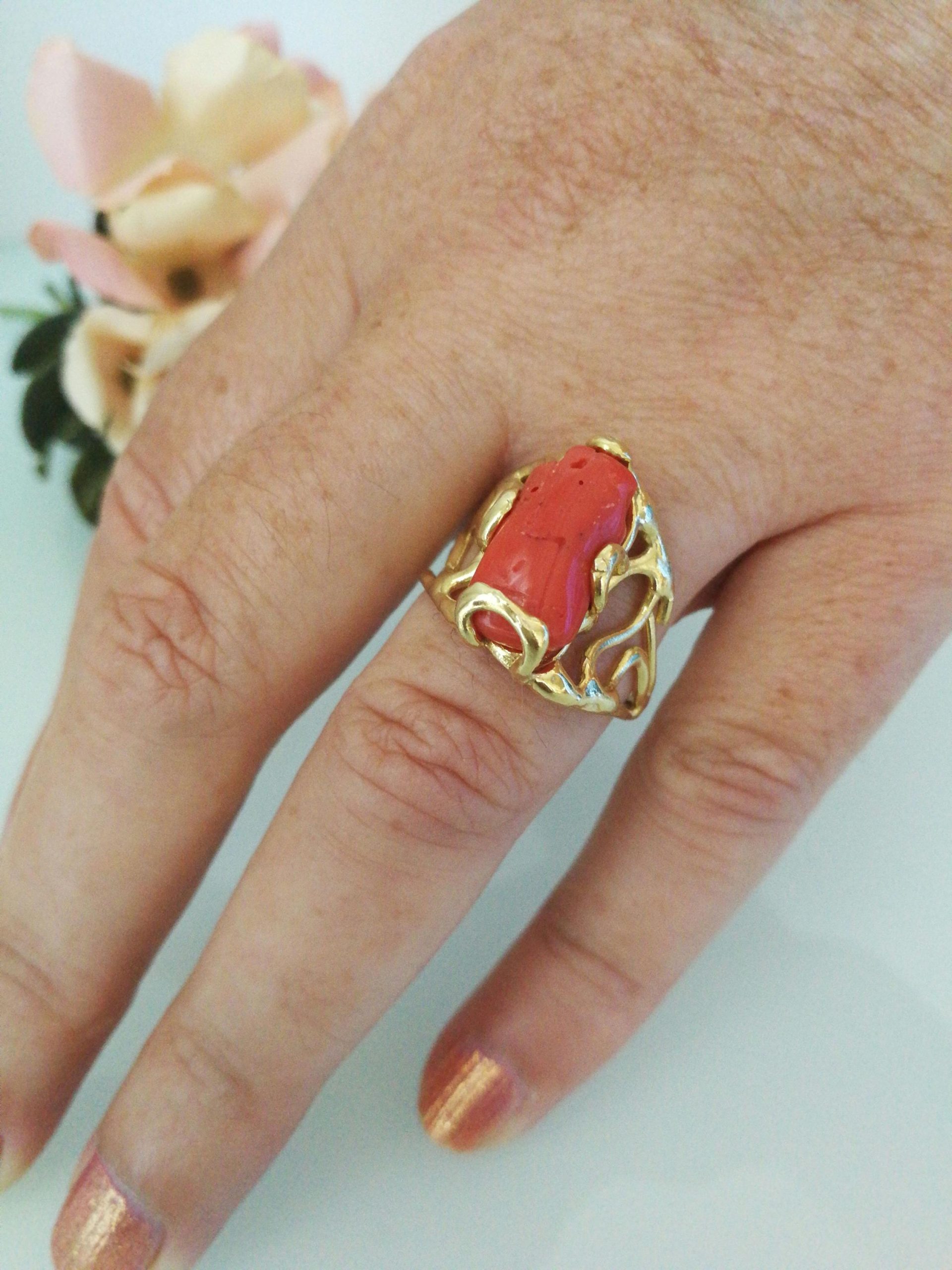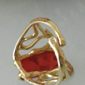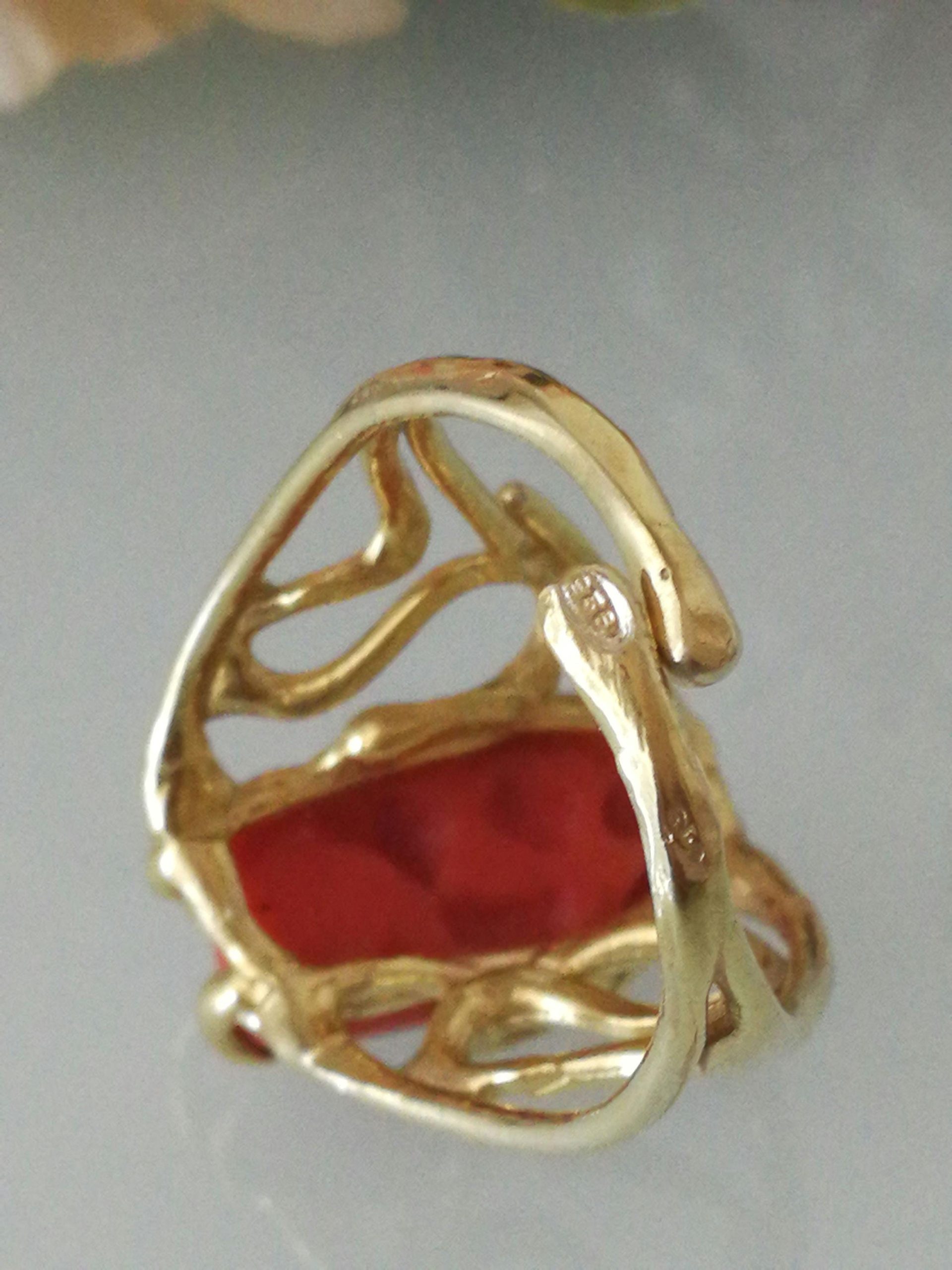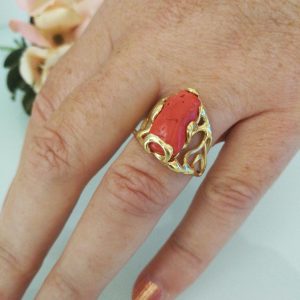 Anello elegante con corallo rosso naturale del mediterraneo a cabochon , montatura in argento placcato oro in stile Liberty .Misura corallo 2 cm. Misura anello regolabile.
