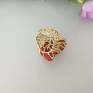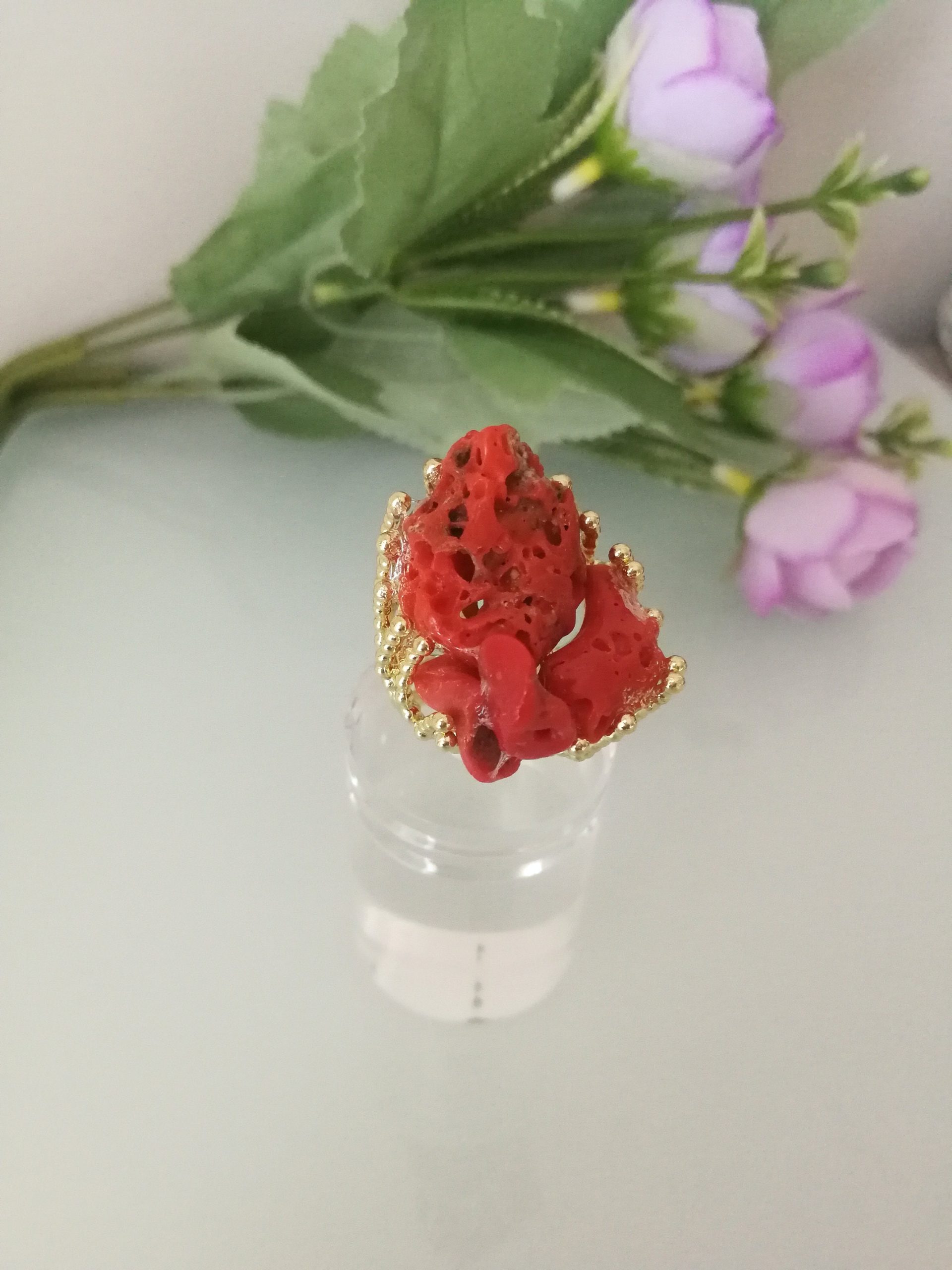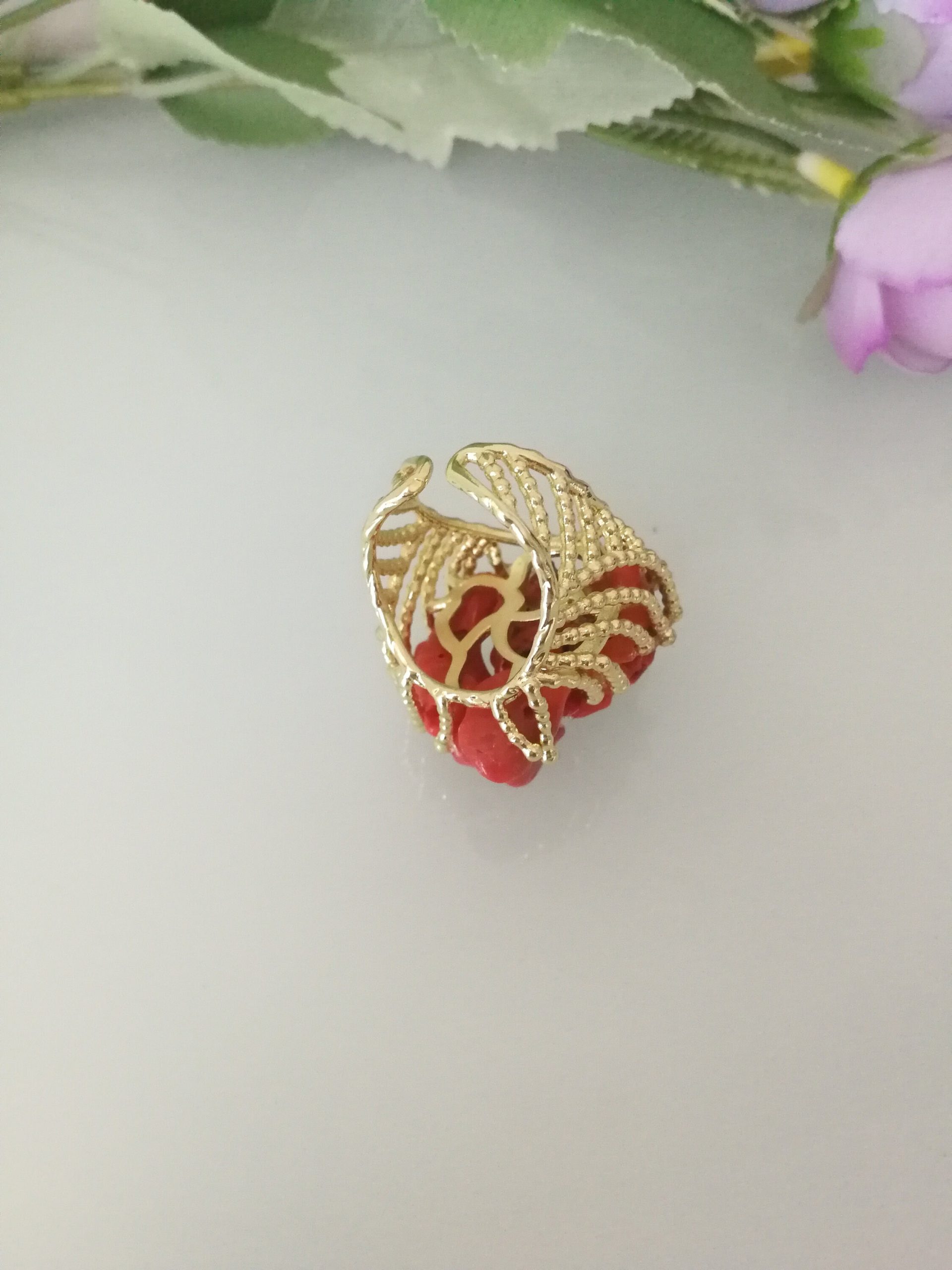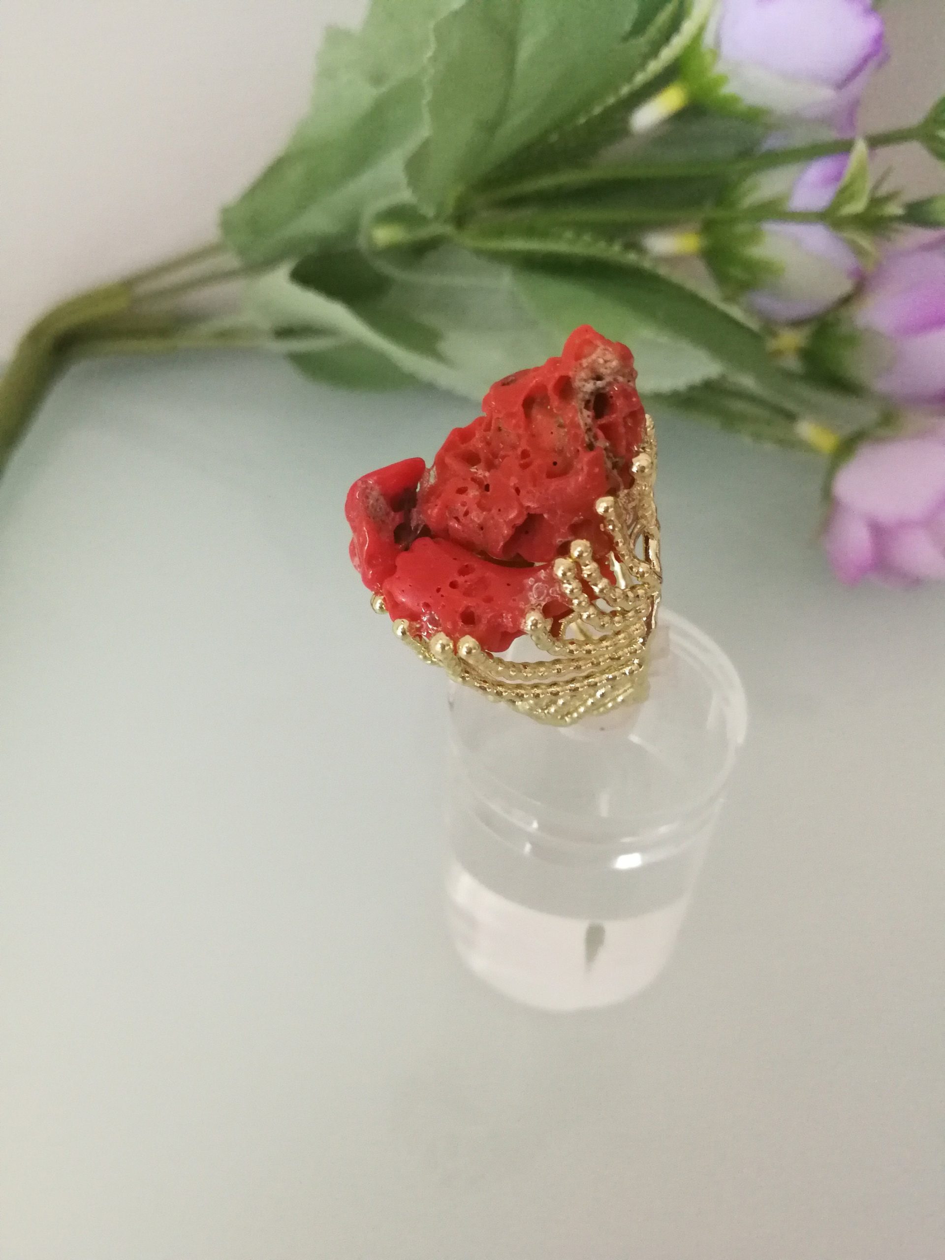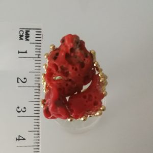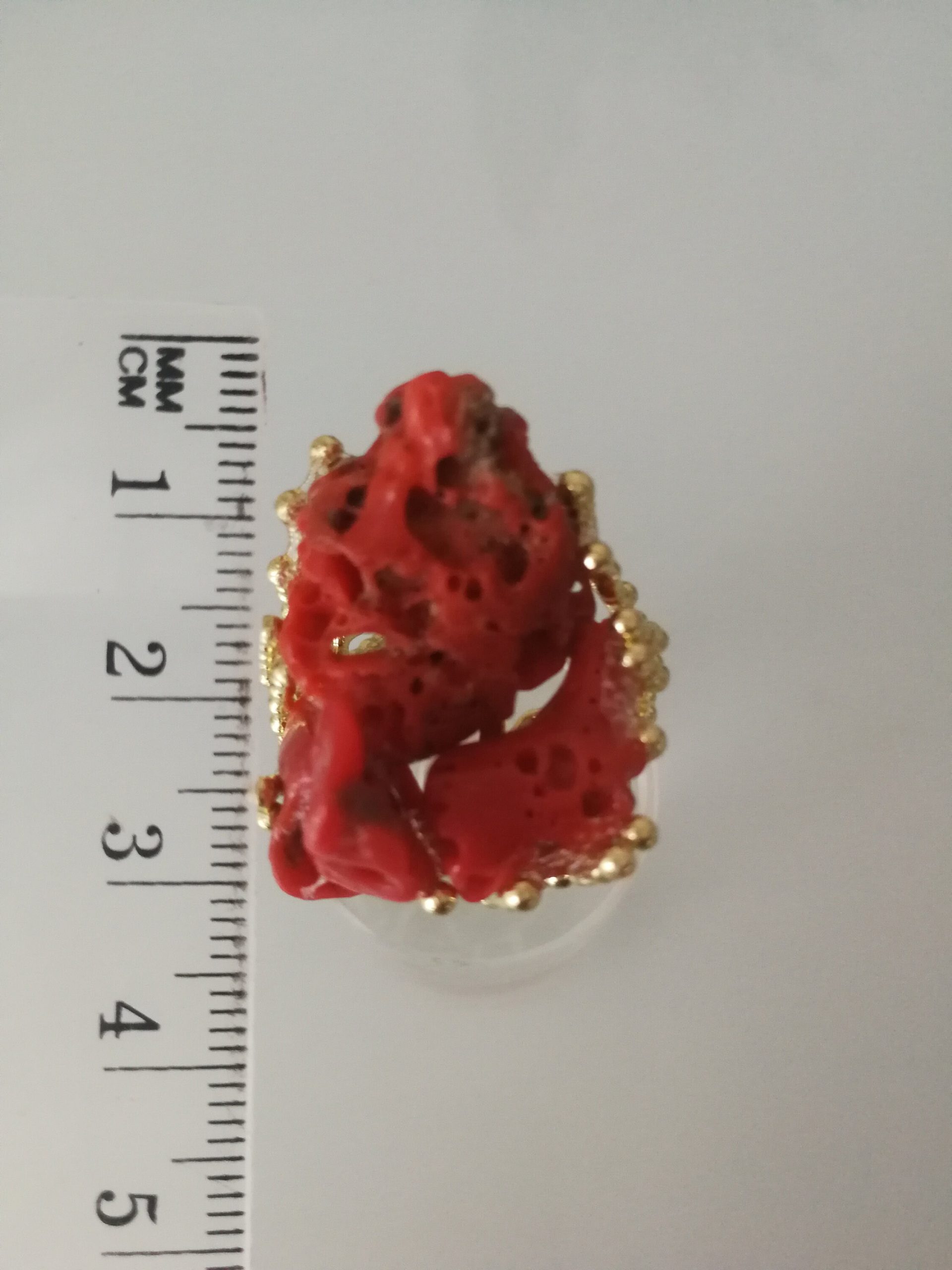 Anello elegante con grande corallo rosso naturale del mediterraneo, montatura in ottone dorato in stile Liberty .Misura corallo 3×2 cm. Misura anello regolabile.
