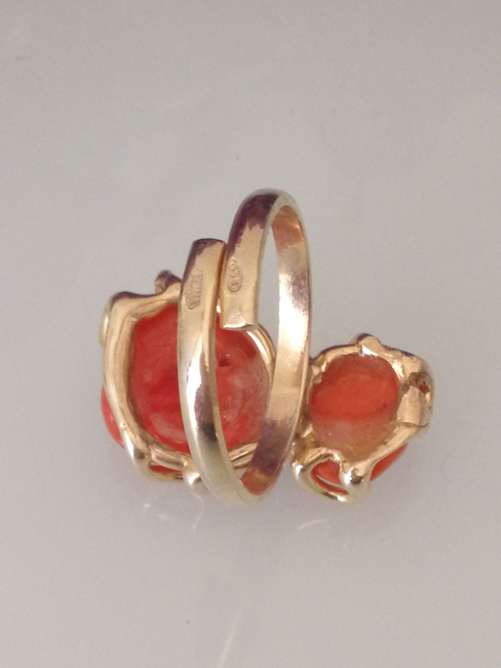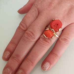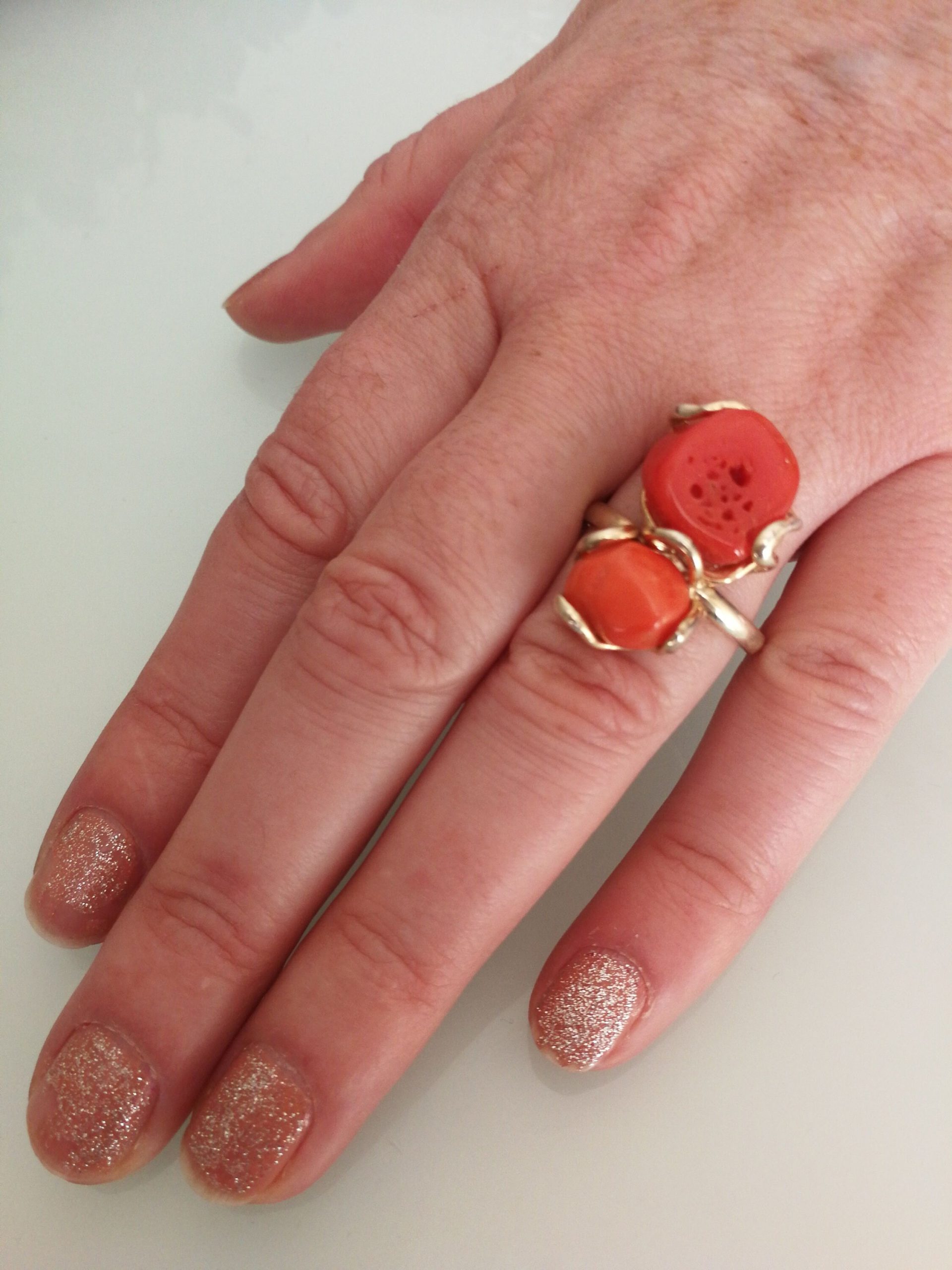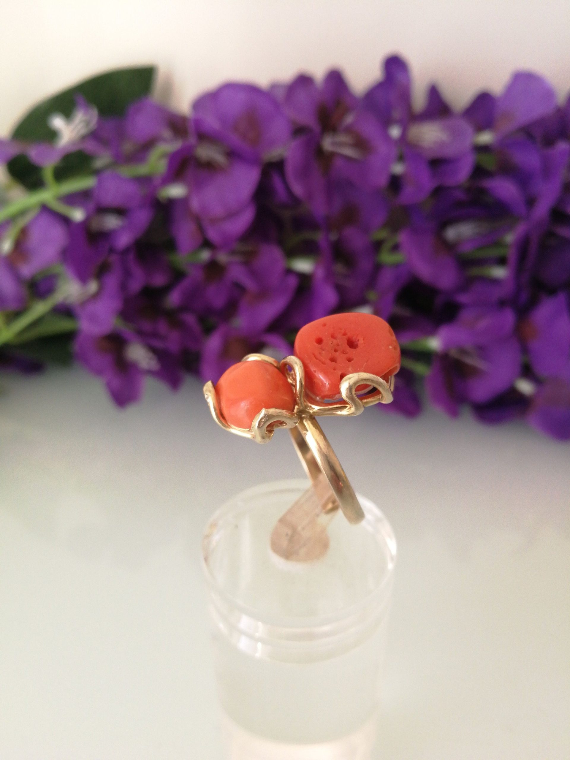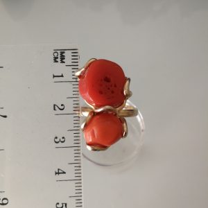 Anello elegante particolare con 2 pezzi di corallo rosso del mediterraneo naturale, montatura in argento placcata oro.Misura coralli lunghezza 3 cm . Misura anello regolabile.