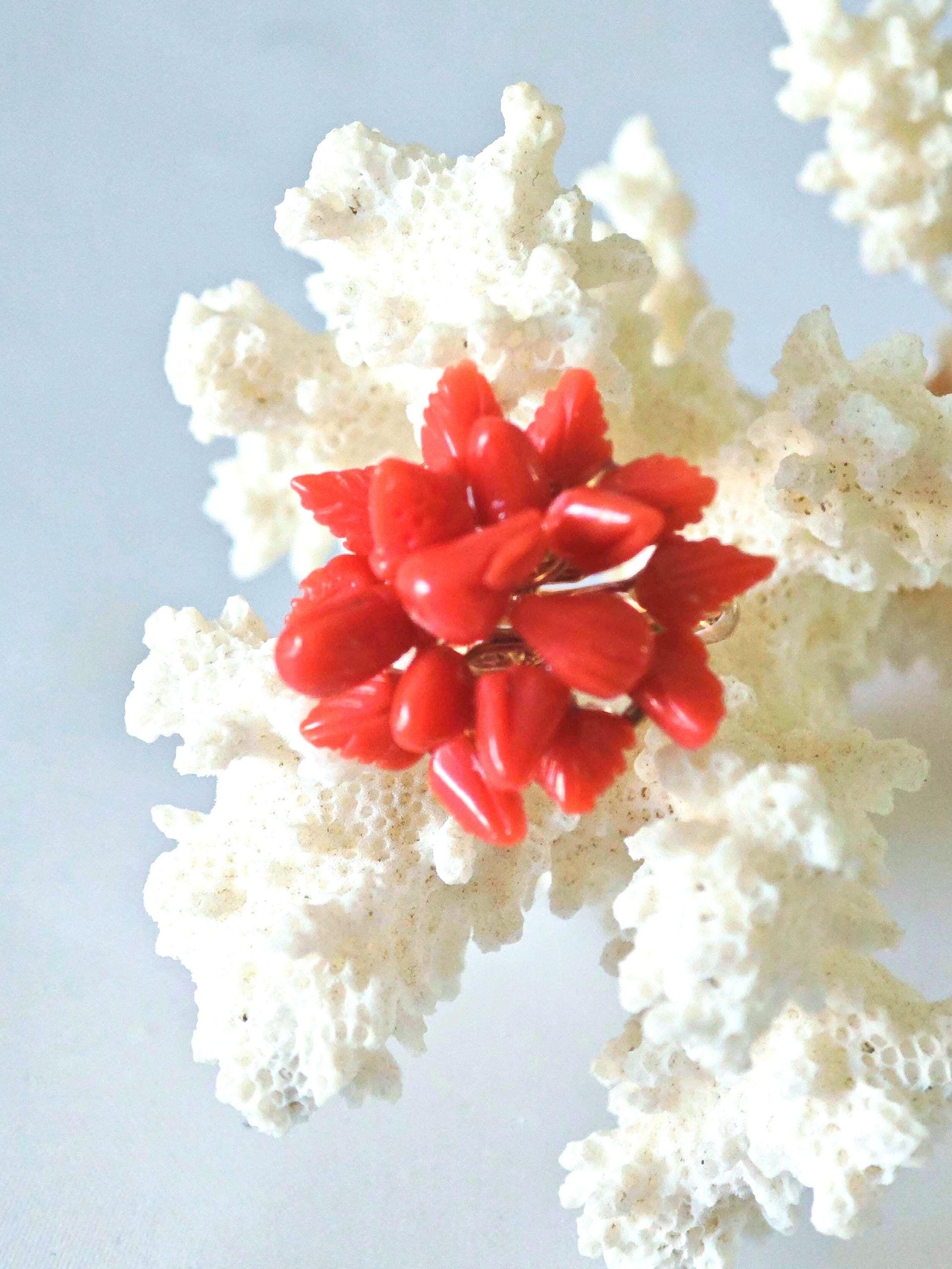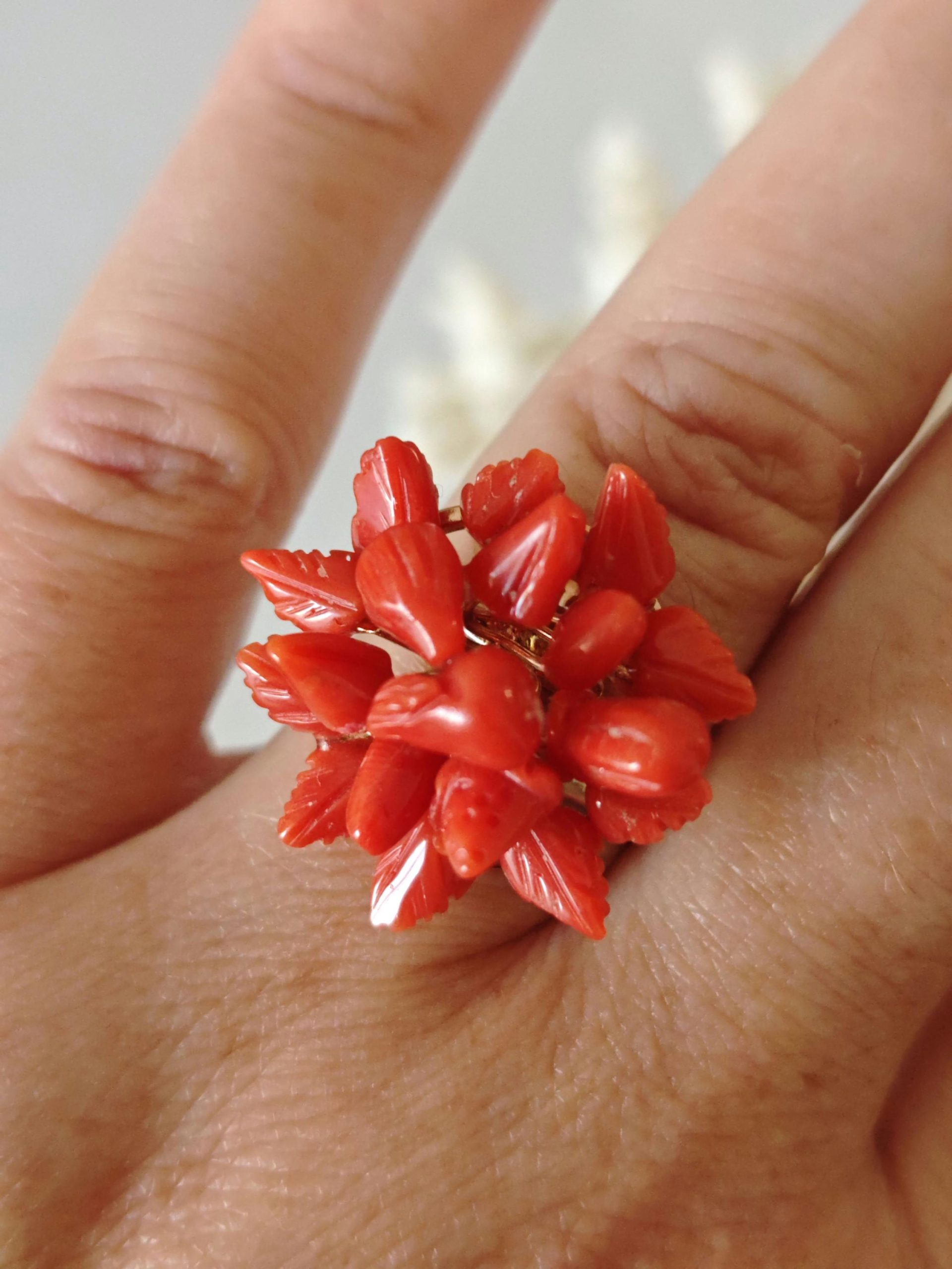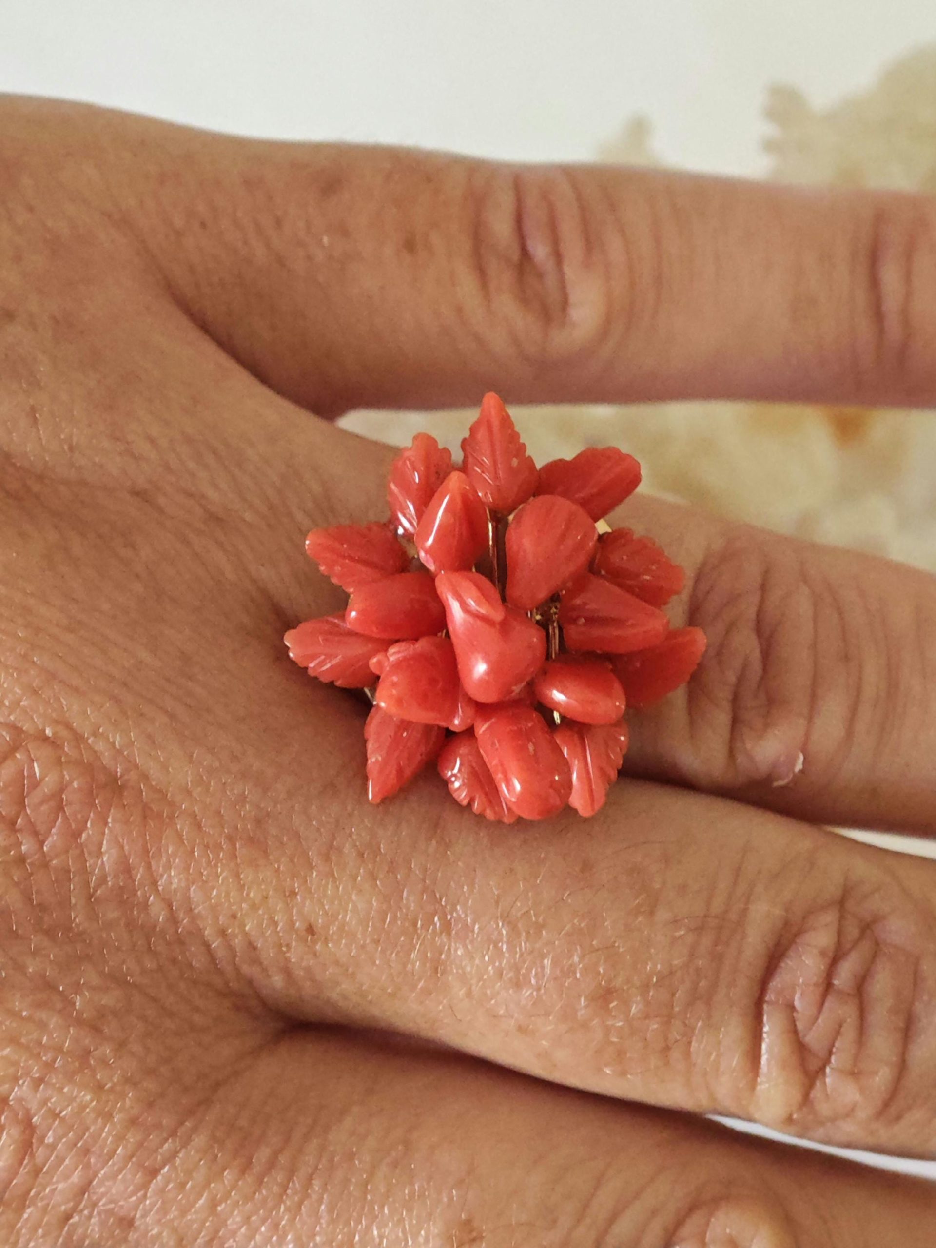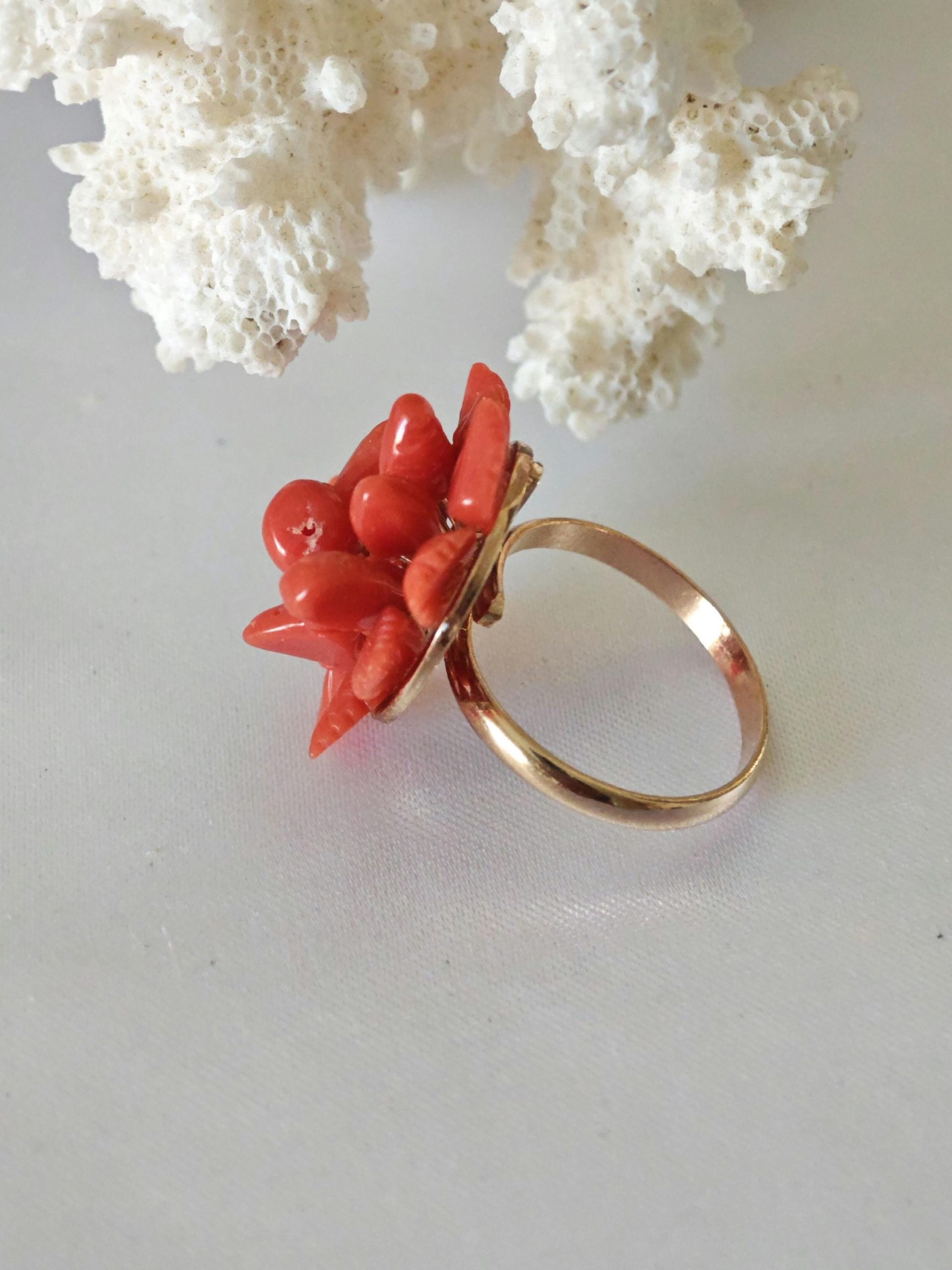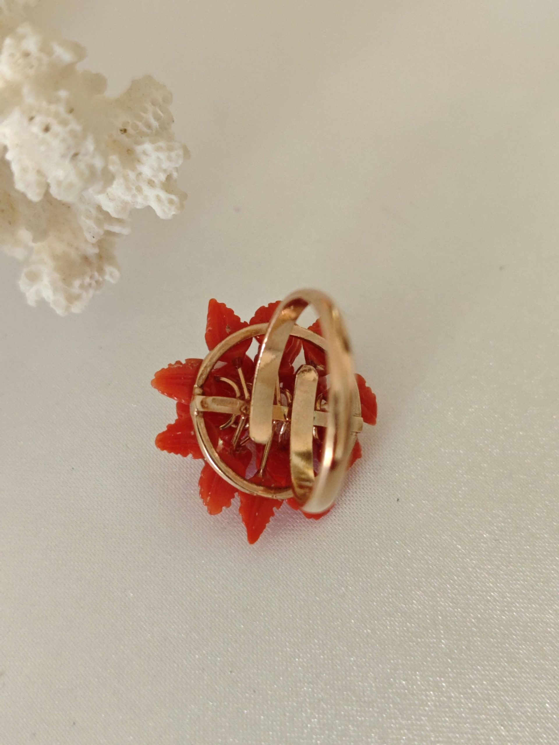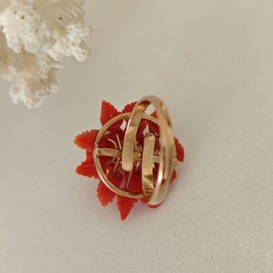 Anello artigianale con base in argento 925 placcato oro rosa con corallo rosso mediterraneo naturale a forma di fiori e foglie scolpito a mano a Torre del greco, 2,3 cm diametro