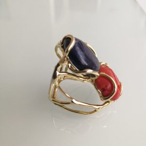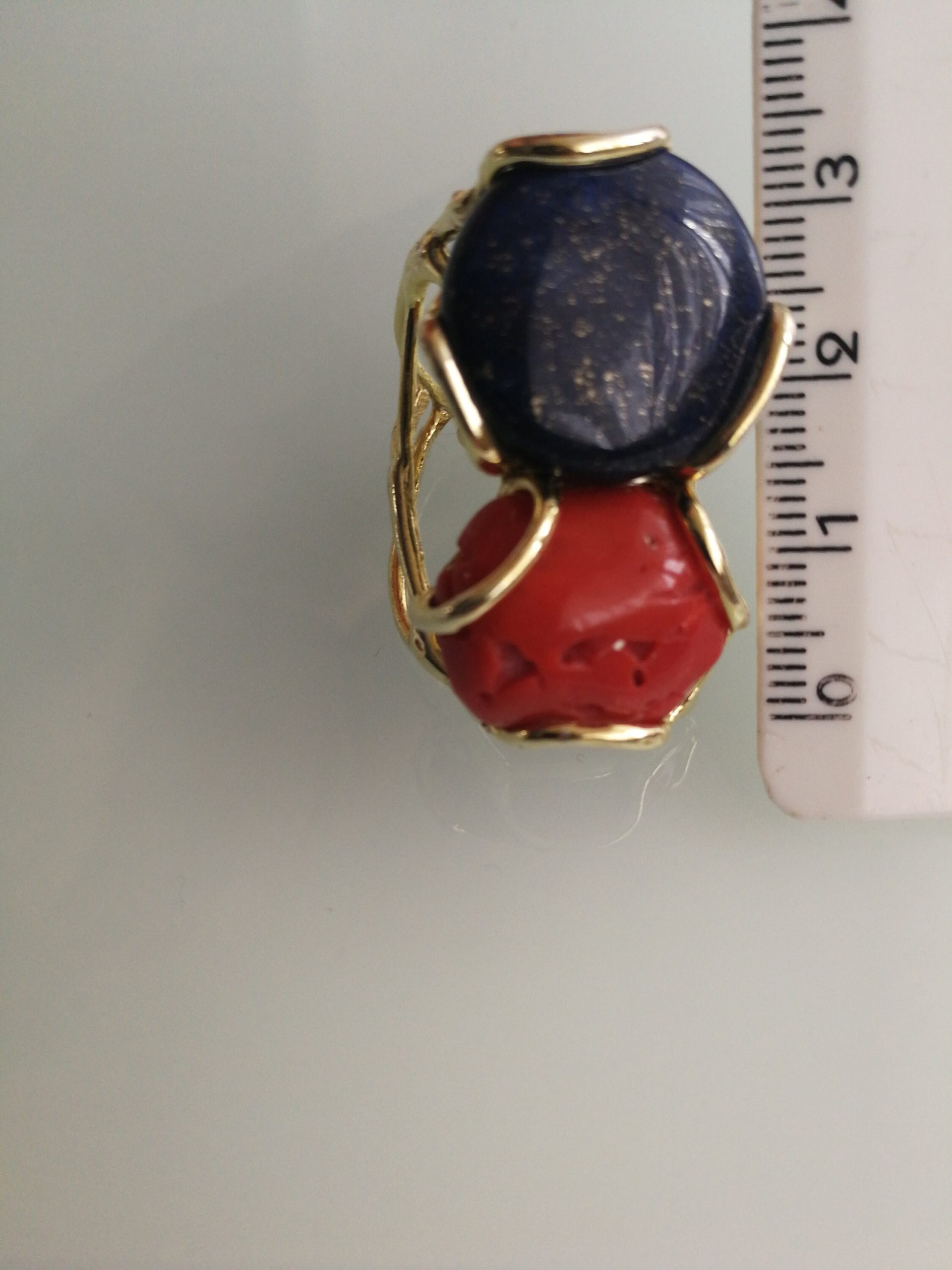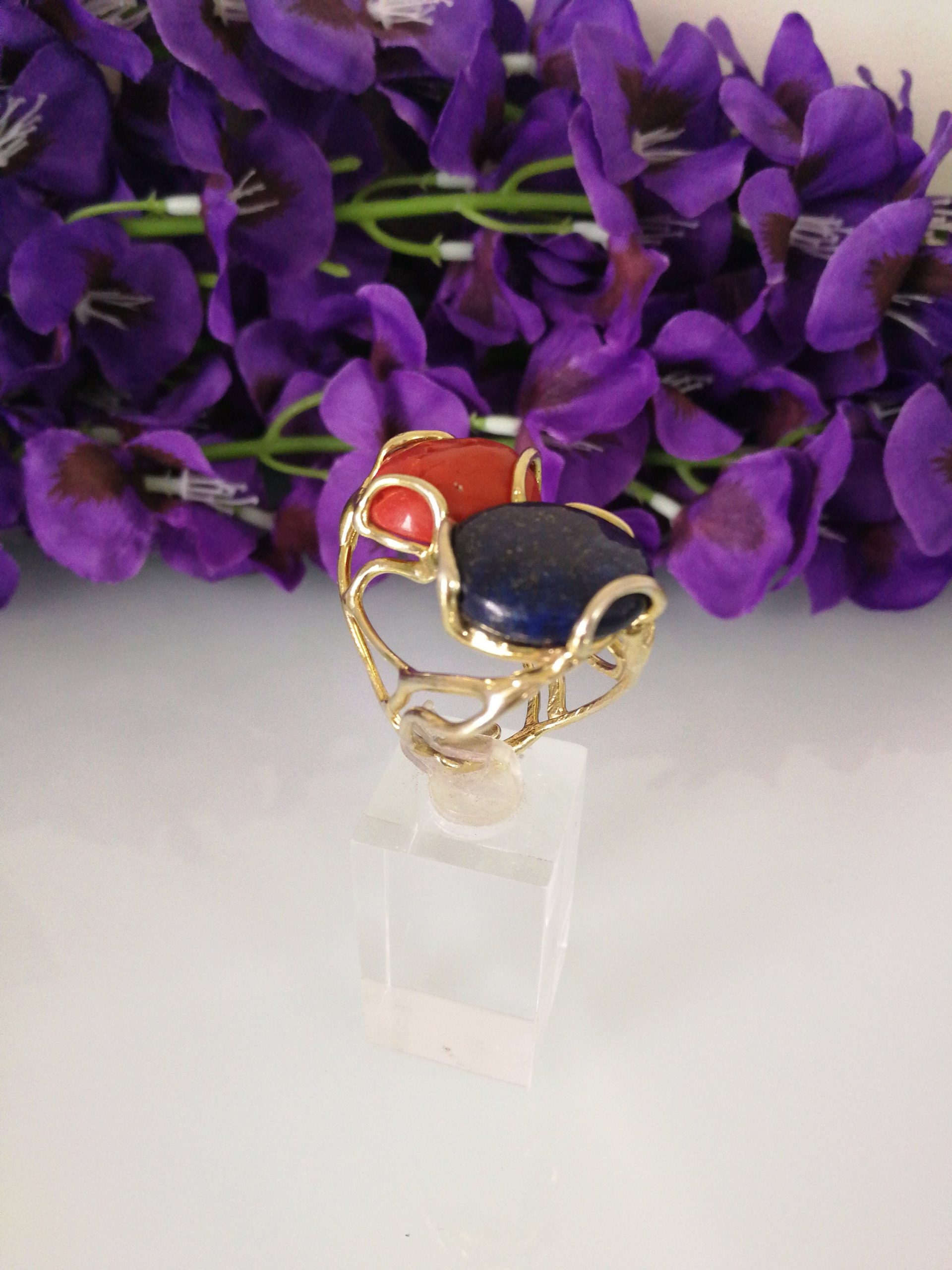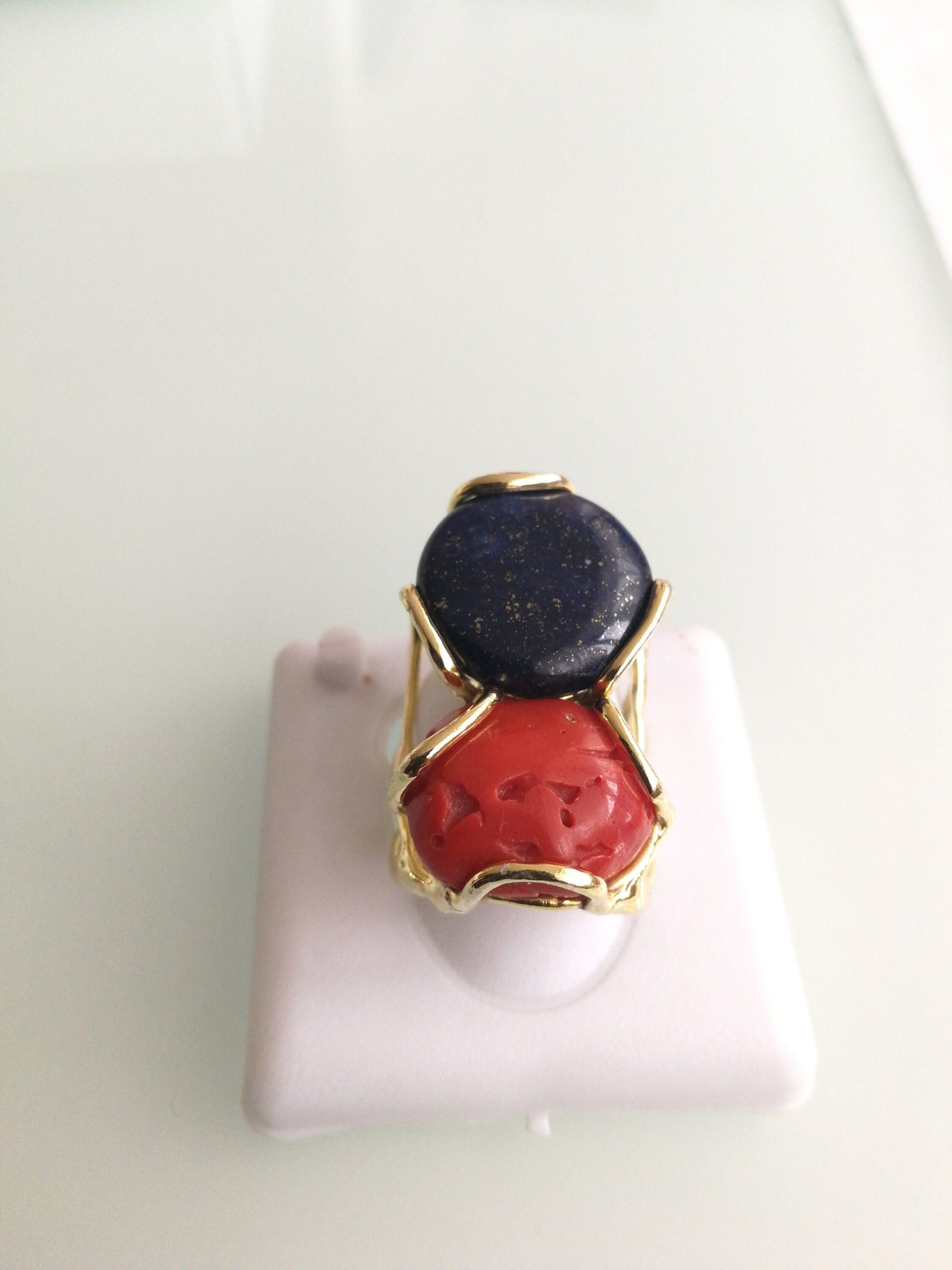 Anello elegante con corallo rosso naturale del mediterraneo e pietra di lapislazzuli incastonate su montatura in argento placcata oro. Misura pietre 3,5cm×2 cm .Misura anello regolabile.