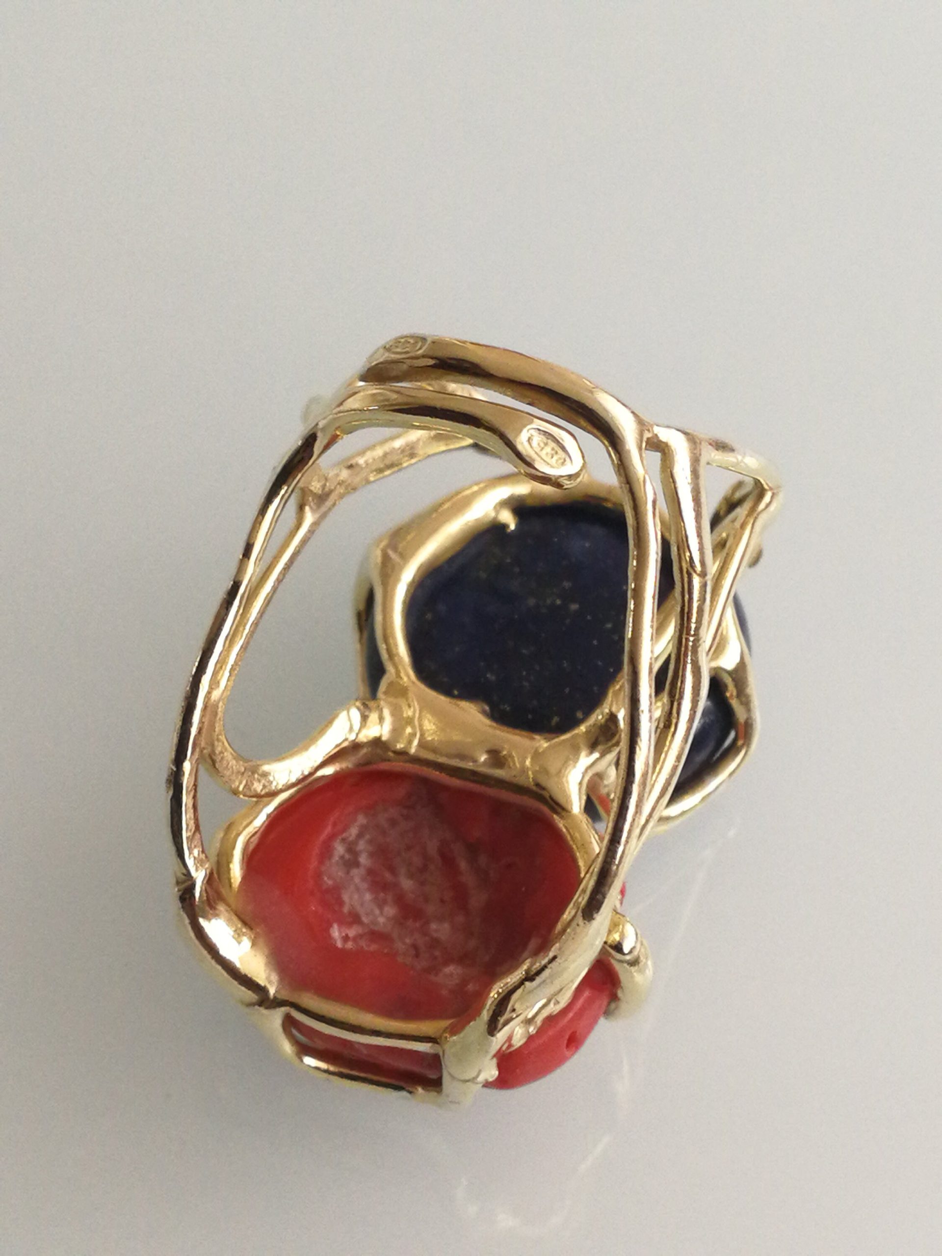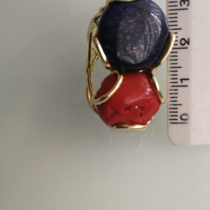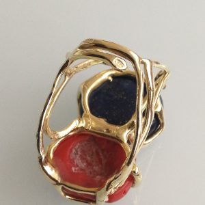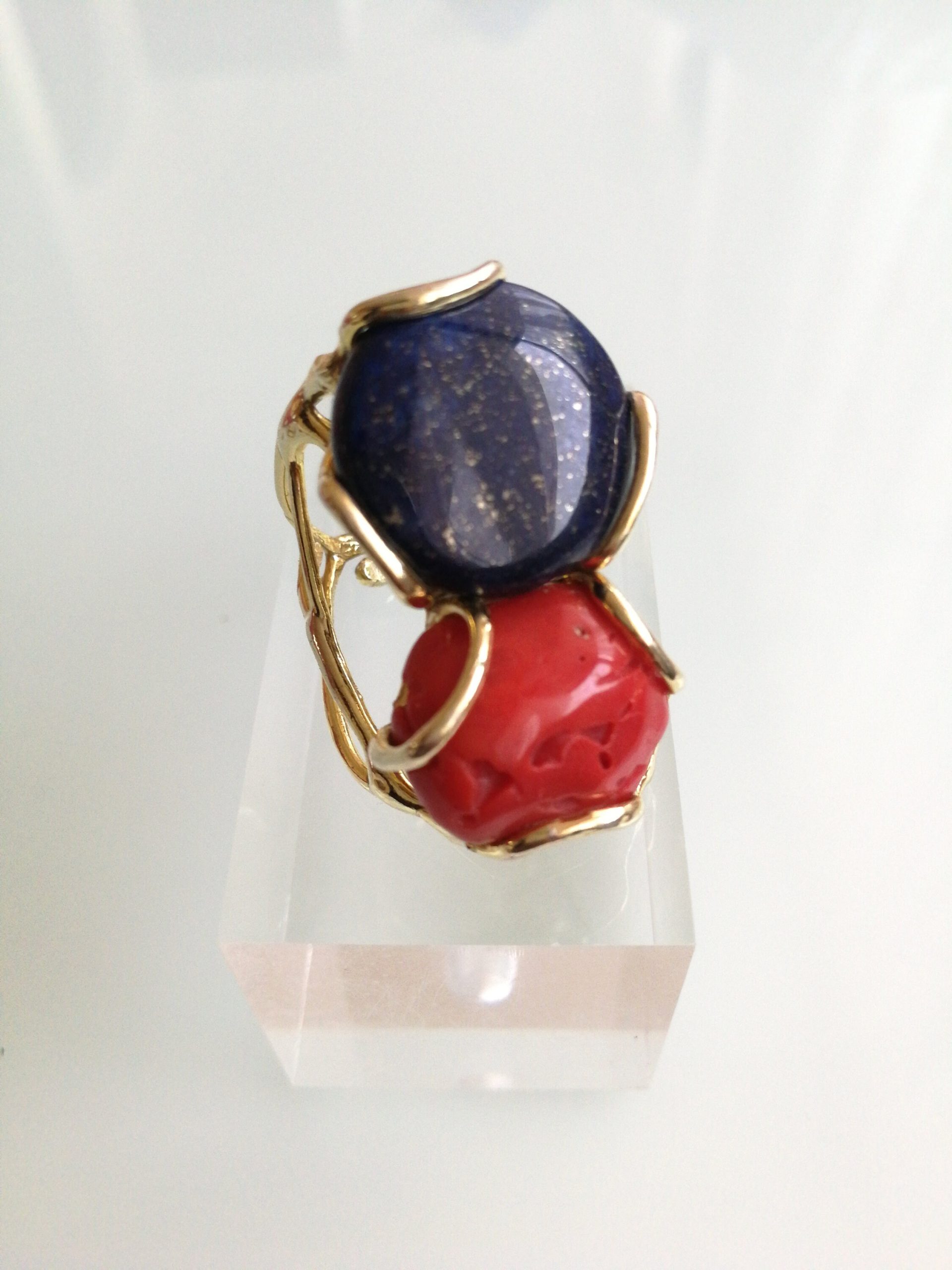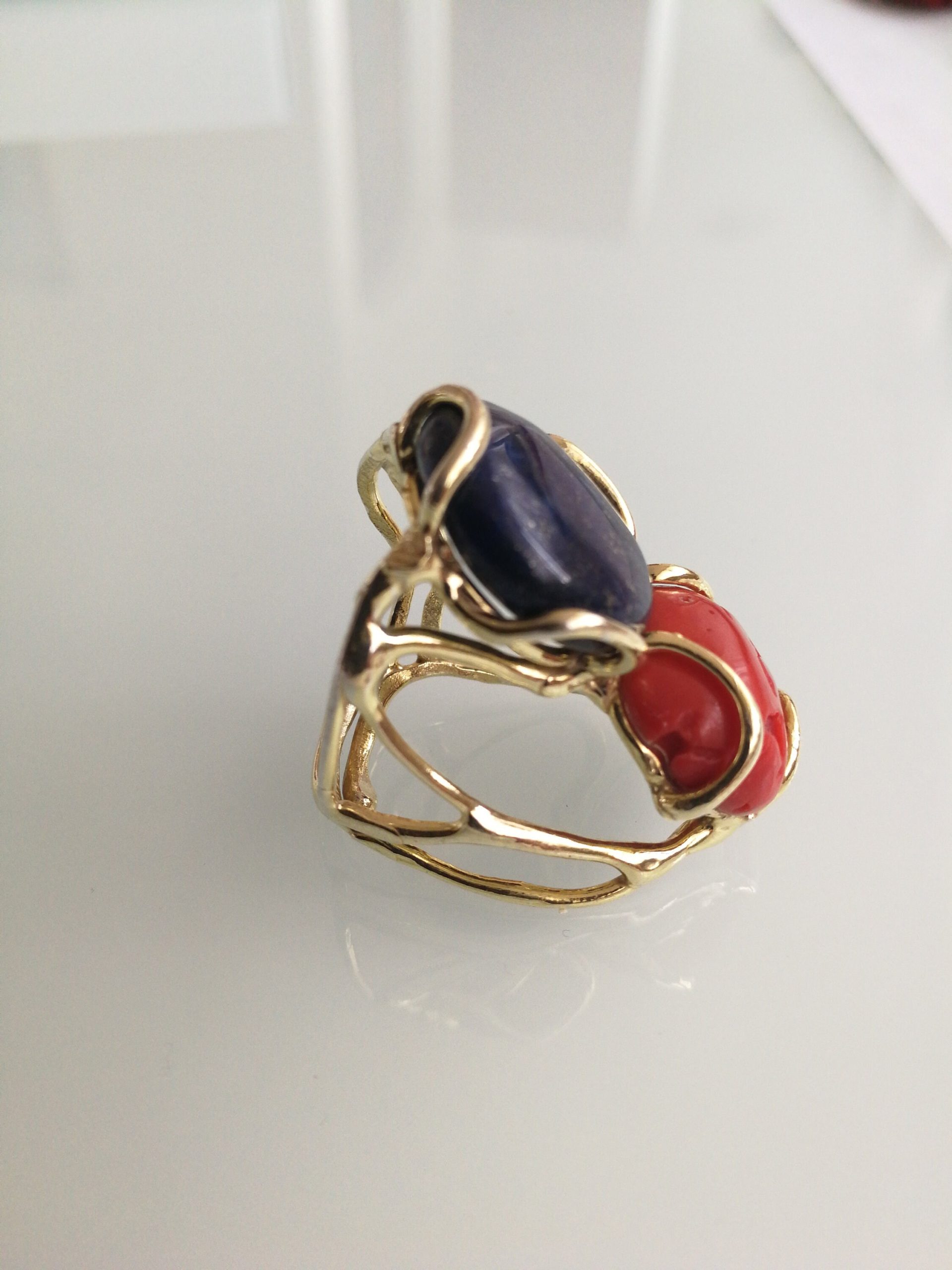 Anello elegante con corallo rosso naturale del mediterraneo e pietra di lapislazzuli incastonate su montatura in argento placcata oro. Misura pietre 3,5cm×2 cm .Misura anello regolabile.