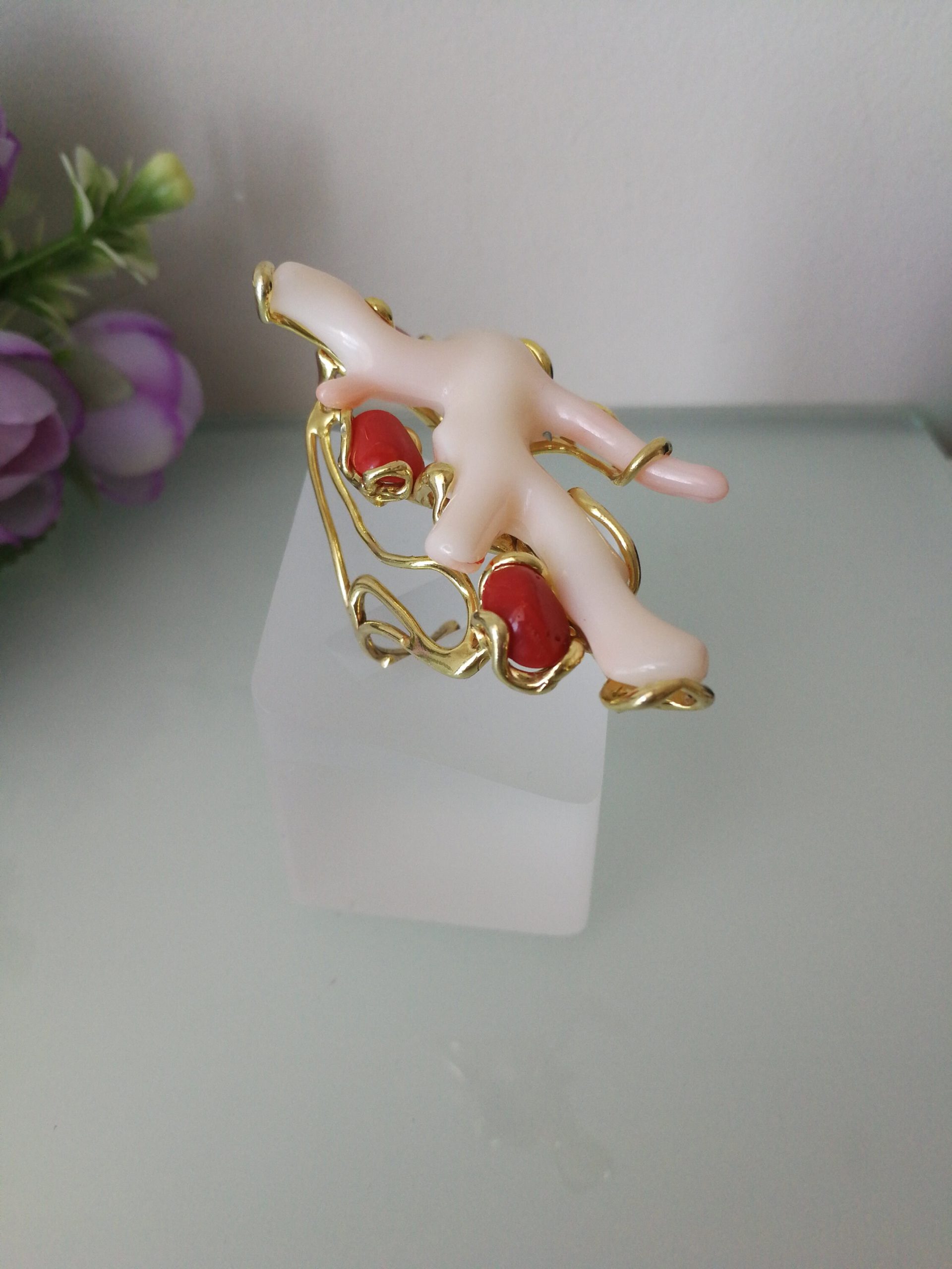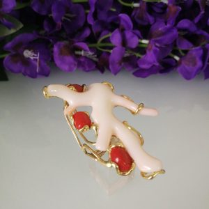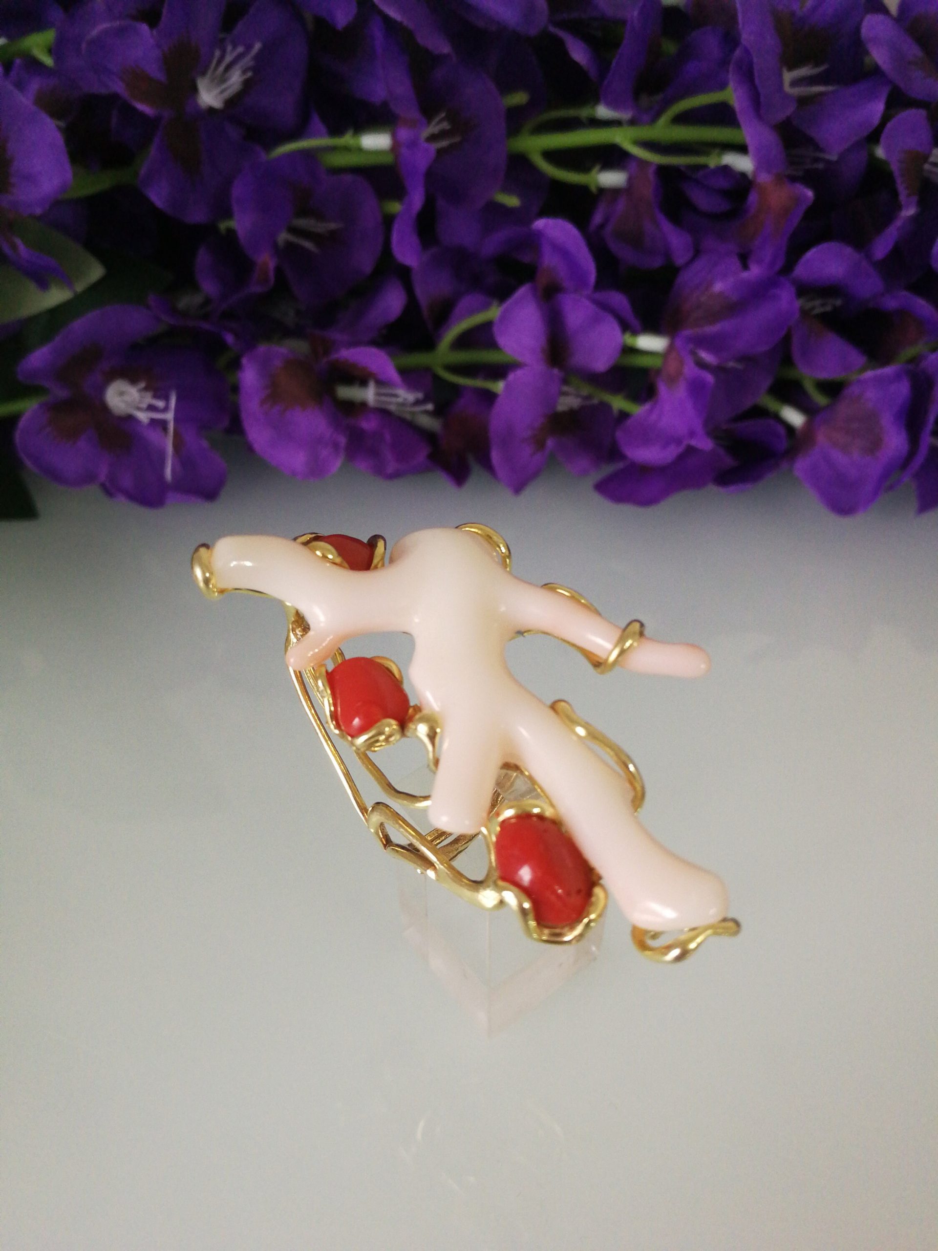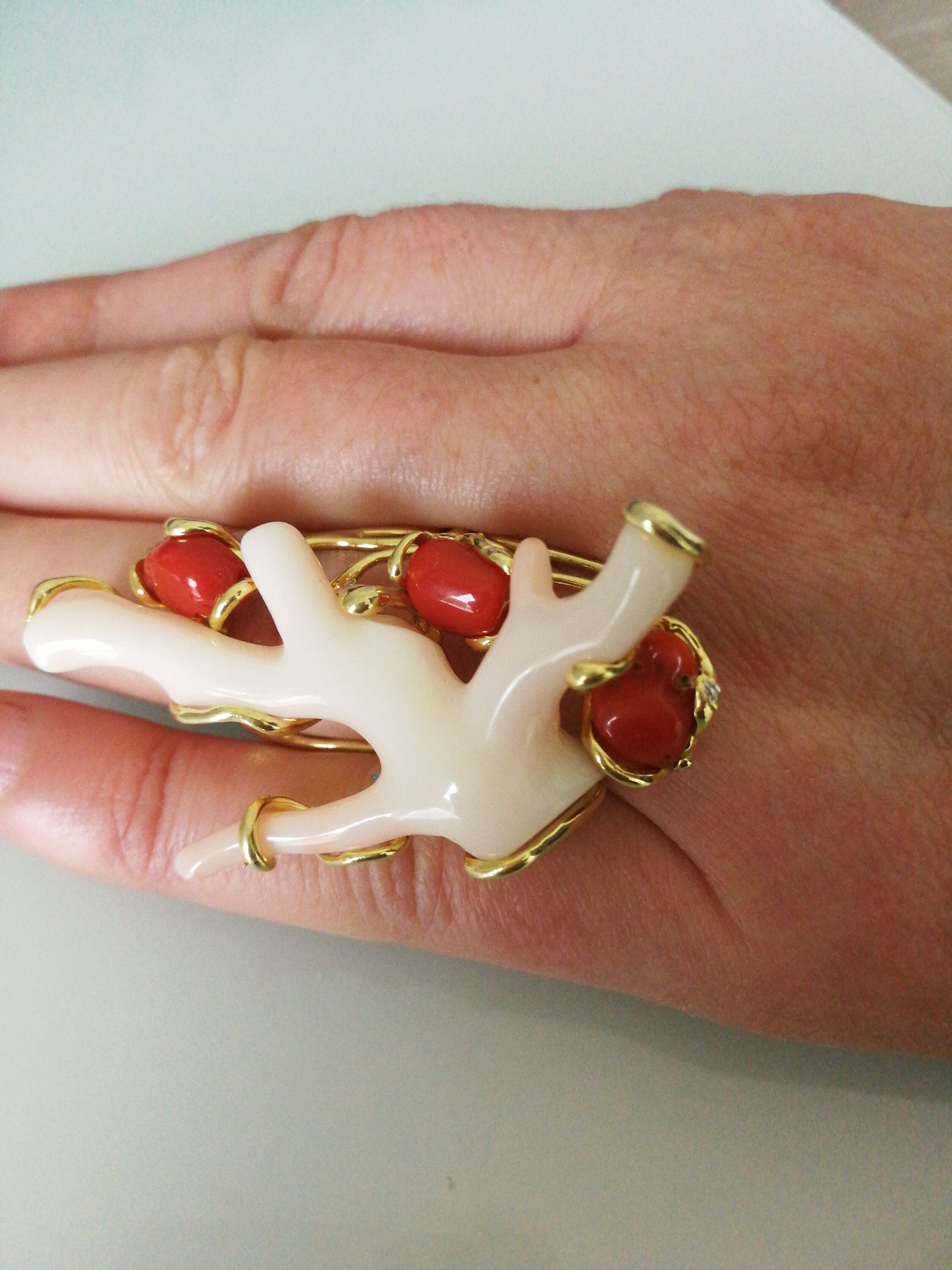 Elegante anello con tre coralli naturali del mediterraneo. Rametto corallo bianco,corallo rosso. Montatura in argento placcata oro . Misura rametto corallo 6 cm.Misura anello regolabile. Con scatola regalo.