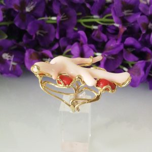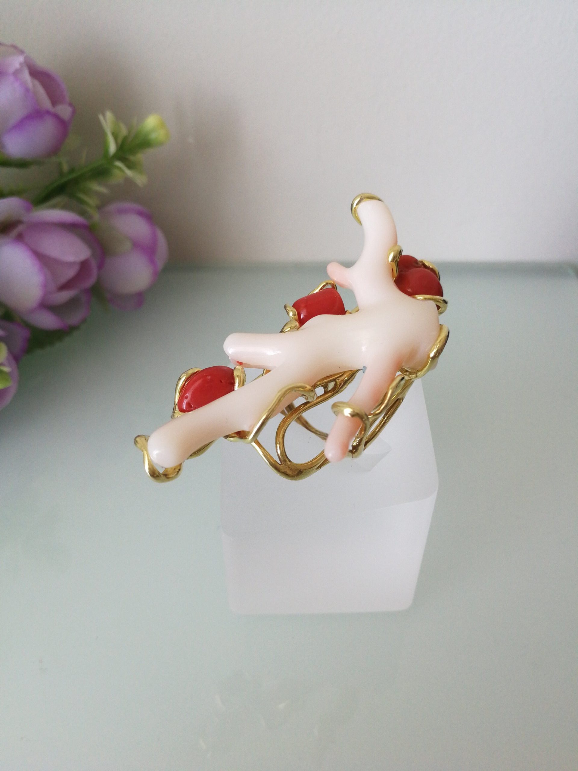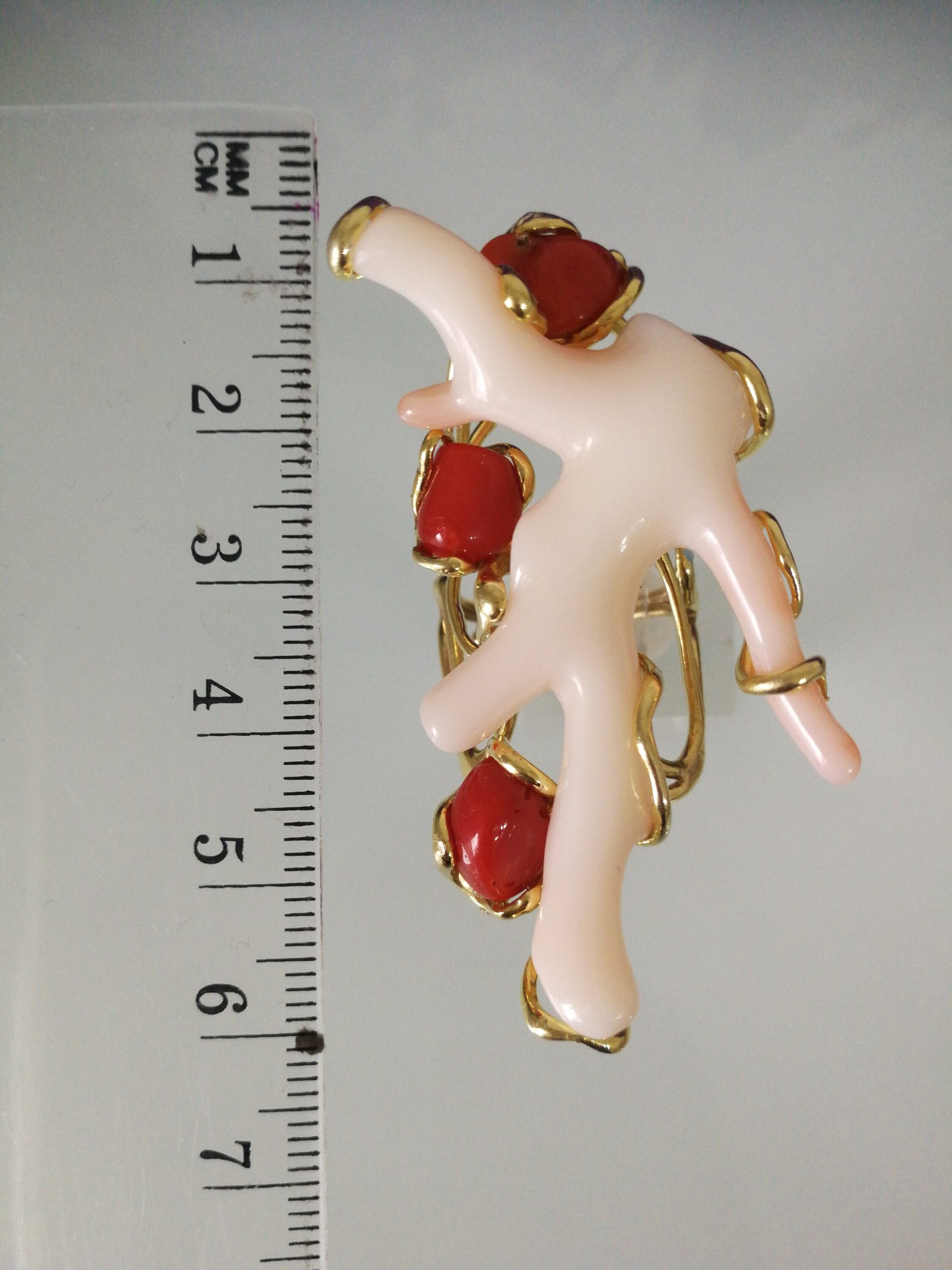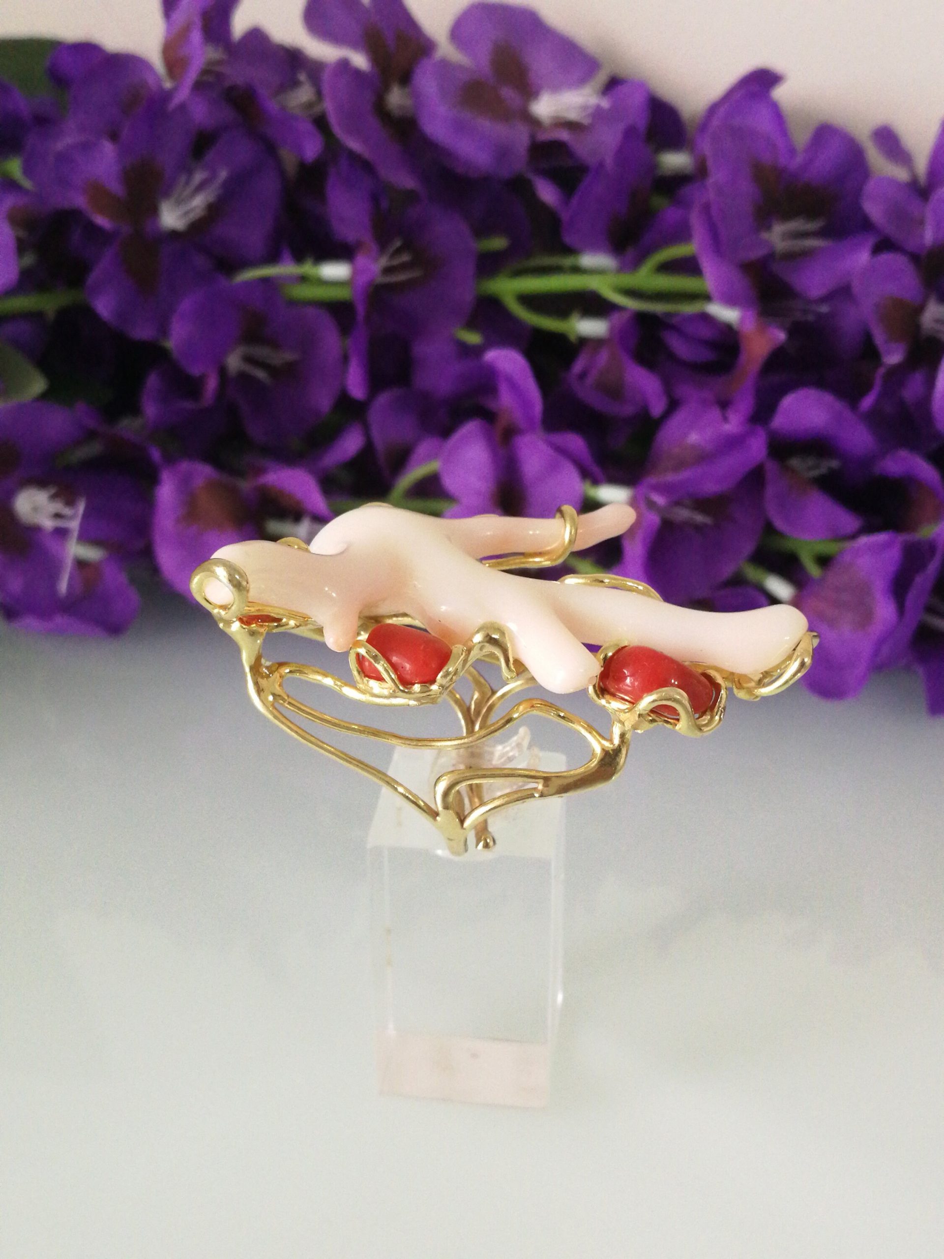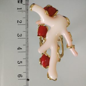Elegante anello con tre coralli naturali del mediterraneo. Rametto corallo bianco,corallo rosso. Montatura in argento placcata oro . Misura rametto corallo 6 cm.Misura anello regolabile. Con scatola regalo.