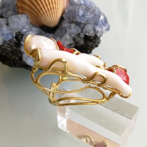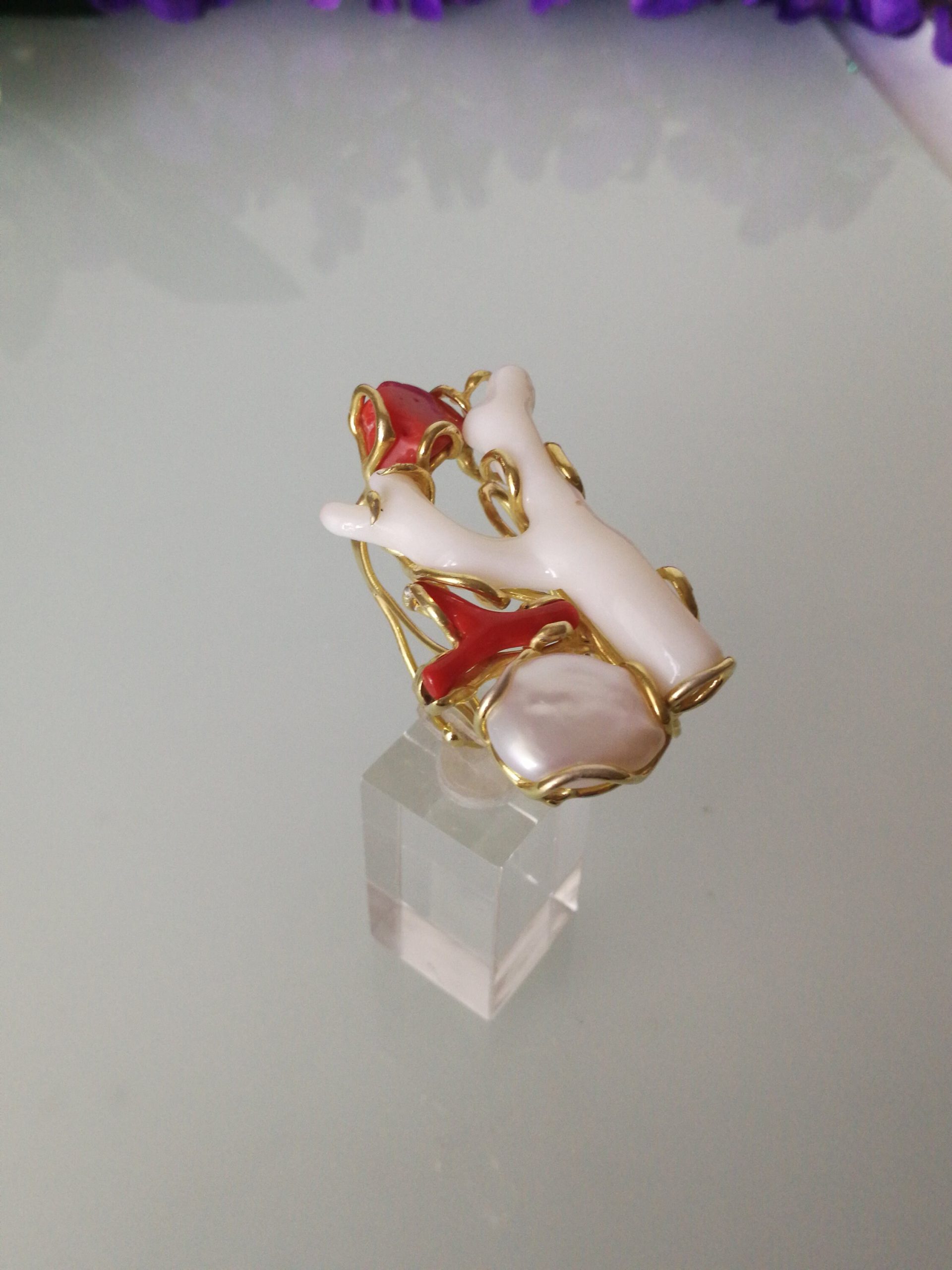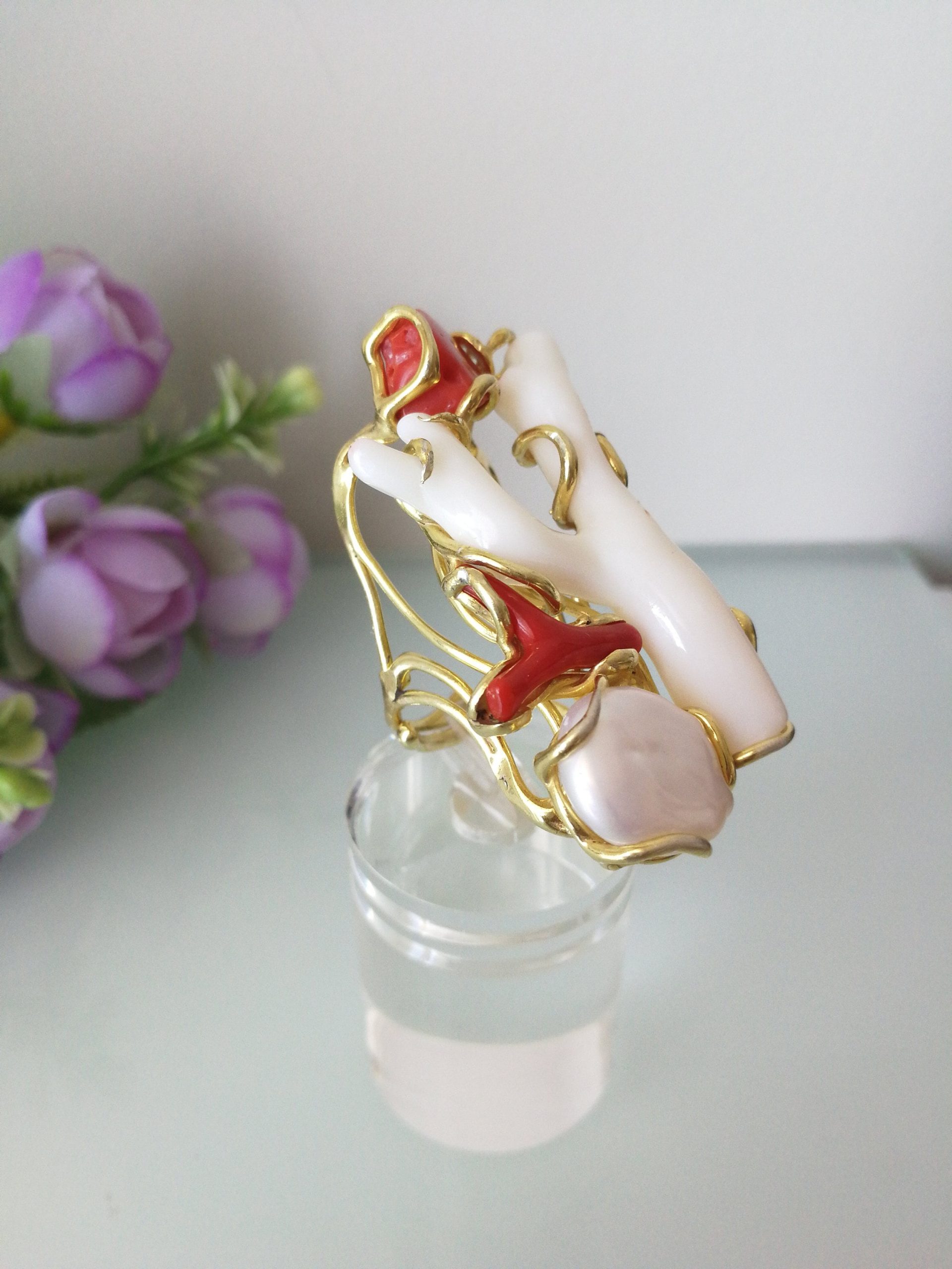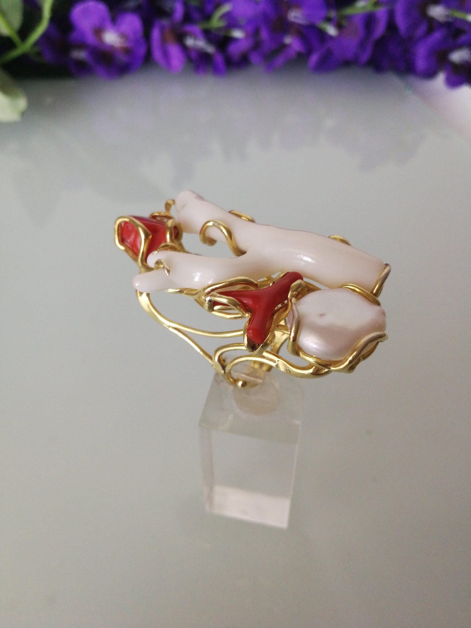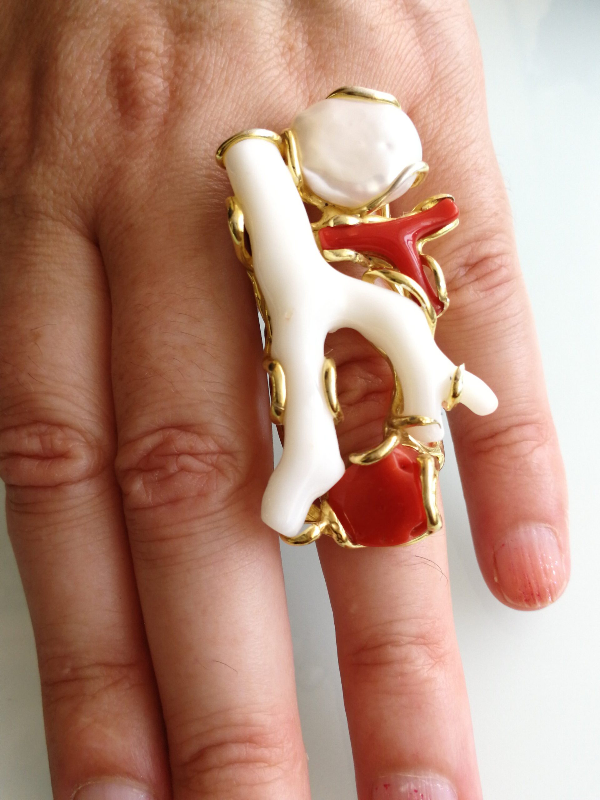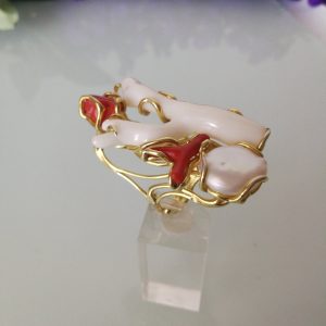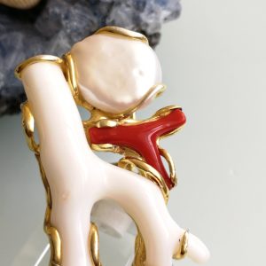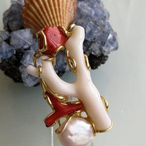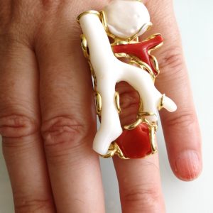 Esclusivo ed elegante anello con due coralli naturali del mediterraneo. Rametto corallo bianco,corallo rosso, con perla naturale barocca bianca. Montatura in argento placcata oro . Misura rametto corallo 6 cm.Misura anello regolabile. Confezione regalo inclusa.