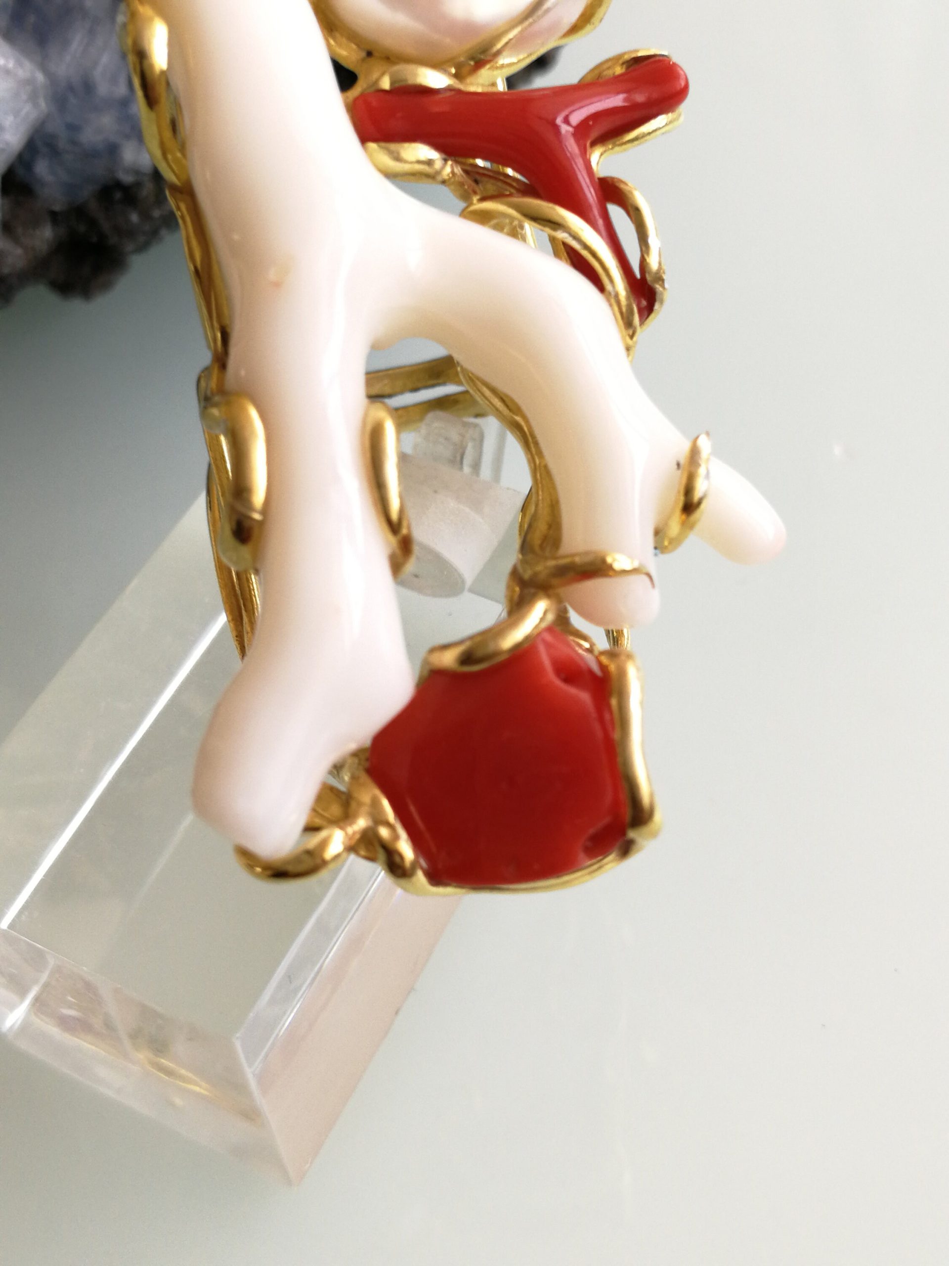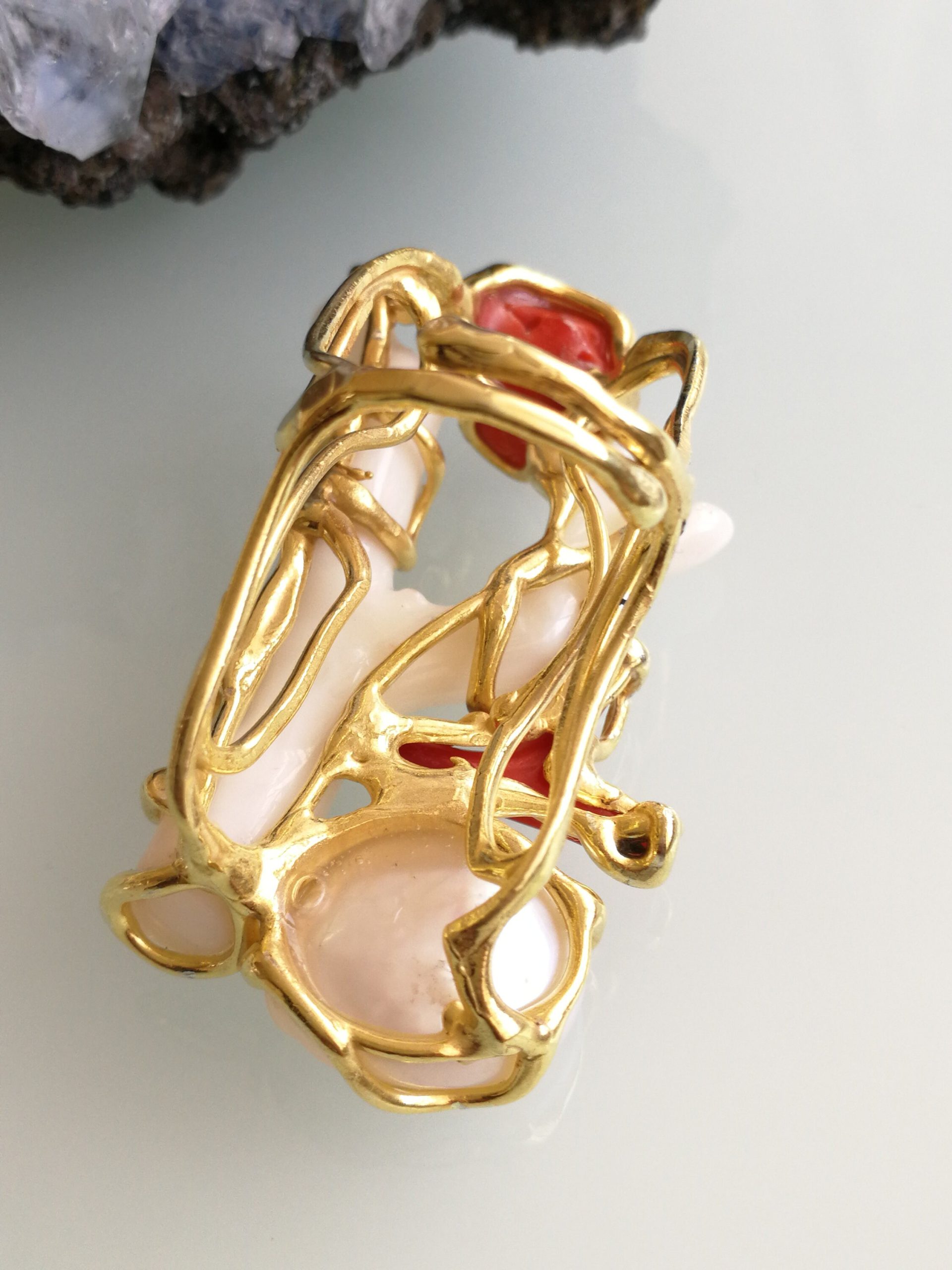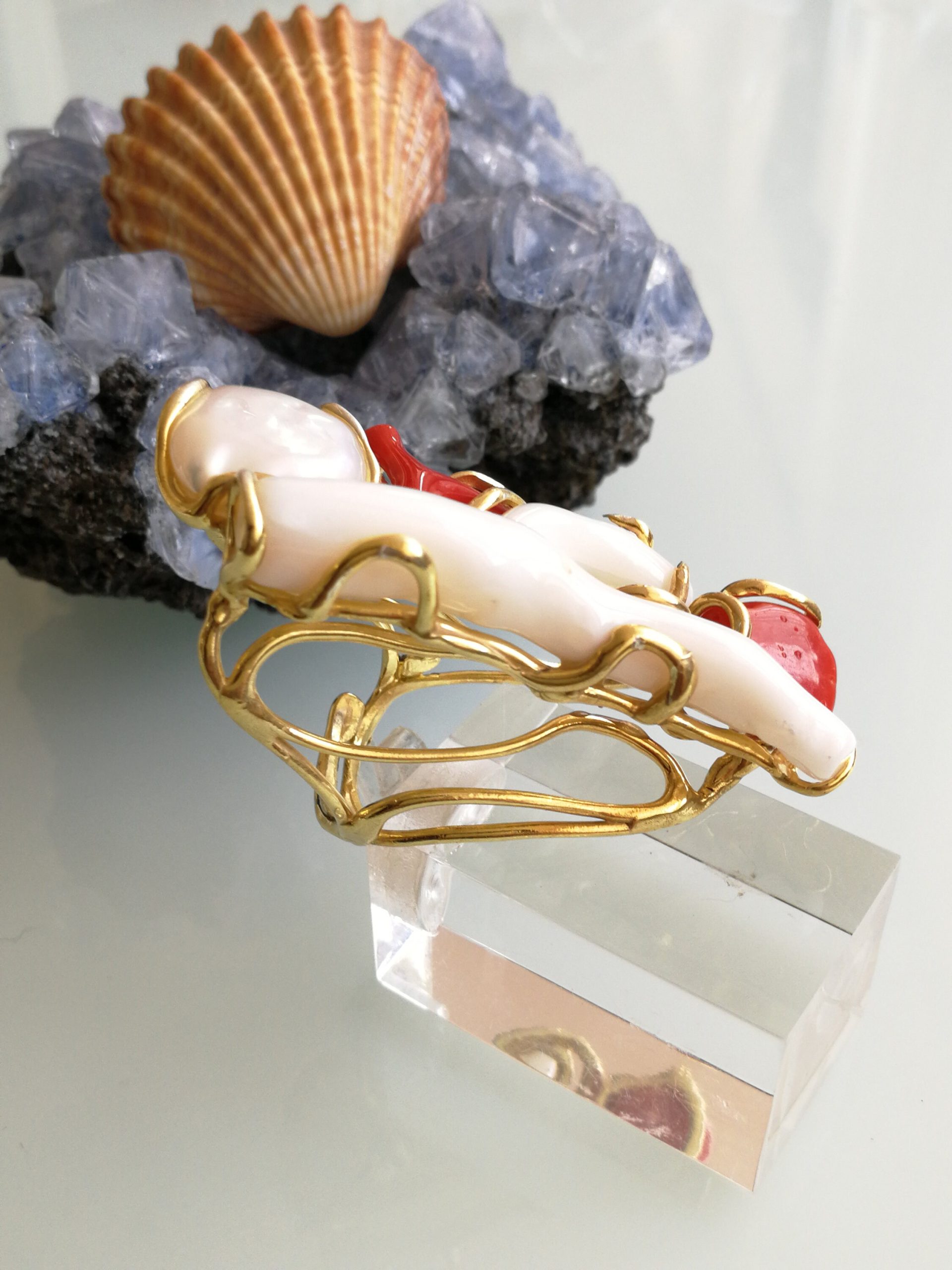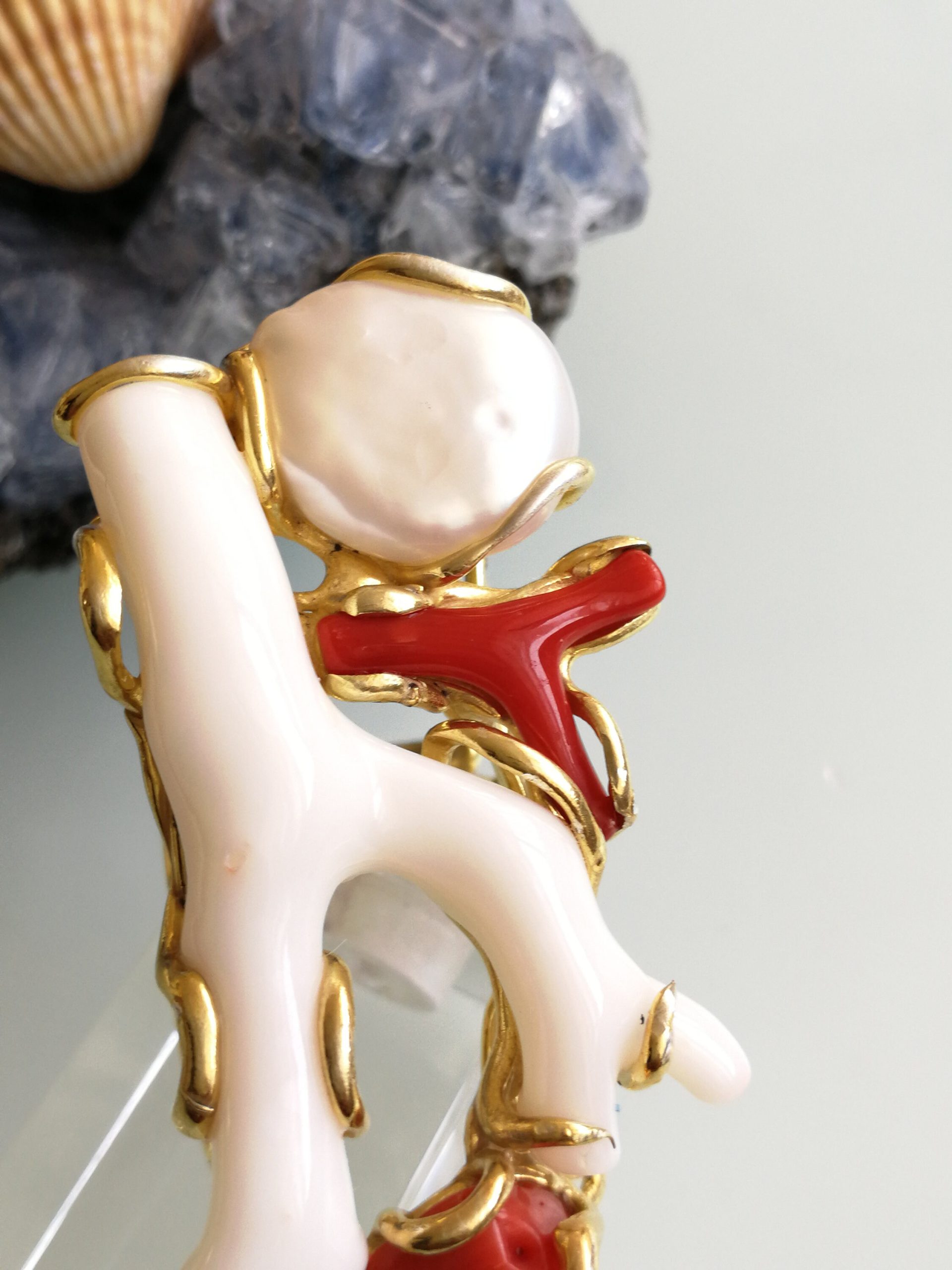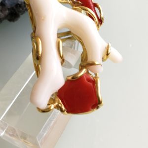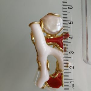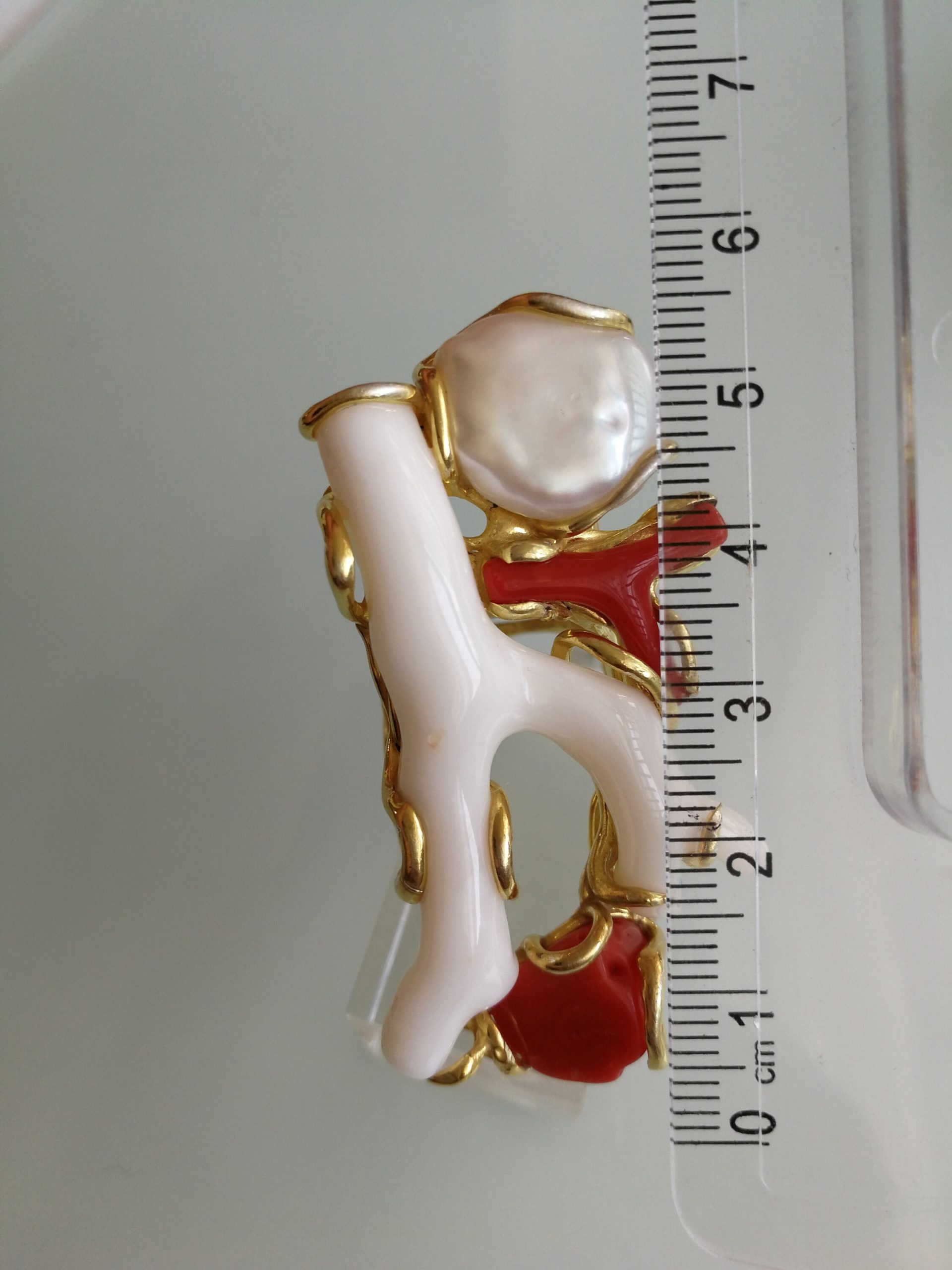 Esclusivo ed elegante anello con due coralli naturali del mediterraneo. Rametto corallo bianco,corallo rosso, con perla naturale barocca bianca. Montatura in argento placcata oro . Misura rametto corallo 6 cm.Misura anello regolabile. Confezione regalo inclusa.