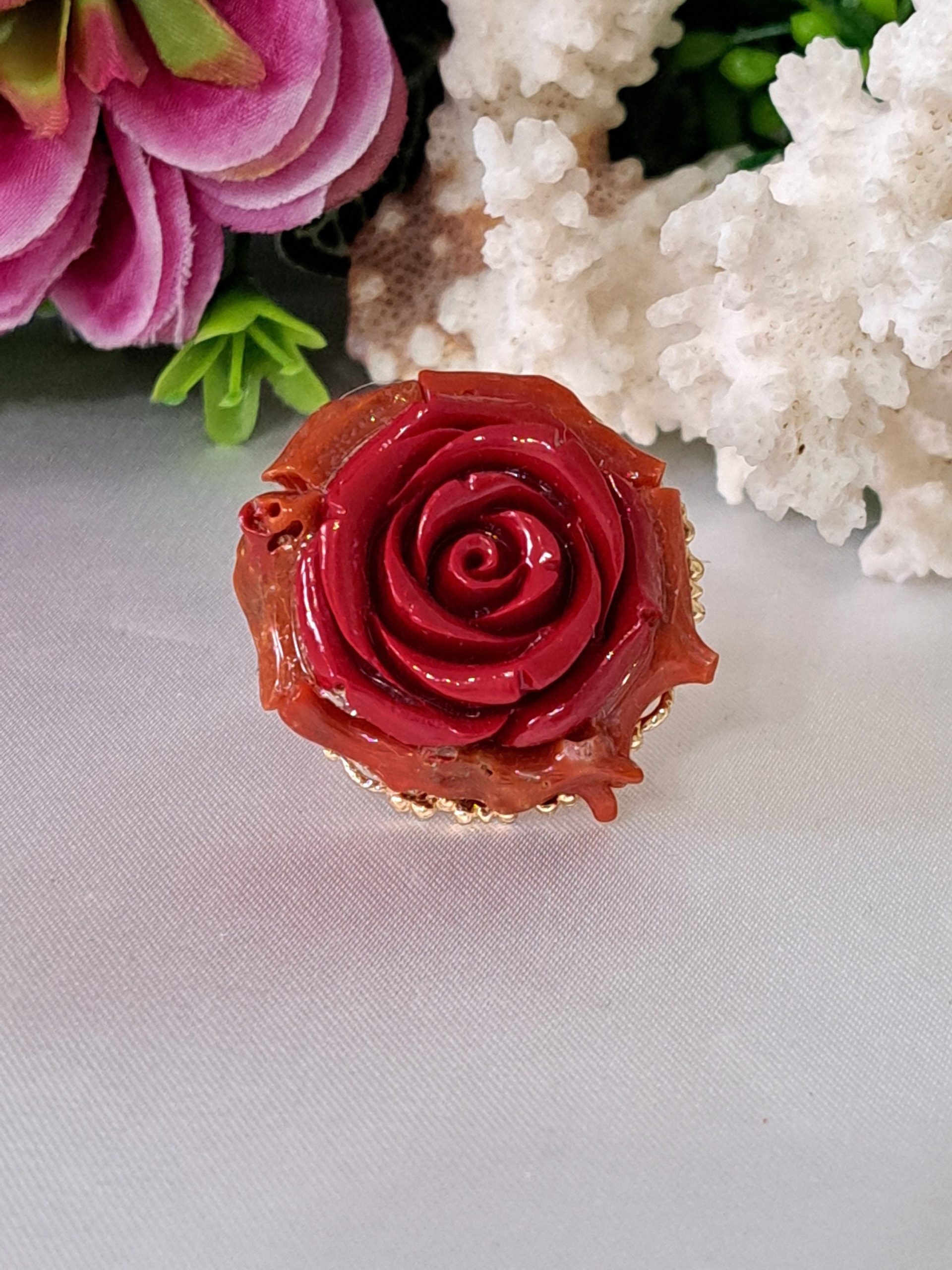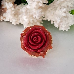 Anello maxi realizzata a mano con base in ottone dorato decorata con rosa resina rossa e rametti corallo rosso naturale mediterraneo ,misura 3 cm diametro .