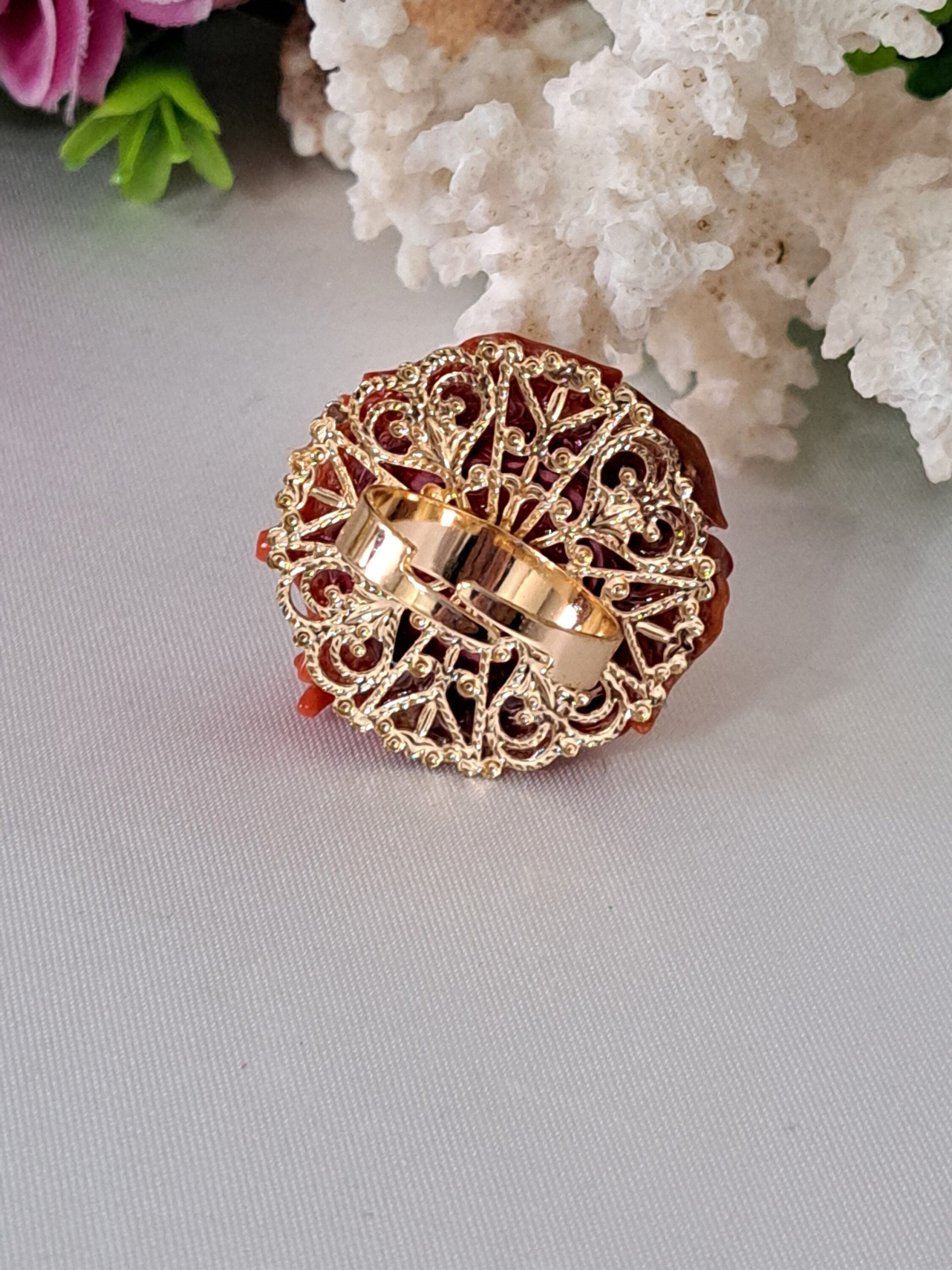 Anello maxi cammeo conchiglia sardonica ei corallo rosso naturale in ottone dorato,  gioielli italiani