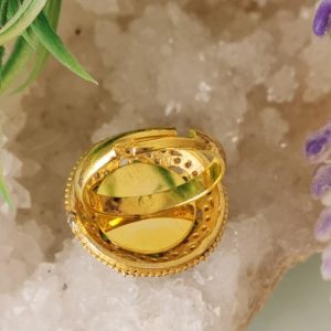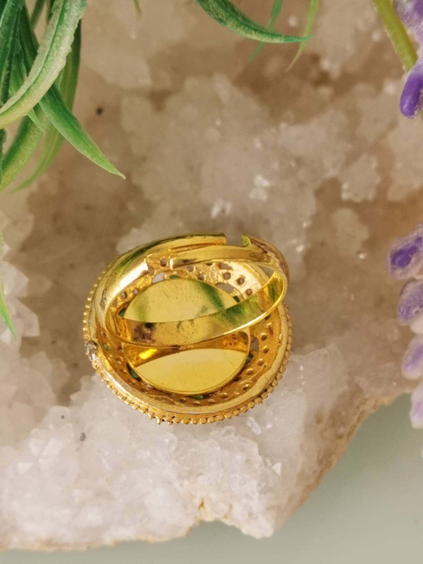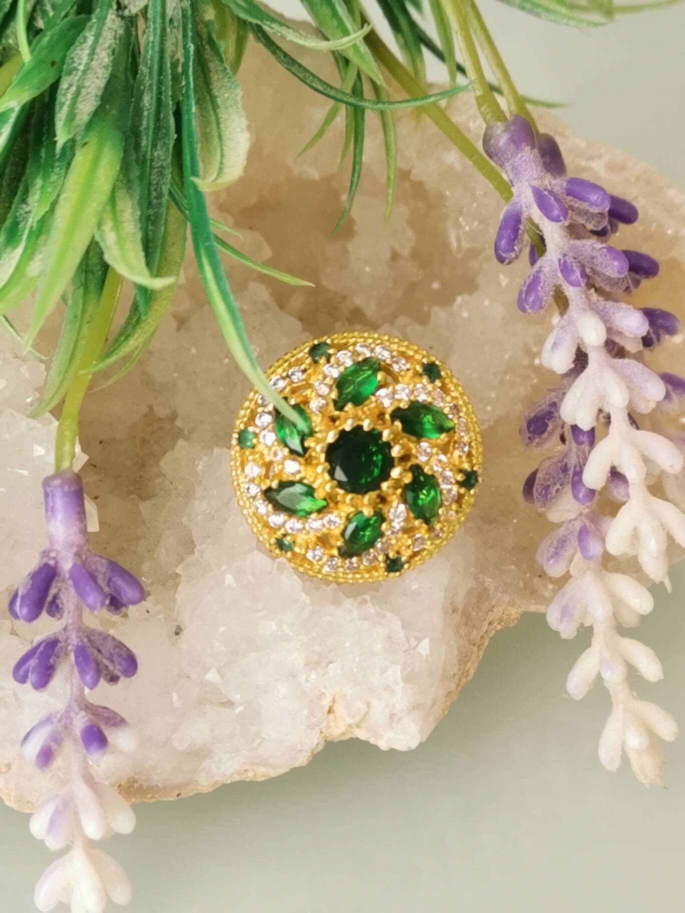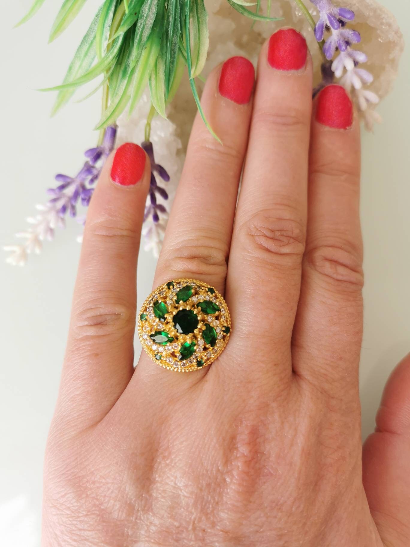 Anello in ottone dorato con pietre imitazione smeraldi e zirconi, 2,5 cm diametro