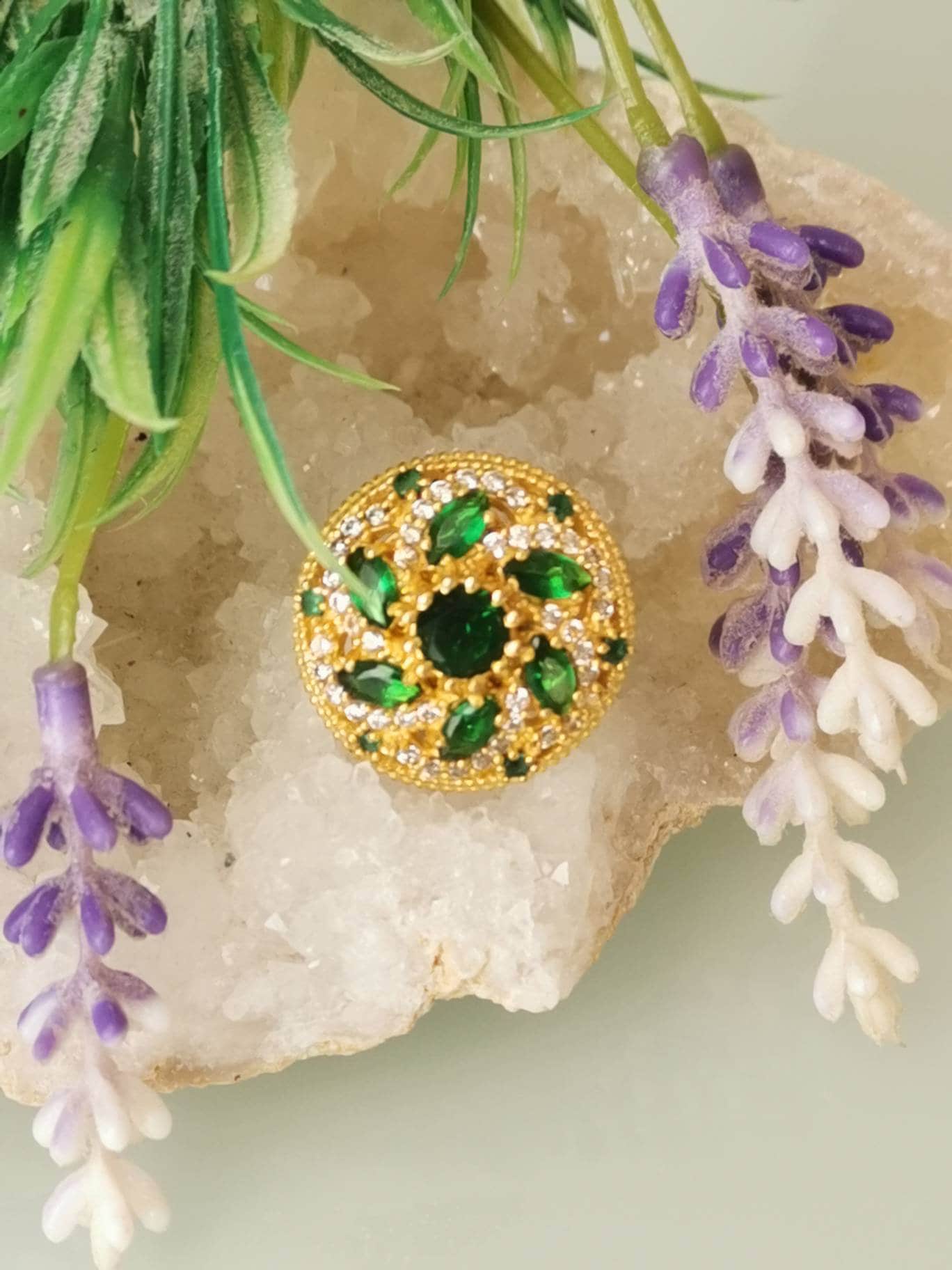 Anello in ottone dorato con smeraldi imitazione e zirconi