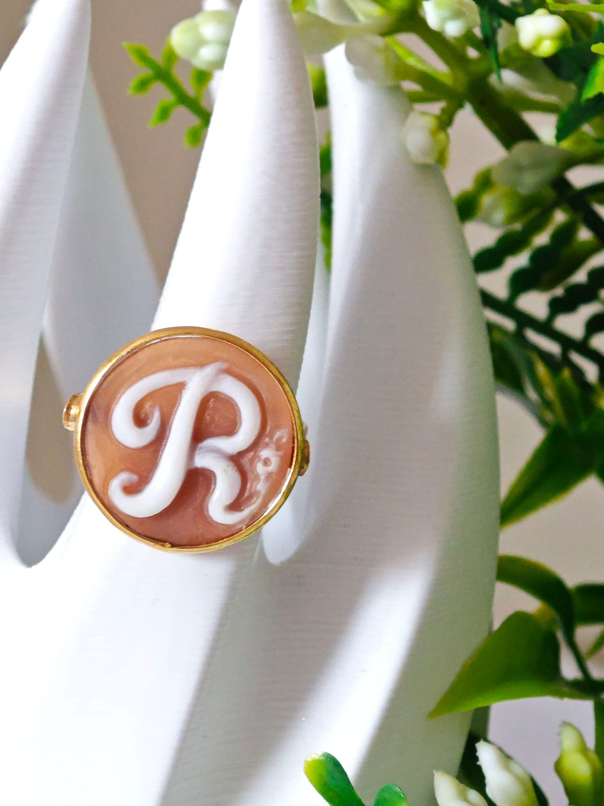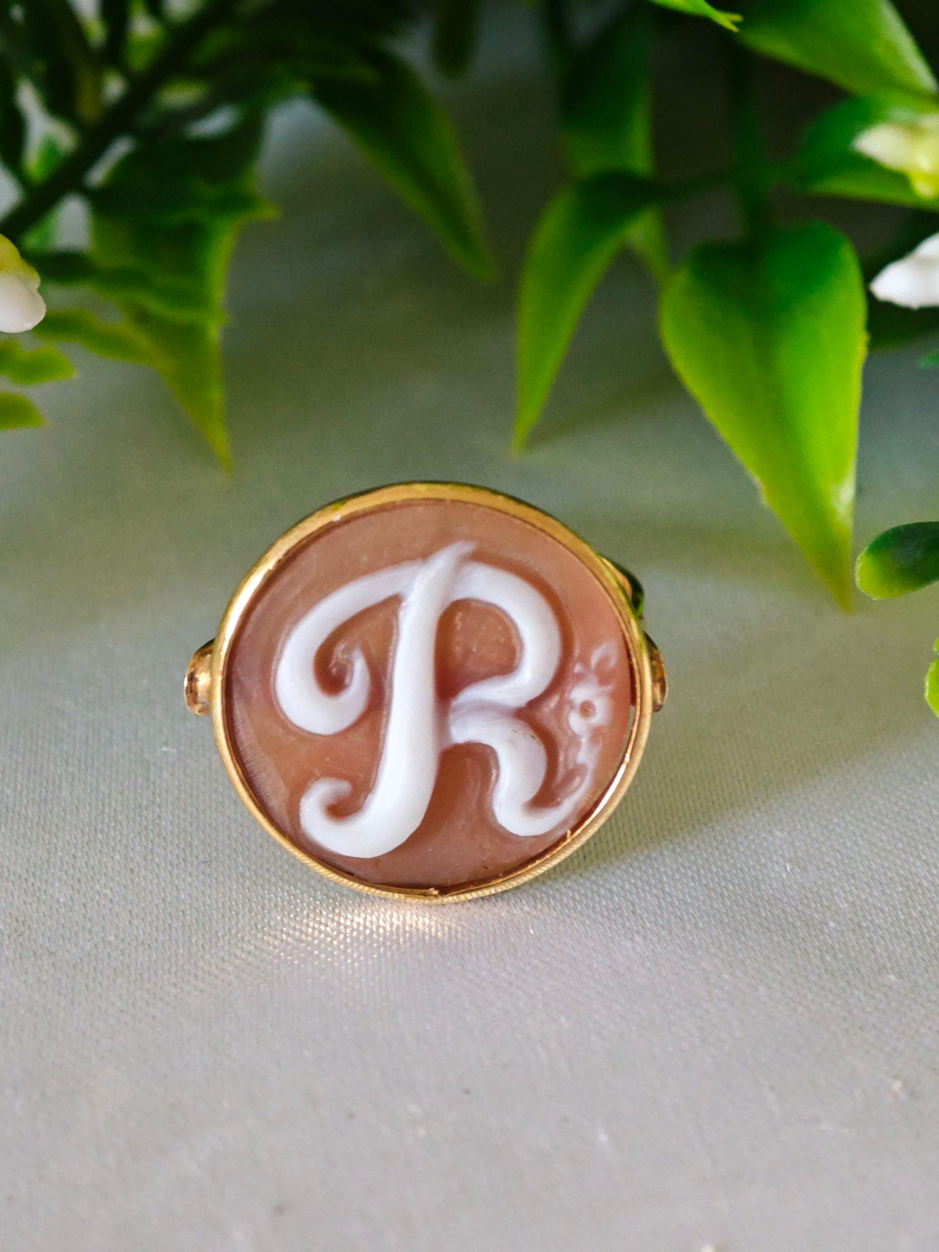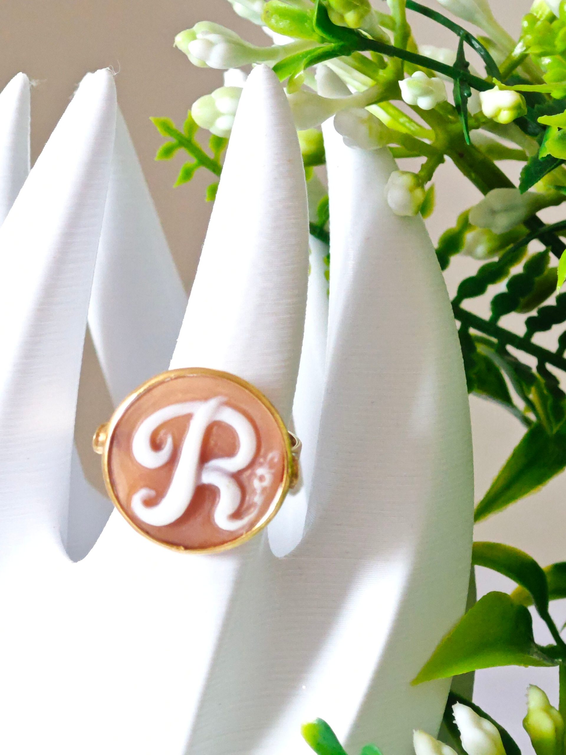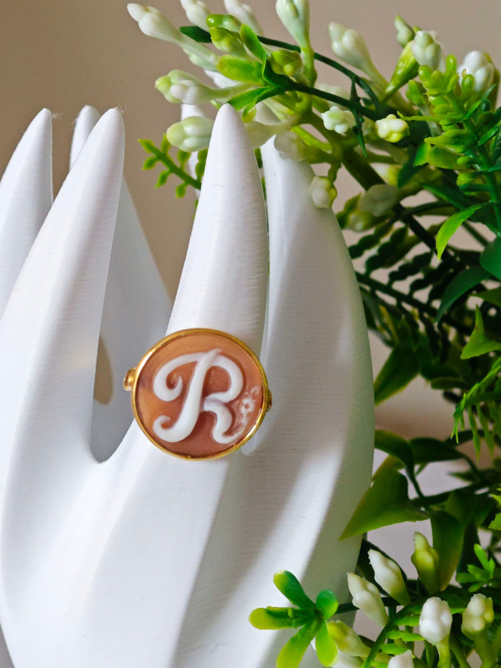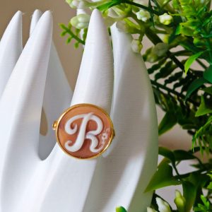 Anello artigianale in argento 925 placcato oro con cammeo autentico realizzato a mano in conchiglia sardonica a Torre del greco raffigurante iniziale del tuo nome, 20 mm diametro .