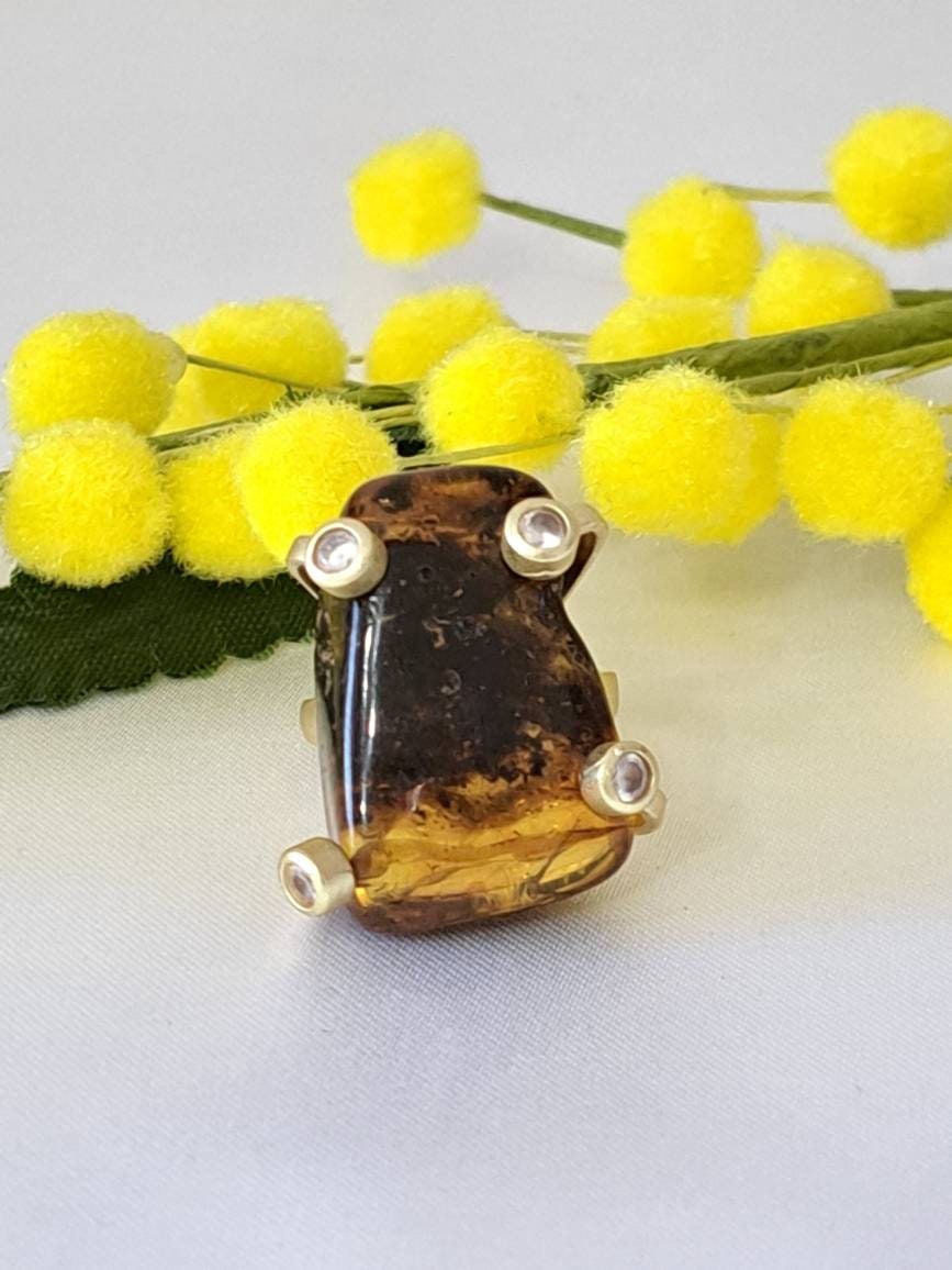 Anello maxi con ambra grezza naturale e base in ottone dorato con cristalli.