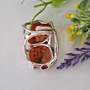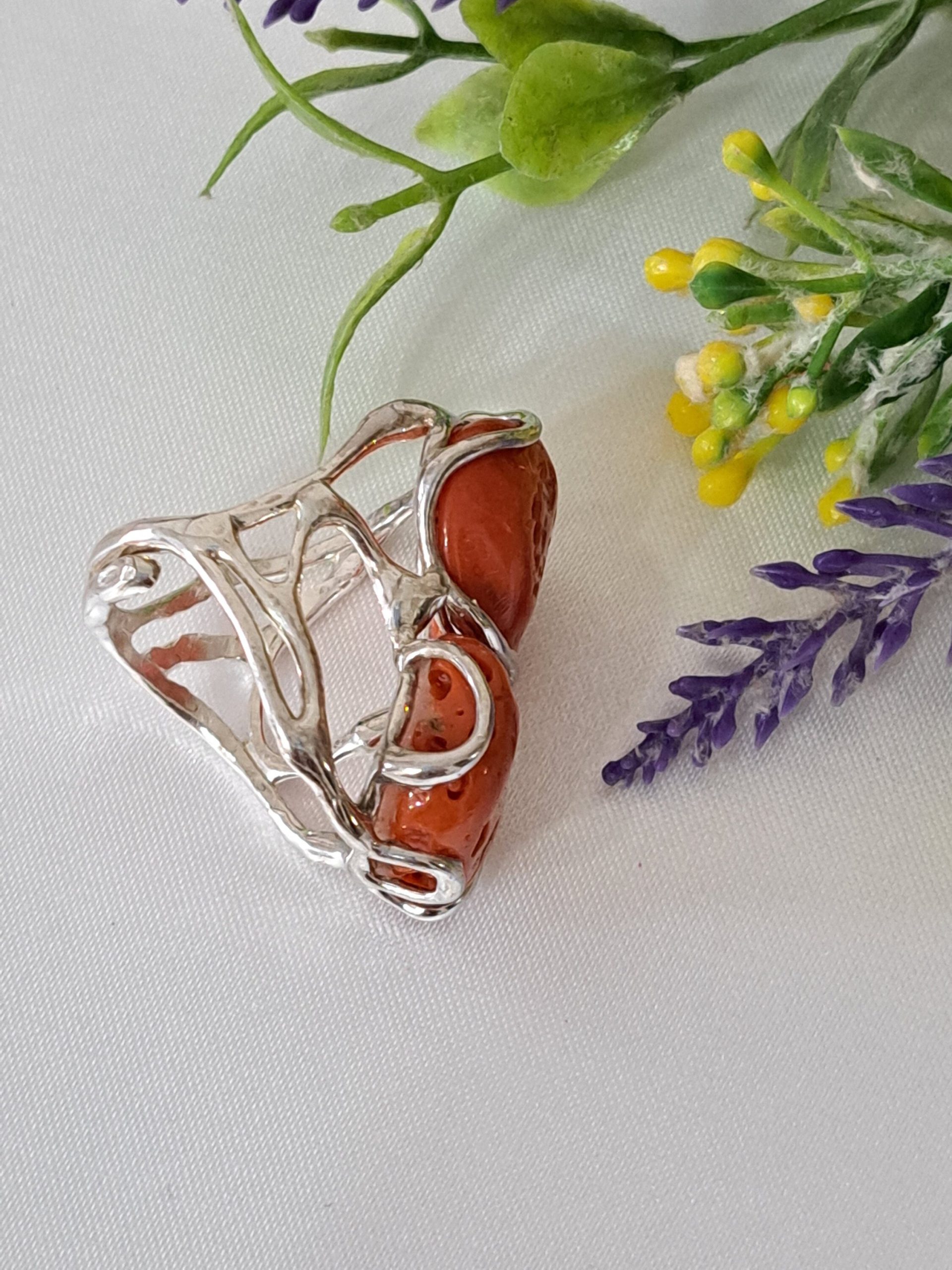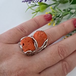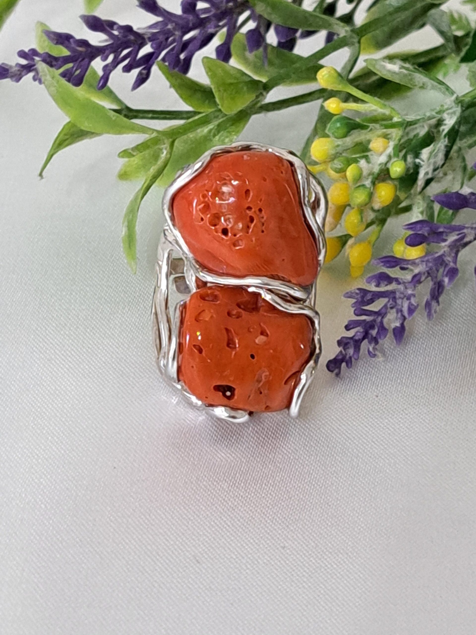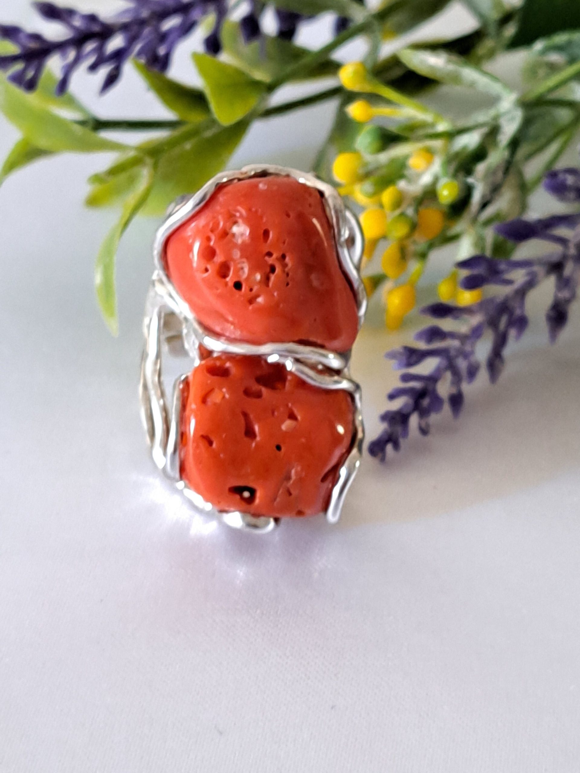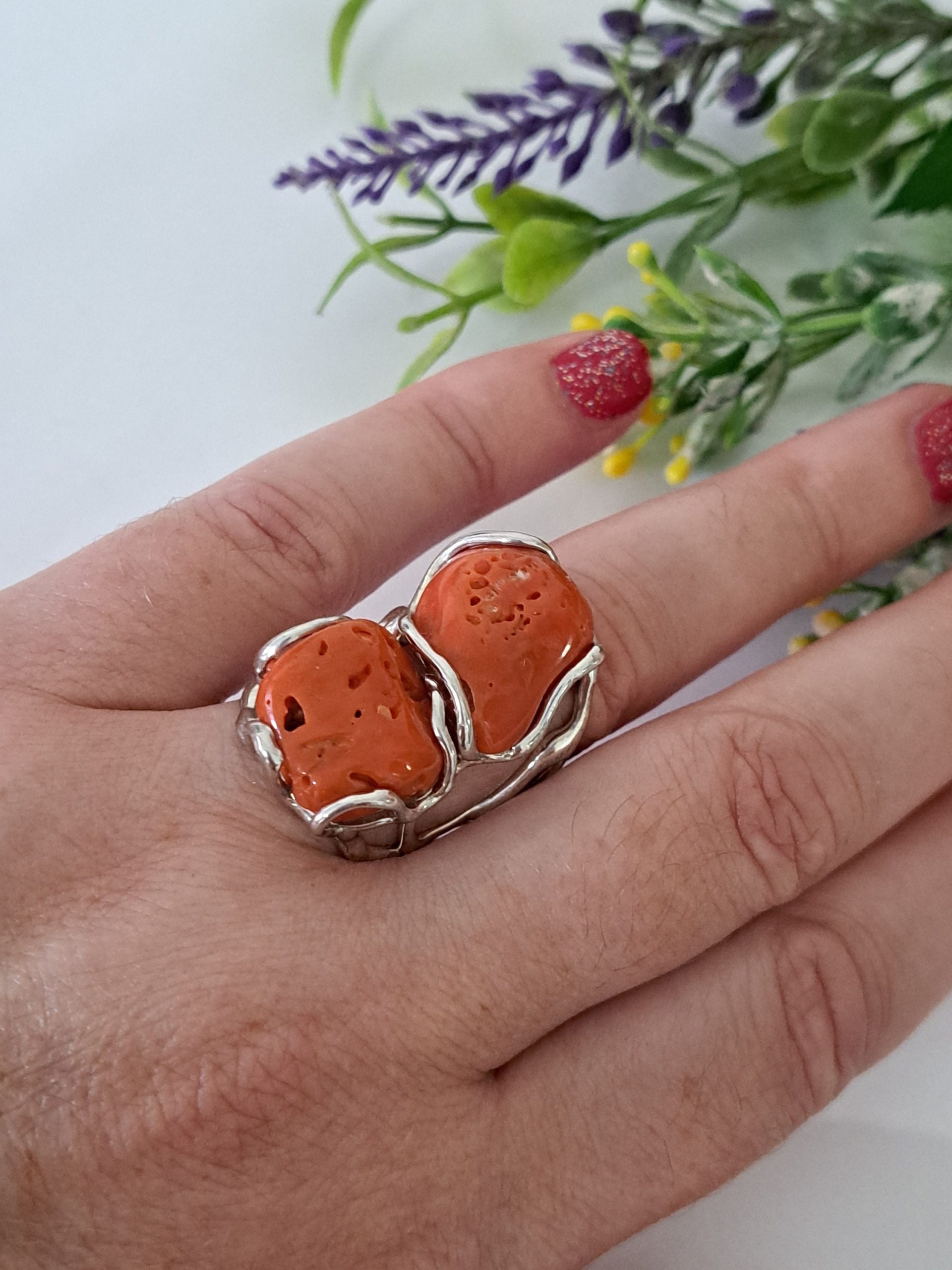 Anello maxi corallo rosso mediterraneo , anello argento 925 , gioielli italiani