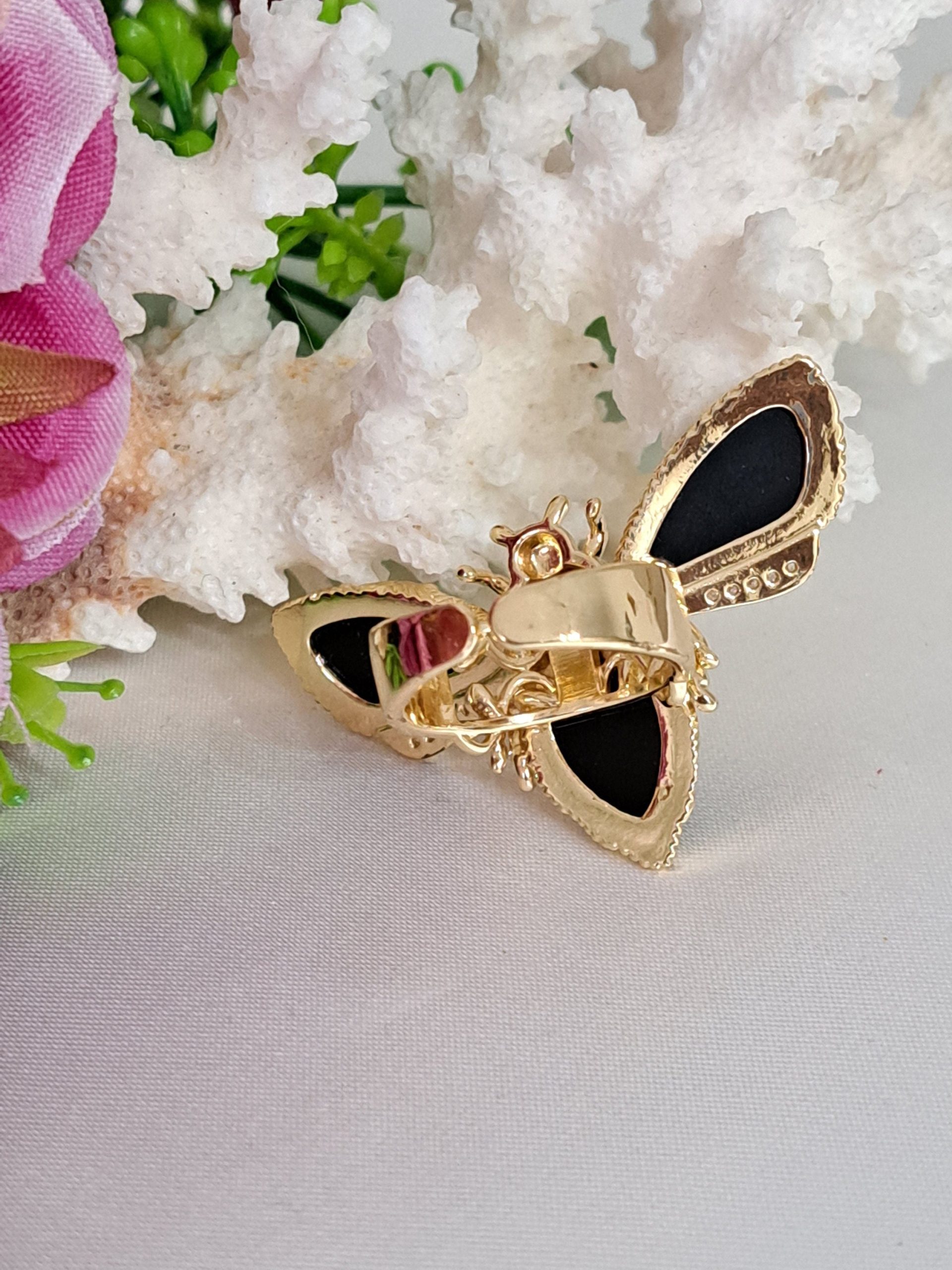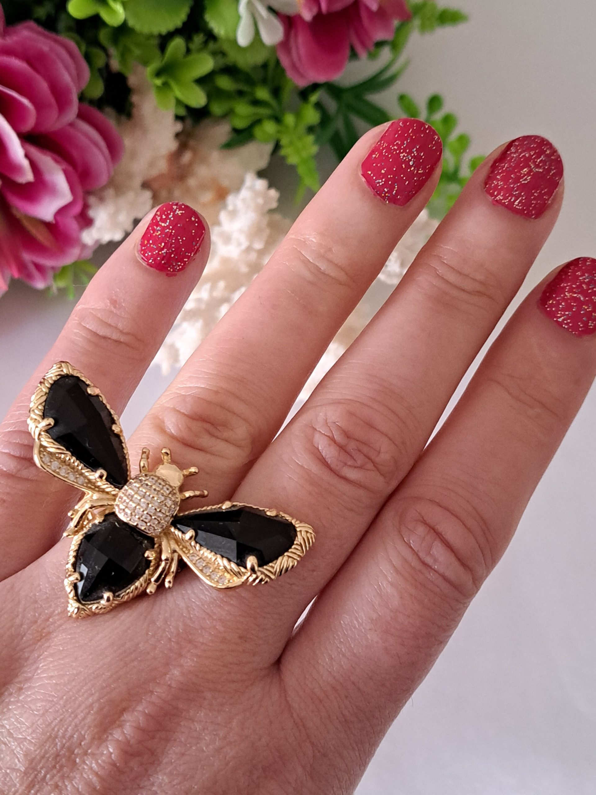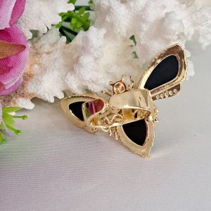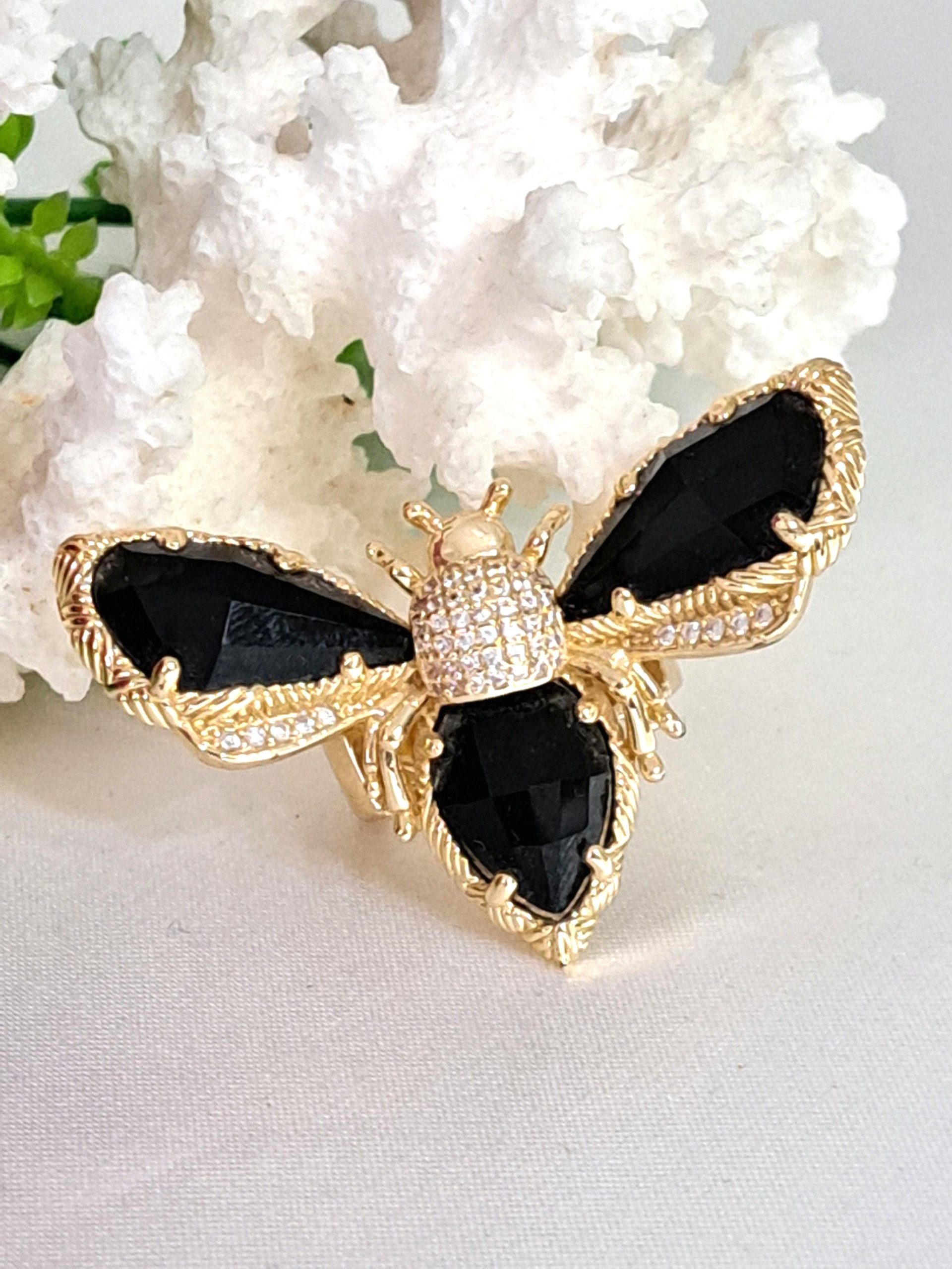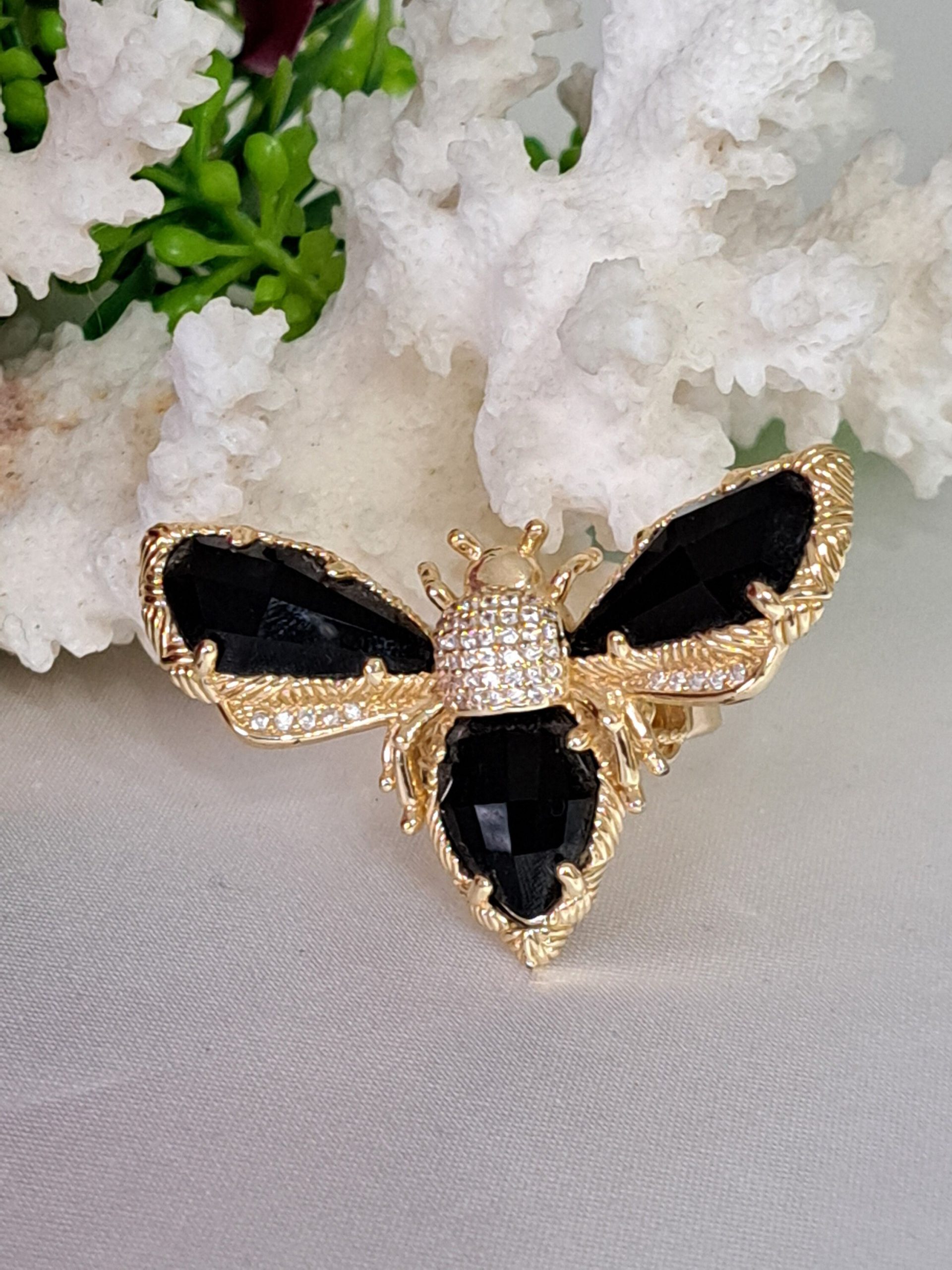 Anello maxi in ottone dorato a forma di farfalla con pietre quarzo nero e zirconi bianchi.
