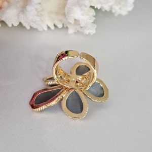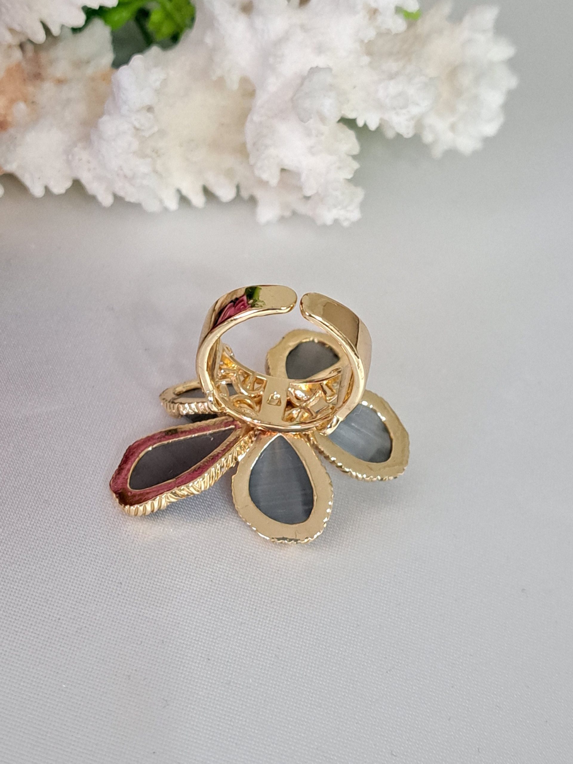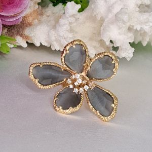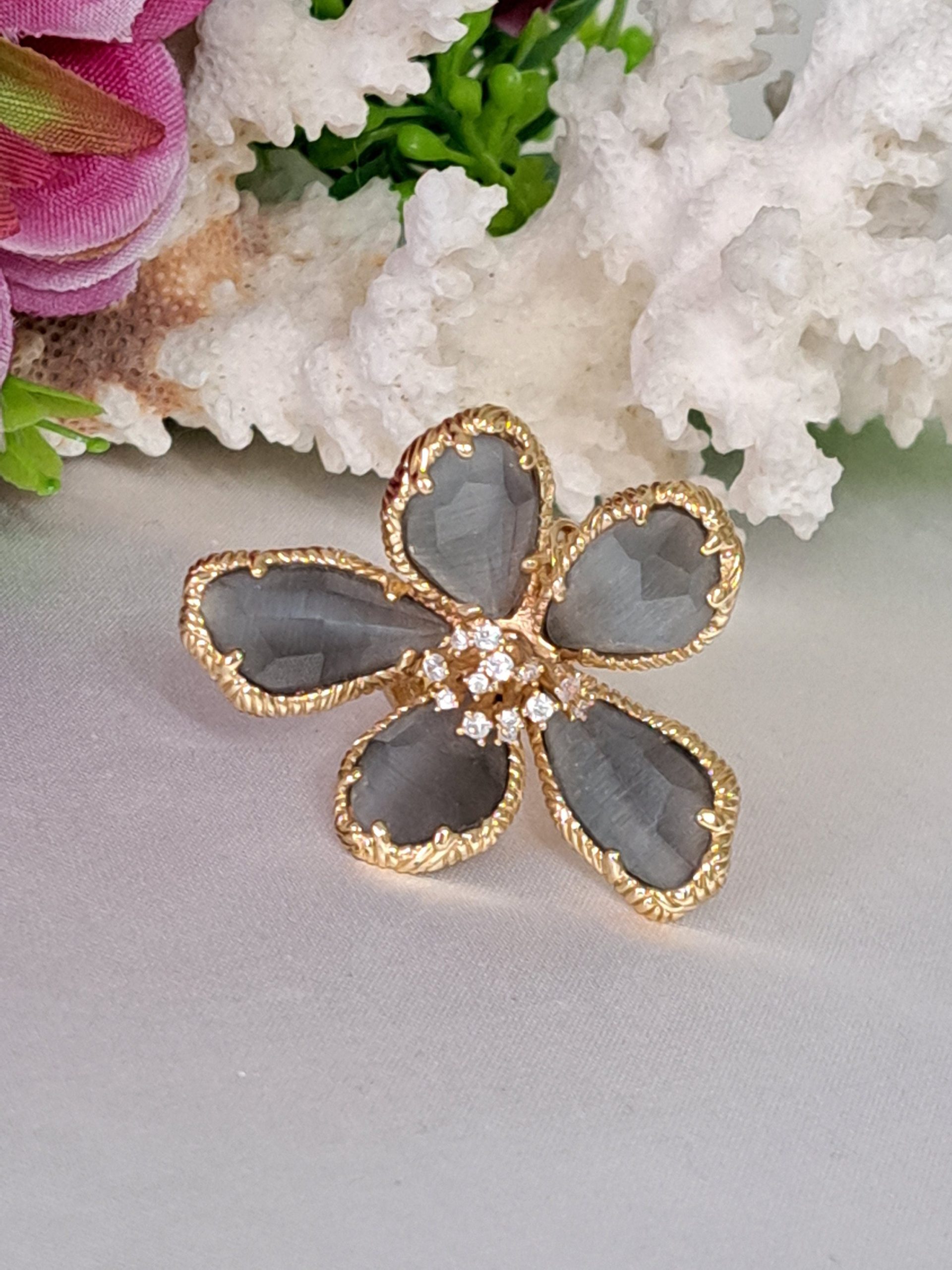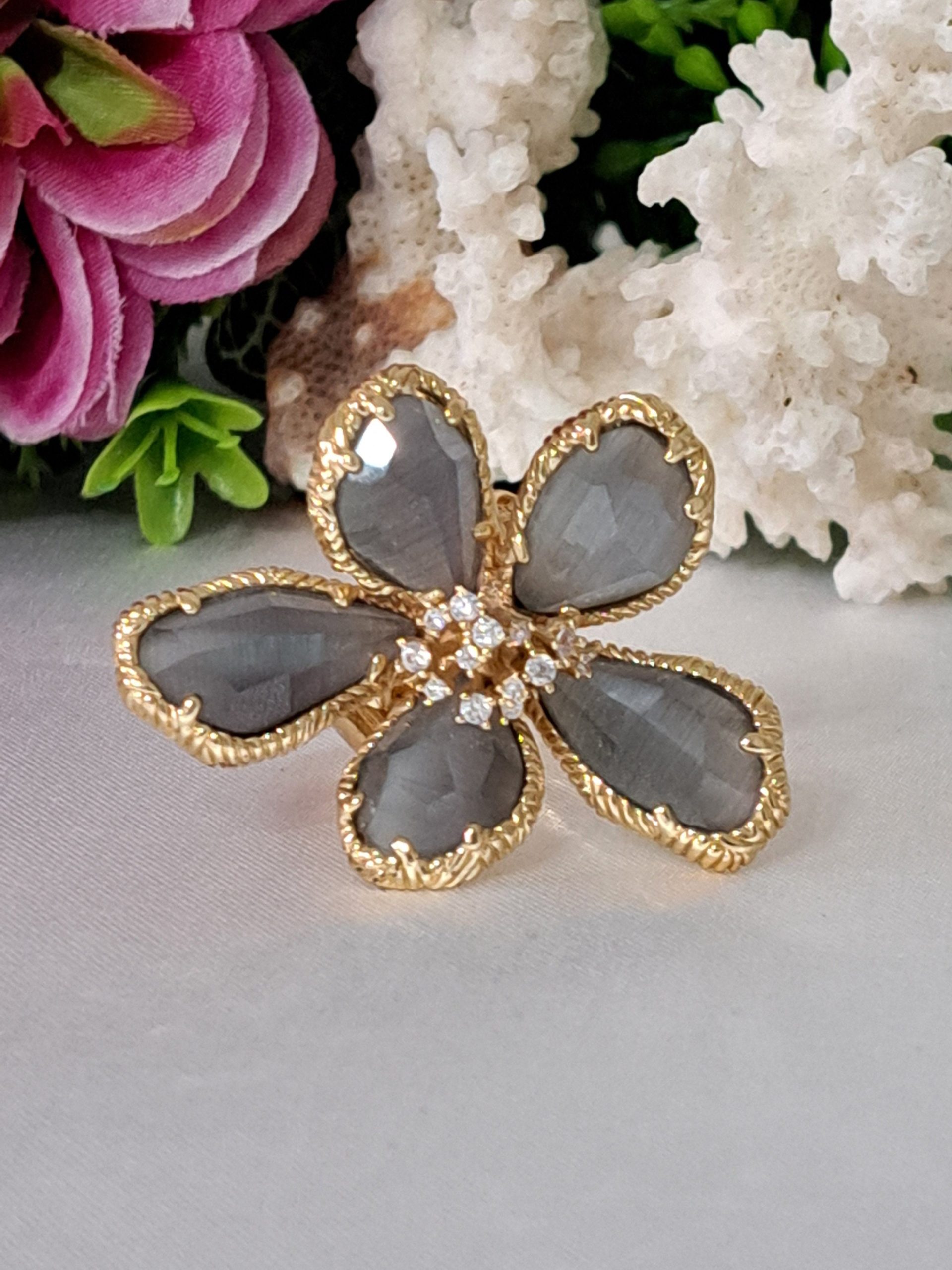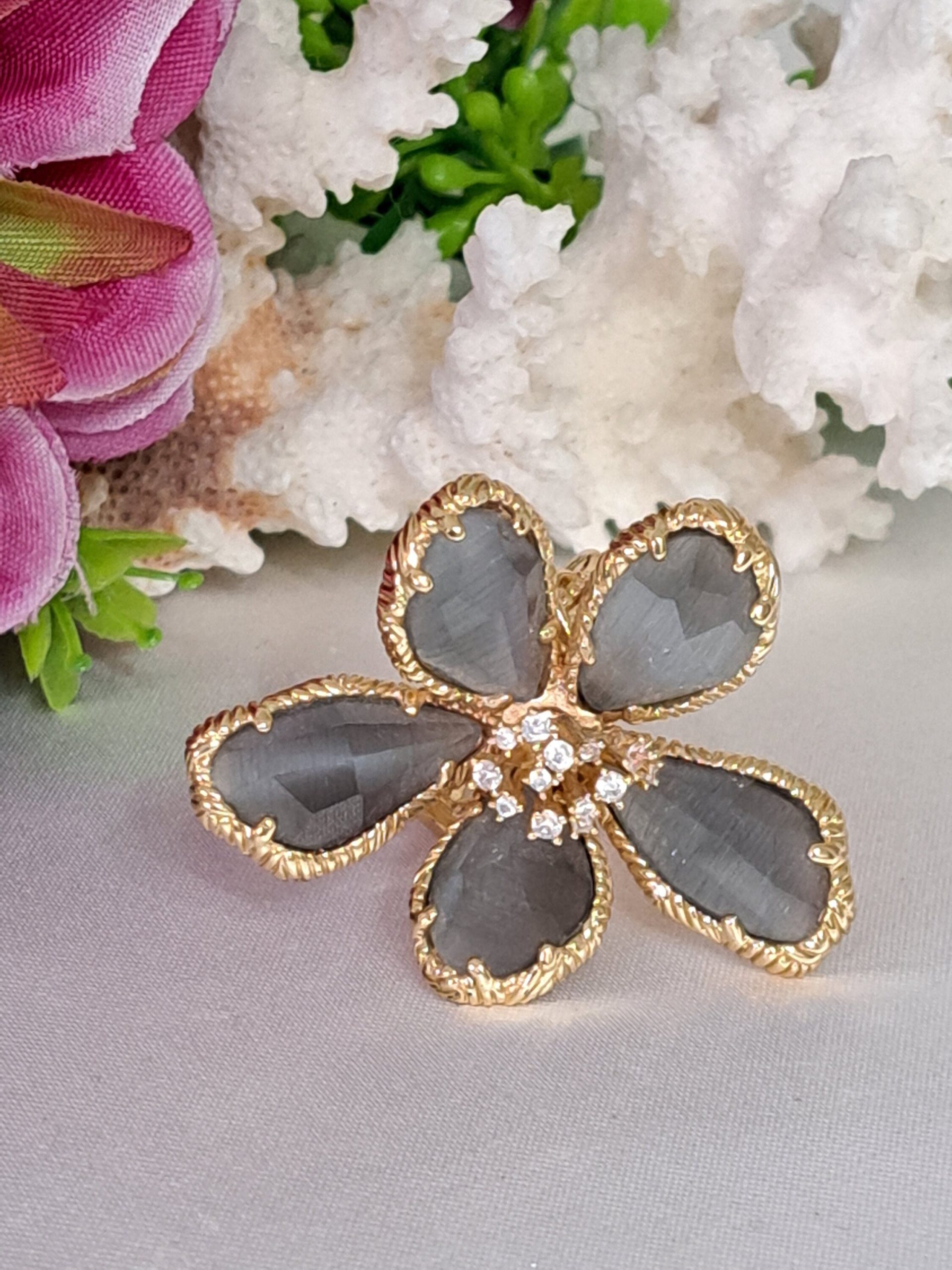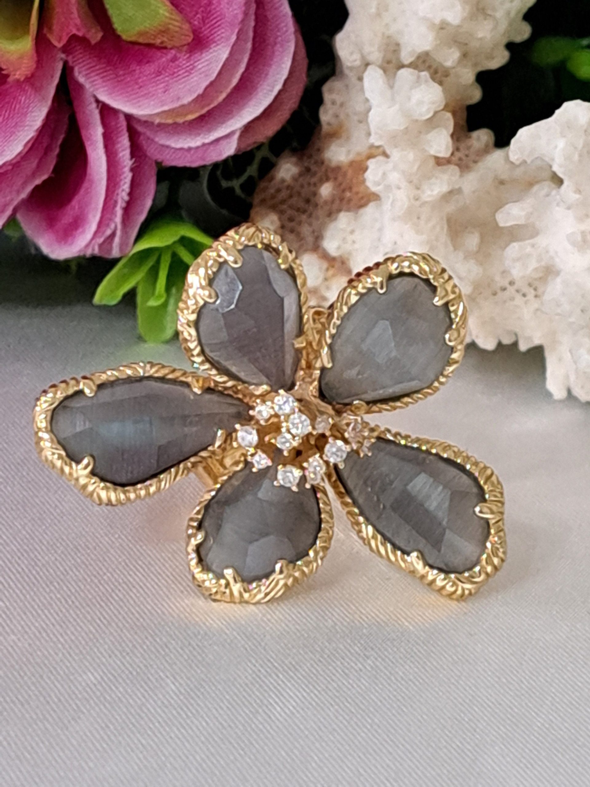 Anello maxi a forma di fiore realizzato in ottone dorato con pietre quarzo grigio occhio di gatto e zirconi bianchi , 4×3 cm dimensioni.