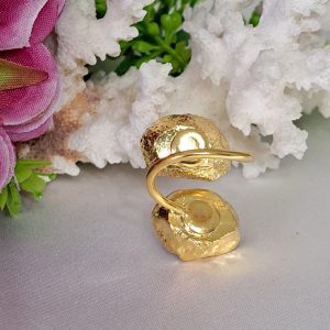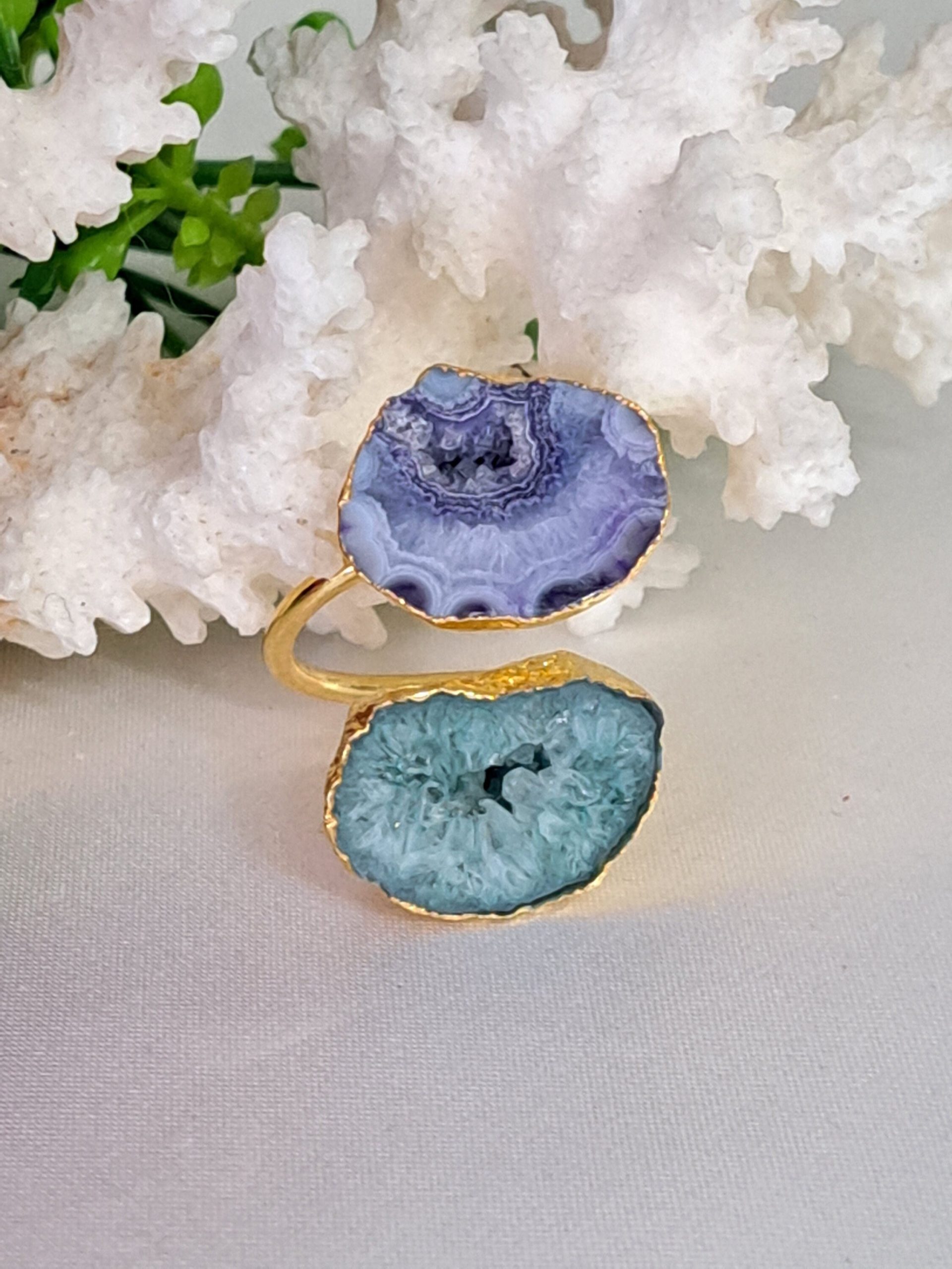 Anello artigianale maxi in ottone dorato con 2 pietre dure agata druzzy blu , 3,5×2 cm dimensioni .