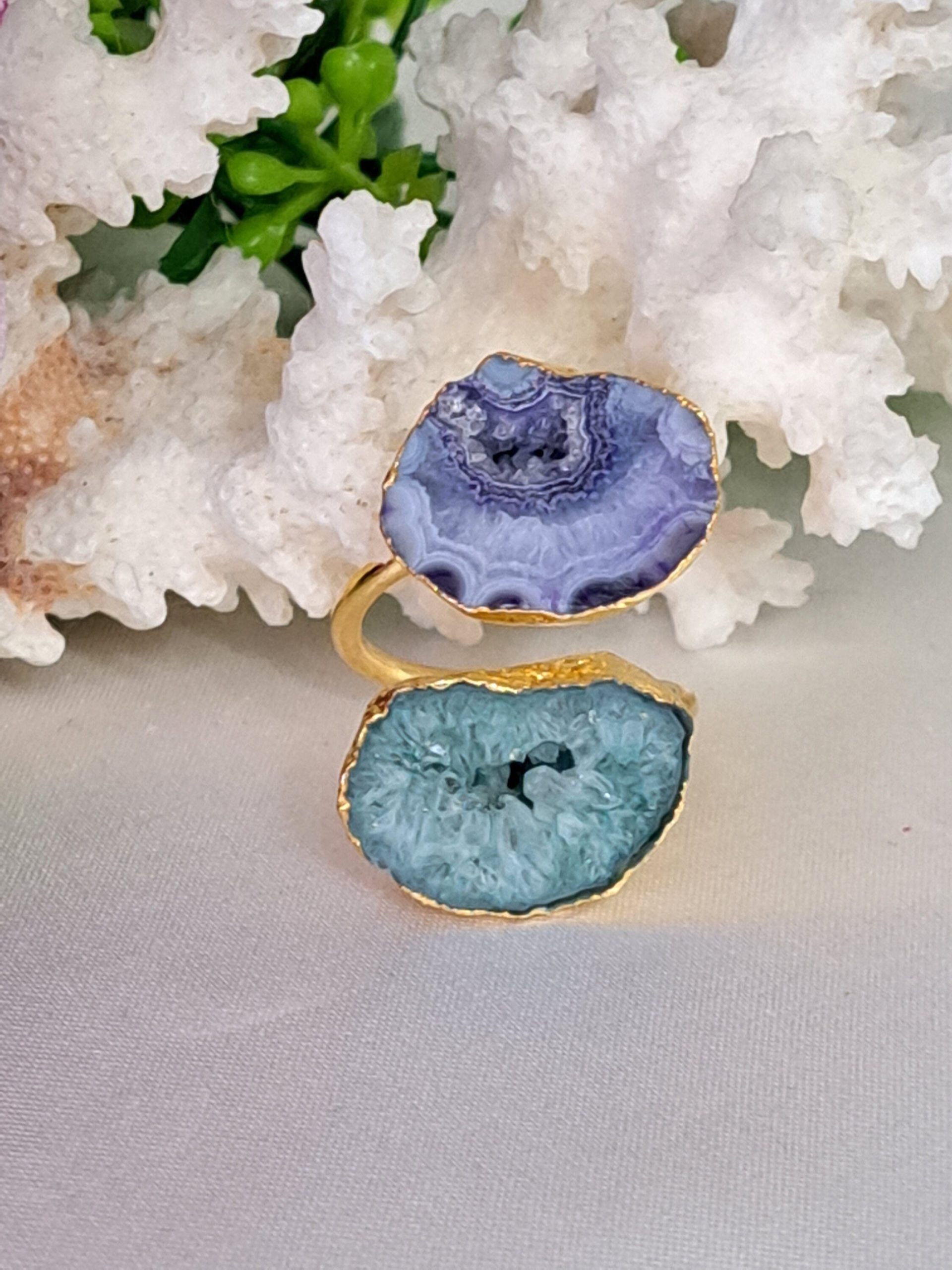 Anello maxi pietre dure agata druzzy , anello ottone